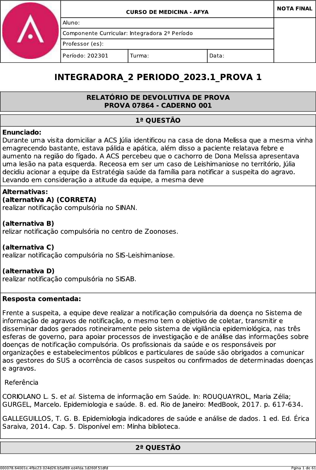 <p>NOTA FINAL CURSO DE MEDICINA AFYA A Aluno: Componente Curricular: Integradora Período Professor (es): Período: 202301 Turma: Data: INTEGRADORA2 PERIODO_2023.1_PROVA 1 RELATÓRIO DE DEVOLUTIVA DE PROVA PROVA 07864 CADERNO 001 QUESTÃO Enunciado: Durante uma visita domiciliar a ACS Júlia identificou na casa de dona Melissa que a mesma vinha emagrecendo bastante, estava pálida e apática, além disso a paciente relatava febre e aumento na região do fígado. A ACS percebeu que o cachorro de Dona Melissa apresentava uma lesão na pata esquerda. Receosa em ser um caso de Leishimaniose no território, Júlia decidiu acionar a equipe da Estratégia saúde da família para notificar a suspeita do agravo. Levando em consideração a atitude da equipe, a mesma deve Alternativas: (alternativa A) (CORRETA) realizar notificação compulsória no SINAN. (alternativa B) relizar notificação compulsória no centro de Zoonoses. (alternativa C) realizar notificação compulsória no SIS-Leishimaniose. (alternativa D) realizar notificação compulsória no SISAB. Resposta comentada: Frente a suspeita, a equipe deve realizar a notificação compulsória da doença no Sistema de informação de agravos de notificação, o mesmo tem o objetivo de coletar, transmitir e disseminar dados gerados rotineiramente pelo sistema de vigilância epidemiológica, nas três esferas de governo, para apoiar processos de investigação e de análise das informações sobre doenças de notificação compulsória. Os profissionais da saúde e os responsáveis por organizações e estabelecimentos públicos e particulares de saúde são obrigados a comunicar aos gestores do SUS a ocorrência de casos suspeitos ou confirmados de determinadas doenças e agravos. Referência CORIOLANO L. S. et al. Sistema de informação em Saúde. In: ROUQUAYROL, Maria Zélia; GURGEL, Marcelo. Epidemiologia e saúde. 8. ed. Rio de Janeiro: MedBook, 2017. p. 617-634. GALLEGUILLOS, T. G. B. Epidemiologia indicadores de saúde e análise de dados. 1 ed. Ed. Érica Saraiva, 2014. Cap. 5. Disponível em: Minha biblioteca. QUESTÃO Pgina 1 de 61</p><p>Enunciado: Uma mulher de 26 anos, nuligesta, vem ao consultório em virtude de irregularidade menstrual. Ela tem uma ciclo que varia de 15 a 90 dias e o sangramento menstrual dura até 14 dias. A paciente e seu esposo estão tentando conceber, mas tem sido difícil em virtude do seu ciclo menstrual tão irregular. Exame físico ginecológico é normal. ginecologista pede um exame para investigar a causa desse sangramento irregular com biópsia do endométrio, porém, o resultado do exame oapresenta alterações. A amostra de endométrio revela glândulas cheias de muco rico em carboidratos, estroma edematoso e arteríolas espiraladas tortuosas. Em que fase do gráfico abaixo a amostra de endométrio foi obtida? Progesterona LH 1° 5° 10° 15° 20° 25° A B C D E Dias do ciclo Fonte: Internet humana 23. html> Acesso em 29 de Março 2023 Alternativas: (alternativa A) A (alternativa B) C (alternativa C) B (alternativa D) (CORRETA) D Resposta comentada: No gráfico, letra D corresponde à segunda fase do cilco, pós ovulatória, também chamada fase secretora do ciclo, com ação da progesterona e fase na qual o endometrio está secretor com artérias espiraladas tortuosas, glândulas túrgidas e estroma edematoso. Referências: GUYTON, A.C. e Hall Tratado de Fisiologia Médica. Editora Elsevier. ed., 2017. QUESTÃO Pgina 2 de 61</p><p>Enunciado: Durante o estudo histológico da glândula tireoide, Maria observou dois tipos celulares compondo o folículo da tireoide e questionou o professor sobre o nome destas células e os hormônios sintetizados por elas. A alternativa abaixo que responde o questionamento da Maria é Alternativas: (alternativa A) (CORRETA) células foliculares, sintetizam T3 e T4; células parafoliculares, sintetizam calcitonina. (alternativa B) células foliculares, sintetizam somente T4; células parafoliculares, sintetizam somente T3. (alternativa C) células foliculares, sintetizam calcitonina; células parafoliculares, sintetizam T3 e T4. (alternativa D) células foliculares, sintetizam somente T3; células parafoliculares, sintetizam somente T4. Resposta comentada: Os folículos da tireoide constituem grande parte da glândula tireoide. A parede de cada folículo é constituída principalmente por células foliculares, cuja maioria se estende até o lúmen do folículo. As células foliculares produzem dois hormônios: tiroxina, também chamada de tetraiodotironina (T4), pois contém quatro átomos de iodo, e tri-iodotironina (T3), que contém três átomos de iodo. T3 e T4 juntas também são chamadas de hormônios da tireoide. Entre os folículos, podem ser encontradas algumas células chamadas de células parafoliculares ou células C. Elas produzem o hormônio calcitonina (CT). Referências: Tortora, Gerard, J. e Bryan Derrickson. Princípios de Anatomia e Fisiologia ed. Grupo GEN, 2016. (capítulo 18). QUESTÃO Pgina 3 de 61</p><p>Enunciado: Após analisar os fatores associados à percepção de qualidade de vida, foram obtidos os resultados apresentados na tabela 5: Tabela 5 - Resultados da análise de regressão logistica para fatores associados à percepção da qualidade de vida das idosas residentes do município de Guanambi (BA) no ano de 2016. Variáveis OR IC (95%) p-valor Renda familiar 1,62 1,16-2,26 0,005 Percepção da saúde 4,16 0,000 Lazer 2,03 0,004 Condições de moradia 3,10 0,000 Fonte: Tabela elaborada pelos autores. Legenda: OR: Odds IC: Intervalo de A partir da análise dos resultados do Odds ratio (OR) na tabela 5, avalie as asserções a seguir e a relação proposta entre I. A partir do resultado do OR apresentados na tabela, pode-se dizer que todas as variáveis (renda familiar, percepção de saúde, lazer e condições de moradia) estão associadas positivamente com a percepção da qualidade de vida das idosas. PORQUE II. A interpretação d