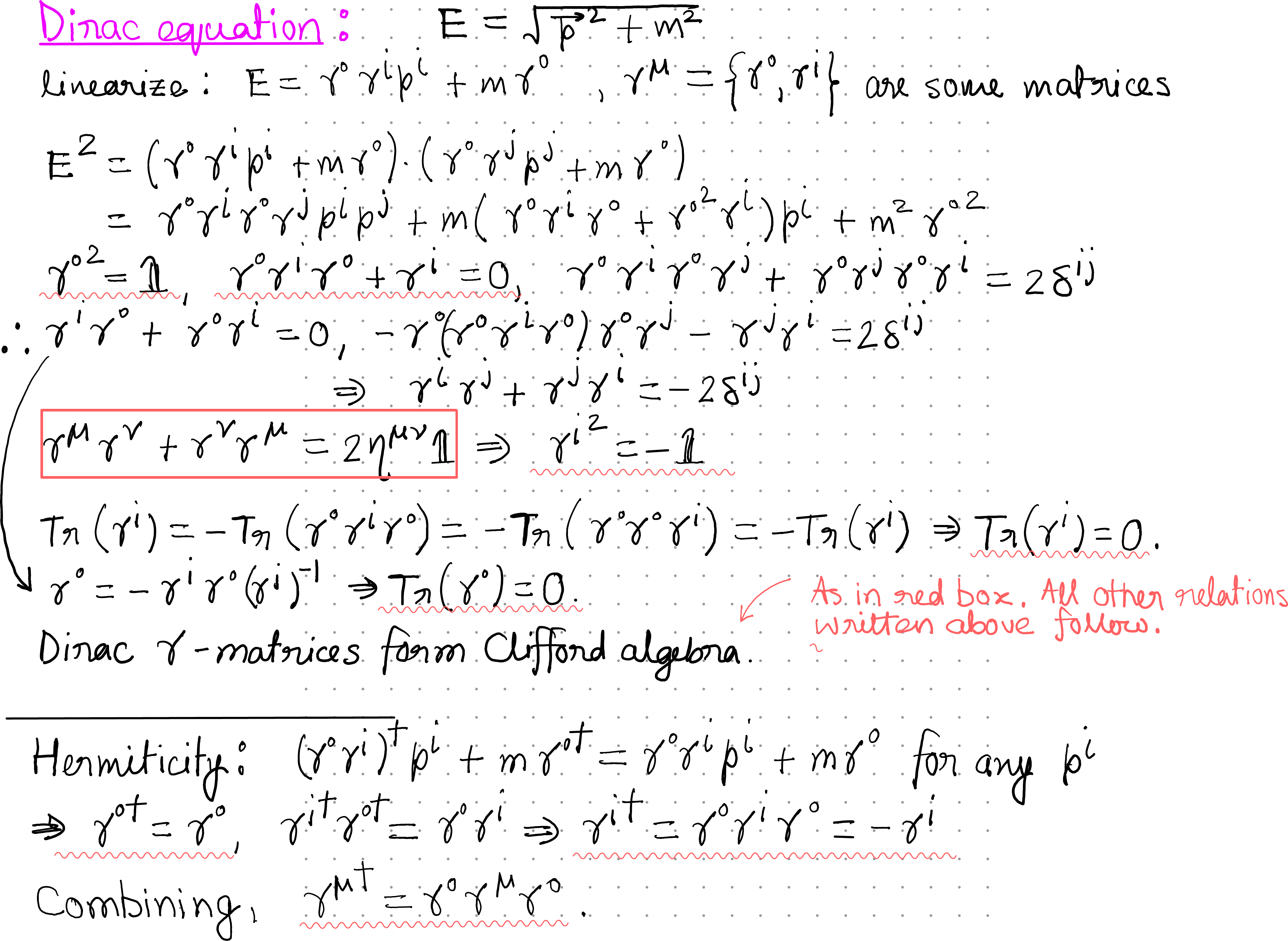 <p>Dirac equation: are some matrices = = = 28" + = - Tr (ri) = -Tr in red box. All other relations written above follow. Dirac form Clifford algebra Hermiticity: for any</p><p>(det = eigen values are +1, eigen values are Ii is sum of eigen Tr=0 # of tve eigen values = # of -ve eigen are even-dimensional In 4 spacetime dimensions we need 4 anticommuting cannot be realized as 2x2 matrices, canbe realized as 4x4 matrices. In lower space-time dimensions, 2x2 are realizable. Substitute It at - my =0. = / = multicomponent Next, construct a classical field theory whose field give Dinac</p><p>Dirac field : = Vary - = = O. (a) = results of w.r.t. Grassman variables - why Indentify, =0. -i - = Reality of action: complex of eqn conjugation (a). nothing but - + - - L - Grassman variables derivatives, not any</p><p>Classical description of Fermi/Dirac fields can be given in terms of anticommuting variables Grassmann variables Suitable for imposing quantization rules on anticommutators of canonical conjugate quantities leads Pauli exclusion principle Grasmann 1. = =0 2. F(Q, a function is defined by the polynourial (2) + (n) in Oin C (k) totally antisymmetric, ordinary complex numbers E.g. n=1, F(0) Cot / n=2, = + C2O2 + 3. Differentiation: the variable of differentiation must be brought to the left, take derivative. E.g. a O2) =</p><p>Forbids existence of terms quadratic in derivatives in the L leads to EOM, first order in derivatives etc. Lorentz Spin What transformation property should we assign to Dirac field the Dirac equation is Lorentz = = (ir dr -m) = (ir m) = - = M Y'(x') = Condition on L(A) that = (a) (a) L</p><p>Infinitesimal transformations, = around = - = = Ex.9. above condition is solved by 4 SMY matrices also satisfy Lorentz (as it should, for to be in Lorentz = group) Recall, - rit_ = = i,j=1,2,3 sist = Since are</p><p>- =0, as n diagonal matrix = = = commutes with and anticommutes with Using which one can show, Arguments: = = ~ = WMV SMV) L(1) YY (not is Lorentz invariant Prove Lorentz inv. of the Dirac Lagrangian L</p><p>Solutions of = = f(k) ) k= = For non-trivial k-m) =0 (a) (K+m) =0 = (1/2 = AB+BA =0 number We have squared by are both the sol's satisfy egn (a) ? YES go to rest - m)f(k) = = However, r° 4x4 matrix eigen values of each eigen value two independent eigen vectors (as = 1) (doubly degenerate) -ik.x ) k Wk</p><p>Dirac (K = us(k) = =0, Normalizations: = = (k) Spin N = N = for above S normalizations check 2 = +mr = r = 2w- = + k-m) = 0 Both sides of the spin sums act similary on all the basis spinors.</p><p>Fourier decomposition 2 + S=1,2 4(x) = 2 S=1,2 = 24 = Hamiltonian 4-L + = (ik) + = -ik.x Similarly, = =</p><p>Using the normalizations, I - Now promote as,bs, ast, as S=1,2 In order to avoid -ve energy eigen values, usual normal ordering will not work impose anti commutation (k), = br t all other anticommutators Normal ordered Hamiltonian b,b}; {a, vanish. N(H) I + bs t (k) ) S=1,2 = ast N = - etc Using above anticommutation relations show that (x°, ), B which is same as = is - Vacuum & excited states = 10> One particle as Pauli exclusion principle = O= 2 particles or 2 antiparticles with same spin and same momentum cannot be</p><p>U(1) charge, antiparticle a fixed real number - L has symmetry under e 4(x) continuous real parameter Infinitesimal O So = Noether current, = q Noether Q = 3 x 2 (ast S=1,2 have opposite = =-q Normal ordered that vacuum has zero charge and zero</p><p>Green's Feynman propagator factor is taken out from Green - = x2) 4x4 will be identified matrix as Feynman propagator SF = i.k. Fourier expansion Fourier a matrix (i - I SF(k)e -ik = - ik. 11 4 (ir - SF(k)e (x1-x2) K -m (K = i II SF(k) = 2 (k = i (K + m) SF(k) = i(K+m) which has poles take Feynman prescription along the real at end E integration contour = i L ) the last expression is written for simplicity</p><p>this choice of SF (x, = (x2) Ex.12 where time ordered product for fields is defined as need = S B xi > x2 spin sums - x2 > xi (xn) T 0> correlators vanish unless Bm consequence of charge unless there are equal number conservation of Y's and unless n=m (x1) O= Wicks theorem applies to free fermions, with the difference that a sign must be included infront of each term, according to the number of anticommutations required to bring the contracted field's next to each other = - S +</p><p>Weyl representation of Dirac matrices are the 2x2 ( ) = Pauli matrices ) 1,2,3 12x2 O2x2 O2x2 = become block diagonal they form a reducible rep. of Lorentz algebra = = 1/2 ) 523 1/2 = 1/2 02) Angular momenta Eijk 1/2 = 1/2 J3 eigen values are each doubly degenerate two spin 1/2 particles General comments on Lorentz not restricted to Dirac spinor rep. [MMV = i = i Eijk angular momentum Eijk Kk algebra i Eijk Jk</p><p>1/2 Yi 1/2 whose physical significance is obscure Eijk = two different SU(2) addition of "angular momenta".</p>