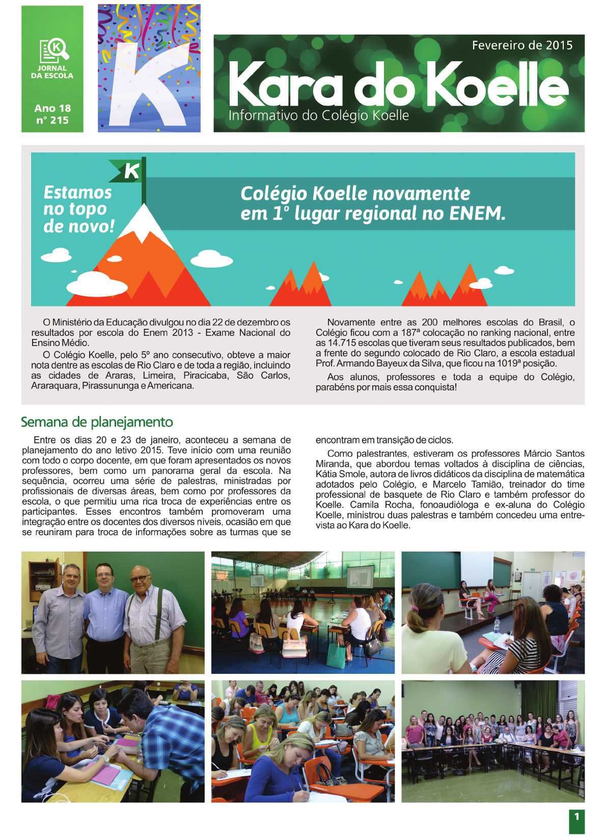 <p>K Fevereiro de 2015 JORNAL DA ESCOLA Kara do Koelle Ano 18 n° 215 Informativo do Colégio Koelle K Estamos Colégio Koelle novamente no topo em 1° lugar regional no ENEM. de novo! Ministério da Educação divulgou no dia 22 de dezembro os Novamente entre as 200 melhores escolas do Brasil, o resultados por escola do Enem 2013 Exame Nacional do Colégio ficou com a colocação no ranking nacional, entre Ensino Médio. as 14.715 escolas que tiveram seus resultados publicados, bem Colégio Koelle, pelo 5° ano consecutivo, obteve a maior a frente do segundo colocado de Rio Claro, a escola estadual nota dentre as escolas de Rio Claro e de toda a região, incluindo Prof. Armando Bayeux da Silva, que ficou na posição. as cidades de Araras, Limeira, Piracicaba, São Carlos, Aos alunos, professores e toda a equipe do Colégio, Araraquara, Pirassununga e Americana. parabéns por mais essa conquista! Semana de planejamento Entre os dias 20 e 23 de janeiro, aconteceu a semana de encontram em transição de ciclos. planejamento do ano letivo 2015. Teve início com uma reunião Como palestrantes, estiveram os professores Márcio Santos com todo o corpo docente, em que foram apresentados os novos Miranda, que abordou temas voltados à disciplina de ciências, professores, bem como um panorama geral da escola. Na Kátia Smole, autora de livros didáticos da disciplina de matemática sequência, ocorreu uma série de palestras, ministradas por adotados pelo Colégio, e Marcelo Tamião, treinador do time profissionais de diversas áreas, bem como por professores da professional de basquete de Rio Claro e também professor do escola, o que permitiu uma rica troca de experiências entre os Koelle. Camila Rocha, fonoaudióloga e ex-aluna do Colégio participantes. Esses encontros também promoveram uma Koelle, ministrou duas palestras e também concedeu uma entre- integração entre os docentes dos diversos níveis, ocasião em que vista ao Kara do Koelle. se reuniram para troca de informações sobre as turmas que se 1</p><p>Adoção de iPads em sala de aula bém parceria com a empresa Mosyle, que provê uma solução completa de ambiente virtual de aprendizagem em tablets e ge- Em função de todo o sucesso com a adoção do uso de tablets renciamento de dispositivos móveis. nas séries do Ensino Médio, a partir de 2015, o Colégio Koelle Com todas essas inovações, o Colégio Koelle assegura a tran- faz mais uma grande inovação em sua proposta pedagógica: a sição de sua proposta de ensino em sintonia com as novas tecno- adoção do iPad para todas as séries do Ensino Médio e também logias de forma consistente, contribuindo ainda mais com a sólida no Fundamental I. formação de seus alunos. Com uma parceria com o grupo Abril Educação, todos os livros didáticos adotados na série do Ensino Médio passam a ter formato digital, sendo que os alunos não mais utilizarão suas Olimpíada de Matemática da Unicamp versões impressas. Além da redução considerável no peso do Entre os meses de material didático, essa novidade agrega uma série de recursos maio e outubro de 2014, que aperfeiçoam ainda mais o processo de ensino, como a aconteceu a Olim- visualização de vídeos e animações, além de interação em tempo píada de Matemática da real entre alunos e professo- Unicamp (OMU), da qual res. Os alunos das e vários alunos do Colégio séries também utilizarão participaram. No Nível tablets em sala de aula, que Beta, que reúne estudan- passam a receber materiais tes do Ensino Médio de desenvolvidos pelos professo- todo o país, destacou-se Matematica da Unicamp res do Colégio. o aluno Rafael Pastre, Para o Ensino Fundamen- que conquistou a meda- tal I, de a anos, a esco- lha de ouro. la agora produz o seu próprio A cerimônia de pre- livro didático da disciplina de miação aconteceu no dia OMU Organizado ciências, em versão digital. 06 de dezembro, no Ins- Esse material já vem sendo tituto de Matemática da desenvolvido pelas professo- Seiam Bem-vindos Unicamp. Rafael esteve ras desde meados de 2014, e presente, acompanhado Provas de 2014 Agosto os alunos o utilizarão por meio de sua família, do seu ori- 06 de de de um laboratório móvel de entador, o professor Mar- iPads, que estará a disposição celo Badin e do professor dos alunos do Fundamental I. Melão, coordenador do Além da utilização de recur- Ensino Médio. SOS tecnológicos até então inexistentes, essa inovação permite também que sejam abordados temas regionais, inexistentes em livros didáticos utilizados em âmbito nacional. Para viabilizar esses projetos, a escola realizou significativos investimentos, fornecendo um tablet para cada professor, capaci- tações e aquisição de equipamentos de informática. Firmou tam- SEU CAMINHO SEM FRONTEIRAS Centro de Idiomas Francês Alemão Espanhol 19.3522.4407 Rua 4, 1790 Centro www.cikrioclaro.com.br</p><p>FEBRACE 2015 Olimpíada Brasileira de Física criatividade e inovação FEBRACE 13 feira brasileira de ciências e engenharia Os alunos dos 9°s anos do Fundamental, lan Victor Rubini lan Kim Rodrigues e Pedro Henrique de Siqueira orientados pelos professores Joel Vieira (ciências Koelle) e Mauro Silva Ruiz (mestrado profissional em gestão ambiental e sustentabilidade UNINOVE), um trabalho científico que foi selecionado para participar da FEBRACE 2015 Feira Brasileira de Ciências e Engenharia. trabalho dos intitulado "Conscientização pública so- bre o consumo de água: uma análise da situação atual em Rio Claro visando à proposição de medidas de conservação", procura Diversos alunos do Colégio participaram das olimpíadas de diagnosticar, a partir do registro de constatações e evidências, a que aconteceram ao longo do ano de 2014. No dia 12 de de- conscientização pública sobre o consumo de água em Rio Claro, zembro. foram divulgados os resultados da Olimpíada Brasileira no atual cenário de para que sejam desenvolvidas de