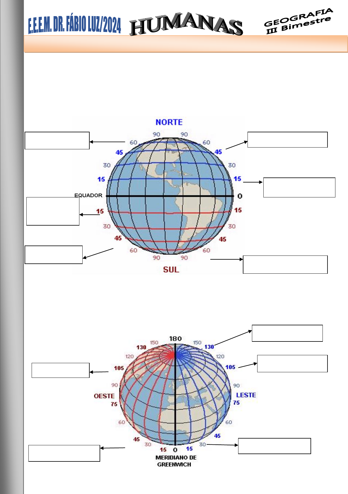 <p>G</p><p>EO</p><p>G</p><p>R</p><p>A</p><p>FI</p><p>A</p><p>–</p><p>1</p><p>º</p><p>A</p><p>N</p><p>O</p><p>PROFESSORA. Maria de Nazaré Oliveira</p><p>DIRETORA: ALUNO:__________________________________DATA: ____/____/2024 TURMA:______</p><p>01) É um conjunto de linhas imaginárias traçadas sobre o globo que permitem localizar qualquer ponto na</p><p>superfície terrestre.</p><p>A- Coordenadas geográficas B- Fusos Horários C- Zonas climáticas D- Zonas térmicas</p><p>02) Identifique as latitudes do globo abaixo.</p><p>03) Identifique as longitudes do globo abaixo.</p><p>G</p><p>EO</p><p>G</p><p>R</p><p>A</p><p>FI</p><p>A</p><p>–</p><p>1</p><p>º</p><p>A</p><p>N</p><p>O</p><p>PROFESSORA. Maria de Nazaré Oliveira</p><p>DIRETORA: ALUNO:__________________________________DATA: ____/____/2024 TURMA:______</p><p>04) Localize as coordenadas geográficas indicadas no mapa</p><p>A: Latitude:__________ B- Latitude: __________ C- Latitude:_________ D- Latitude:</p><p>Longitude:___________ Longitude: __________ Longitude:___________ Longitude:</p><p>05- Qual continente partes está localizado 10° latitude norte e 20° longitude Leste?</p><p>______________________________________________________________________________________</p><p>06- Qual continente partes está localizado 20° latitude sul e 140° longitude Leste?</p><p>________________________________________________________________________________________</p><p>07- Complete a imagem com as zonas climáticas.</p><p>08- Quais são os principais paralelos que determinam as zonas climáticas da Terra?</p><p>______________________________________________________________________________________</p><p>G</p><p>EO</p><p>G</p><p>R</p><p>A</p><p>FI</p><p>A</p><p>–</p><p>1</p><p>º</p><p>A</p><p>N</p><p>O</p><p>PROFESSORA. Maria de Nazaré Oliveira</p><p>DIRETORA: ALUNO:__________________________________DATA: ____/____/2024 TURMA:______</p><p>09- Qual zona predomina no continente africano? _______________________________________</p><p>10- Qual zona predomina no continente europeu e asiático? ______________________________</p>