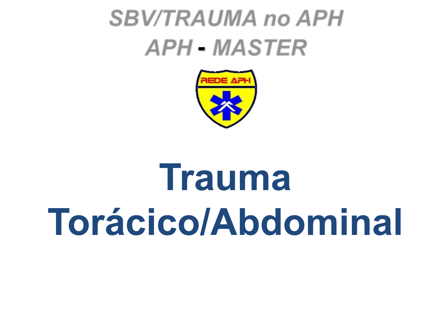 <p>SBV/TRAUMA no APH</p><p>APH - MASTER</p><p>Trauma</p><p>Torácico/Abdominal</p><p>CATALÃO – AGOSTO 2018</p><p>Trauma Torácico</p><p>Enfermeiro Paulo Roberto</p><p>Especialista</p><p>OBJETIVOS</p><p>• Descrever os sinais e sintomas, a fisiopatologia e</p><p>o tratamento das seguintes lesões torácicas:</p><p>• Fratura de costelas</p><p>• Tórax instável</p><p>• Pneumotórax (simples, Aberto e fechado)</p><p>• Pneumotórax hipertensivo</p><p>• Hemotórax</p><p>• Contusão cardíaca</p><p>• Tamponamento cardíaco</p><p>• Ruptura traumática de aorta</p><p>• Ruptura de diafragma</p><p>APH-MASTER</p><p>APH-MASTER</p><p>APH-MASTER</p><p>Epidemiologia</p><p>• 1 de cada 4 mortes por trauma no MUNDO;</p><p>• Prevalência do sexo masculino, na faixa etária de 20</p><p>a 29 anos;</p><p>• 44% de traumas fechados e 56% de traumas</p><p>penetrantes;</p><p>• Sendo que, dentro destes, 78,6% e por arma branca</p><p>e 21,4% por arma de fogo.</p><p>APH-MASTER</p><p>Anatomia torácica</p><p>APH-MASTER</p><p>Anatomia torácica</p><p>Diafragma</p><p>Mediastino</p><p>Pleura Visceral</p><p>Pleura Parietal</p><p>Espaço Pleural</p><p>Pulmão Esquerdo Pulmão Direito</p><p>Traquéia</p><p>APH-MASTER</p><p>Fisiopalogia</p><p>Hipercarbia</p><p>Hermorragia Intensa</p><p>oferta de O2</p><p>Hipoventilação</p><p>Alt. Ventilação/Perfusão</p><p>Hipóxia Tecidual</p><p>Acidose</p><p>APH-MASTER</p><p>Como é que o</p><p>trauma de tórax</p><p>interfere nas trocas</p><p>gasosas?</p><p>Endotélio</p><p>capilar</p><p>Alvéolo</p><p>Epitélio</p><p>alveolar</p><p>Tecido conjuntivo</p><p>CO2</p><p>O2O2</p><p>APH-MASTER</p><p>Trauma de Tórax</p><p>Qualquer lesão que atinge a região torácica</p><p>provocada por forças externas e pode ser dividido</p><p>em duas categorias, dependendo do mecanismo:</p><p>• Fechado</p><p>• Penetrante</p><p>APH-MASTER</p><p>Trauma de Tórax</p><p>Podem ser ocasionados pelas mais diversas</p><p>causas, como por exemplo:</p><p>• Acidentes Automobilísticos</p><p>• Quedas</p><p>• Agressão por armas de Fogo</p><p>• Agressão por armas Brancas</p><p>• Objetos encravados</p><p>• Fratura de costelas</p><p>• Tórax instável</p><p>• Pneumotórax (simples, Aberto e fechado)</p><p>• Pneumotórax hipertensivo</p><p>• Hemotórax</p><p>• Contusão cardíaca</p><p>• Tamponamento cardíaco</p><p>• Ruptura traumática de aorta</p><p>• Ruptura de diafragma</p><p>APH-MASTER</p><p>APH-MASTER</p><p>Trauma de Tórax</p><p>AVALIAÇÃO PRIMÁRIA</p><p>A Vias aéreas / Coluna cervical</p><p>B Respiração / Ventilação</p><p>C Circulação</p><p>D Exame neurológico</p><p>E Exposição / Ambiente</p><p>APH-MASTER</p><p>Fratura de Costela</p><p>• Dano torácico mais comum (35-40% das</p><p>vítimas de trauma de tórax);</p><p>• Diagnóstico:</p><p>• Suspeita clínica</p><p>• Rx: extensão do dano</p><p>• TC: fraturas + danos intra-torácicos</p><p>APH-MASTER</p><p>Tórax Instável</p><p>Fratura de duas ou mais costelas adjacentes em dois</p><p>pontos distintos.</p><p>APH-MASTER</p><p>Tórax Instável</p><p>Diagnóstico</p><p>• Presença de movimento paradoxal (inspeção).</p><p>• Creptação de arcos costais à respiração, com dor</p><p>intensa (palpação).</p><p>• Rx de tórax.</p><p>• Tomografia computadorizada do tórax.</p><p>APH-MASTER</p><p>Tórax Instável</p><p>APH-MASTER</p><p>Tórax Instável</p><p>A pressão torácica torna-se negativa e através da ação</p><p>exercida pela pressão atmosférica, que gera um</p><p>gradiente pressórico positivo, faz com que o</p><p>segmento instável da parede se retraia e afunde, não</p><p>acompanhando o restante do gradil costal que se</p><p>expande.</p><p>Inspiração:</p><p>APH-MASTER</p><p>Tórax Instável</p><p>O segmento instável volta a sua posição original, ou</p><p>dependendo do esforço expiratório pode até se abaular</p><p>para fora do gradil costal.</p><p>Expiração:</p><p>APH-MASTER</p><p>Tórax Instável</p><p>APH-MASTER</p><p>Pneumotórax Simples</p><p>Caracterizado pela presença de ar no espaço</p><p>pleural. À medida que a quantidade de ar no espaço</p><p>pleural aumenta, o pulmão naquele lado sofre</p><p>colabamento.</p><p>Sinais: Os achados clássicos são a diminuição do</p><p>murmúrio vesicular do lado da lesão e o timpanismo</p><p>à percussão</p><p>Tratamento: Oxigênio, Monitorização e transporte</p><p>rápido.</p><p>APH-MASTER</p><p>Pneumotórax Simples</p><p>APH-MASTER</p><p>Pneumotórax Aberto</p><p>Do mesmo modo que o pneumotórax simples, envolve</p><p>a entrada de ar no espaço pleural, causando o</p><p>colabamento pulmonar. Um defeito na parede torácica</p><p>que produz uma comunicação entre o ar ambiente e o</p><p>espaço pleural é característico de um pneumotórax</p><p>aberto.</p><p>Geralmente revela insuficiência respiratória evidente,</p><p>ansiedade, taquipnéia, pulso radial fino e rápido,</p><p>ferimento que pode produzir ruídos audíveis de</p><p>aspiração durante a inspiração com borbulhamento</p><p>durante a expiração.</p><p>APH-MASTER</p><p>Pneumotórax Aberto</p><p>Tratamento: Monitorização, oxigênio sob máscara,</p><p>acesso venoso, curativo de três pontas.</p><p>APH-MASTER</p><p>Pneumotórax Hipertensivo</p><p>É uma emergência com risco de morte. À medida</p><p>que o ar continua a entrar no espaço pleural, sem</p><p>qualquer liberação, a pressão intratorácica é</p><p>elevada. Com o aumento da pressão intratorácica,</p><p>há piora do comprometimento ventilatório e</p><p>redução do retorno venoso ao coração.</p><p>APH-MASTER</p><p>Pneumotórax Hipertensivo</p><p>Os achados clássicos são desvio traqueal em</p><p>direção contrária ao lado da lesão, diminuição do</p><p>murmúrio vesicular no lado da lesão e percussão</p><p>timpânica.</p><p>APH-MASTER</p><p>Pneumotórax Hipertensivo</p><p>Tratamento: A prioridade do tratamento é a</p><p>descompressão do pneumotórax hi