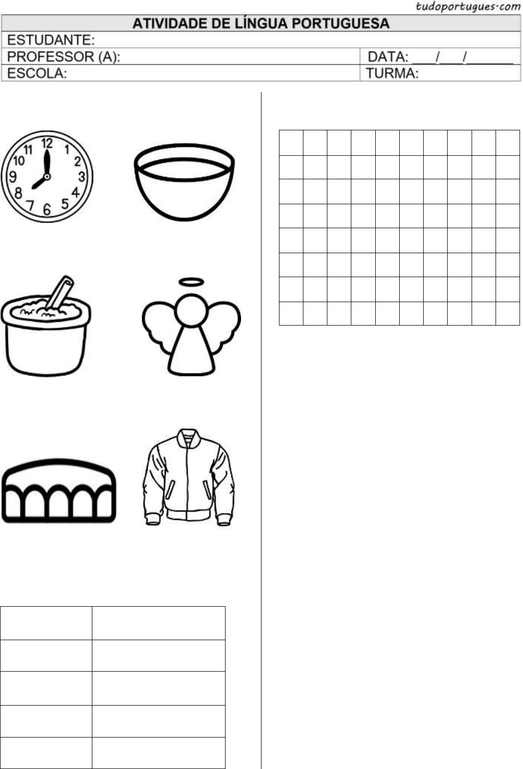 <p>1. Complete o nome das figuras com G ou J.</p><p>RELÓ_______IO TI_______ELA</p><p>CAN_______ICA AN_______O</p><p>______EN_____IVA ______AQUETA</p><p>2. Ordene as sílabas e forme palavras.</p><p>boi – a – ji</p><p>so – ges</p><p>bo – jam</p><p>le – gi – te</p><p>ló – gi</p><p>3. Encontre no diagrama 7 palavras escritas com</p><p>G e J.</p><p>D C F G H J M G I G</p><p>J E N I P A P O H I</p><p>Q R W S A X F R E R</p><p>Q E F Y V D E J X A</p><p>S J D X S G Y E T F</p><p>L A R A N J A T X A</p><p>P L M J K G D A S O</p><p>G E L A D E I R A J</p><p>4. Marque um X nas palavras que estão escritas</p><p>corretamente.</p><p>( ) Jantar ( ) Jaburu</p><p>( ) Cangica ( ) Girante.</p><p>( ) Jejuar ( ) Gaca.</p><p>( ) Faregar. ( ) Marjem.</p><p>( ) Jejelim ( ) Manjericão</p><p>5. Complete as frases abaixo preenchendo as</p><p>lacunas com G ou J.</p><p>a) _____aqueline foi a feira comprar gen_____ibre</p><p>b) _____ermana via_____ou para o exterior.</p><p>c) _____aniele comprou uma ______eladeira.</p><p>6. Relacione a primeira coluna de acordo com a</p><p>segunda conforme a escrita das palavras.</p><p>( ) Carangue____o</p><p>( ) Ca____arana ( G )</p><p>( ) ___elatina</p><p>( ) Re___ião ( J )</p><p>( ) ___irassol</p>
