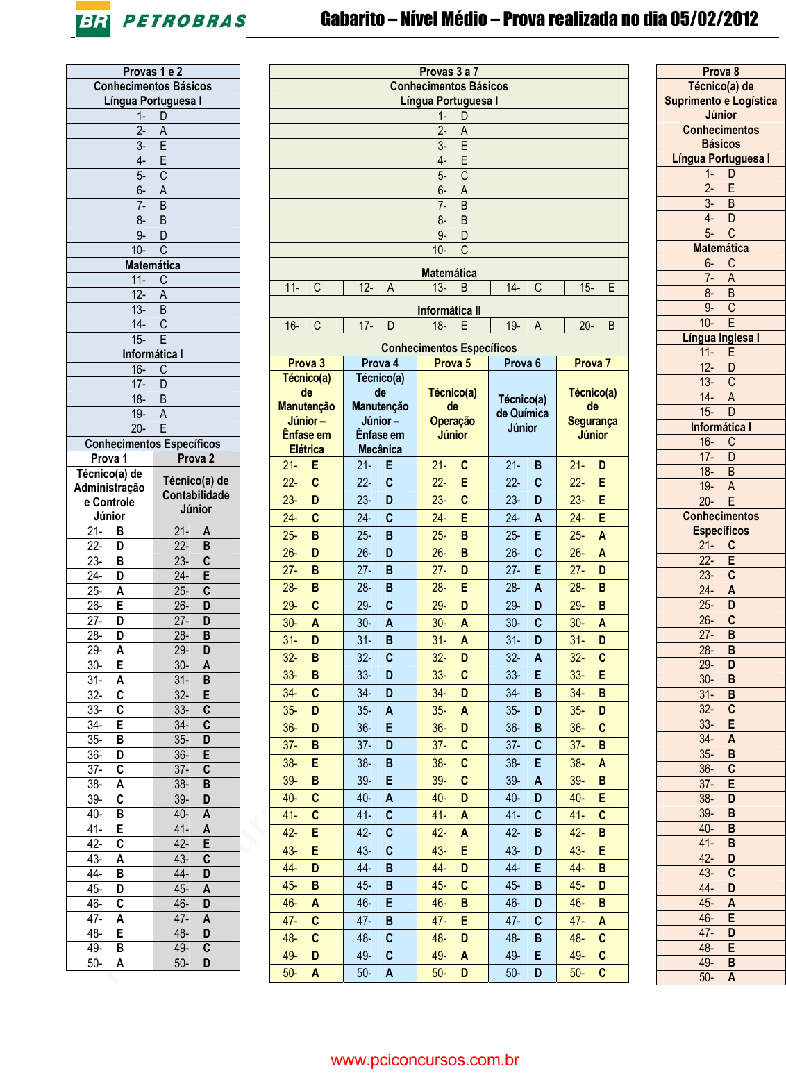 <p>pcimarkpci MDAwMDowMDAwOjAwMDA6MDAwMDowMDAwOmZmZmY6YjM2Zjo4NWM2:TW9uLCAxOSBBdWcgMjAyNCAxMTowNToyMSAtMDMwMA==</p><p>www.pciconcursos.com.br</p><p>Gabarito – Nível Médio – Prova realizada no dia 05/02/2012</p><p>Provas 1 e 2</p><p>Conhecimentos Básicos</p><p>Língua Portuguesa I</p><p>1- D</p><p>2- A</p><p>3- E</p><p>4- E</p><p>5- C</p><p>6- A</p><p>7- B</p><p>8- B</p><p>9- D</p><p>10- C</p><p>Matemática</p><p>11- C</p><p>12- A</p><p>13- B</p><p>14- C</p><p>15- E</p><p>Informática I</p><p>16- C</p><p>17- D</p><p>18- B</p><p>19- A</p><p>20- E</p><p>Conhecimentos Específicos</p><p>Prova 1 Prova 2</p><p>Técnico(a) de</p><p>Administração</p><p>e Controle</p><p>Júnior</p><p>Técnico(a) de</p><p>Contabilidade</p><p>Júnior</p><p>21- B 21- A</p><p>22- D 22- B</p><p>23- B 23- C</p><p>24- D 24- E</p><p>25- A 25- C</p><p>26- E 26- D</p><p>27- D 27- D</p><p>28- D 28- B</p><p>29- A 29- D</p><p>30- E 30- A</p><p>31- A 31- B</p><p>32- C 32- E</p><p>33- C 33- C</p><p>34- E 34- C</p><p>35- B 35- D</p><p>36- D 36- E</p><p>37- C 37- C</p><p>38- A 38- B</p><p>39- C 39- D</p><p>40- B 40- A</p><p>41- E 41- A</p><p>42- C 42- E</p><p>43- A 43- C</p><p>44- B 44- D</p><p>45- D 45- A</p><p>46- C 46- D</p><p>47- A 47- A</p><p>48- E 48- D</p><p>49- B 49- C</p><p>50- A 50- D</p><p>Provas 3 a 7</p><p>Conhecimentos Básicos</p><p>Língua Portuguesa I</p><p>1- D</p><p>2- A</p><p>3- E</p><p>4- E</p><p>5- C</p><p>6- A</p><p>7- B</p><p>8- B</p><p>9- D</p><p>10- C</p><p>Matemática</p><p>11- C 12- A 13- B 14- C 15- E</p><p>Informática II</p><p>16- C 17- D 18- E 19- A 20- B</p><p>Conhecimentos Específicos</p><p>Prova 3 Prova 4 Prova 5 Prova 6 Prova 7</p><p>Técnico(a)</p><p>de</p><p>Manutenção</p><p>Júnior –</p><p>Ênfase em</p><p>Elétrica</p><p>Técnico(a)</p><p>de</p><p>Manutenção</p><p>Júnior –</p><p>Ênfase em</p><p>Mecânica</p><p>Técnico(a)</p><p>de</p><p>Operação</p><p>Júnior</p><p>Técnico(a)</p><p>de Química</p><p>Júnior</p><p>Técnico(a)</p><p>de</p><p>Segurança</p><p>Júnior</p><p>21- E 21- E 21- C 21- B 21- D</p><p>22- C 22- C 22- E 22- C 22- E</p><p>23- D 23- D 23- C 23- D 23- E</p><p>24- C 24- C 24- E 24- A 24- E</p><p>25- B 25- B 25- B 25- E 25- A</p><p>26- D 26- D 26- B 26- C 26- A</p><p>27- B 27- B 27- D 27- E 27- D</p><p>28- B 28- B 28- E 28- A 28- B</p><p>29- C 29- C 29- D 29- D 29- B</p><p>30- A 30- A 30- A 30- C 30- A</p><p>31- D 31- B 31- A 31- D 31- D</p><p>32- B 32- C 32- D 32- A 32- C</p><p>33- B 33- D 33- C 33- E 33- E</p><p>34- C 34- D 34- D 34- B 34- B</p><p>35- D 35- A 35- A 35- D 35- D</p><p>36- D 36- E 36- D 36- B 36- C</p><p>37- B 37- D 37- C 37- C 37- B</p><p>38- E 38- B 38- C 38- E 38- A</p><p>39- B 39- E 39- C 39- A 39- B</p><p>40- C 40- A 40- D 40- D 40- E</p><p>41- C 41- C 41- A 41- C 41- C</p><p>42- E 42- C 42- A 42- B 42- B</p><p>43- E 43- C 43- E 43- D 43- E</p><p>44- D 44- B 44- D 44- E 44- B</p><p>45- B 45- B 45- C 45- B 45- D</p><p>46- A 46- E 46- B 46- D 46- B</p><p>47- C 47- B 47- E 47- C 47- A</p><p>48- C 48- C 48- D 48- B 48- C</p><p>49- D 49- C 49- A 49- E 49- C</p><p>50- A 50- A 50- D 50- D 50- C</p><p>Prova 8</p><p>Técnico(a) de</p><p>Suprimento e Logística</p><p>Júnior</p><p>Conhecimentos</p><p>Básicos</p><p>Língua Portuguesa I</p><p>1- D</p><p>2- E</p><p>3- B</p><p>4- D</p><p>5- C</p><p>Matemática</p><p>6- C</p><p>7- A</p><p>8- B</p><p>9- C</p><p>10- E</p><p>Língua Inglesa I</p><p>11- E</p><p>12- D</p><p>13- C</p><p>14- A</p><p>15- D</p><p>Informática I</p><p>16- C</p><p>17- D</p><p>18- B</p><p>19- A</p><p>20- E</p><p>Conhecimentos</p><p>Específicos</p><p>21- C</p><p>22- E</p><p>23- C</p><p>24- A</p><p>25- D</p><p>26- C</p><p>27- B</p><p>28- B</p><p>29- D</p><p>30- B</p><p>31- B</p><p>32- C</p><p>33- E</p><p>34- A</p><p>35- B</p><p>36- C</p><p>37- E</p><p>38- D</p><p>39- B</p><p>40- B</p><p>41- B</p><p>42- D</p><p>43- C</p><p>44- D</p><p>45- A</p><p>46- E</p><p>47- D</p><p>48- E</p><p>49- B</p><p>50- A</p><p>www.pciconcursos.com.br</p><p>pcimarkpci MDAwMDowMDAwOjAwMDA6MDAwMDowMDAwOmZmZmY6YjM2Zjo4NWM2:TW9uLCAxOSBBdWcgMjAyNCAxMTowNToyMSAtMDMwMA==</p><p>www.pciconcursos.com.br</p><p>Gabarito – Nível Superior – Prova realizada no dia 05/02/2012</p><p>Prova 10 – PROFISSIONAL JÚNIOR – FORMAÇÃO: ANALISTA DE SISTEMAS – ÊNFASE EM INFRAESTRUTURA</p><p>Prova 11 – PROFISSIONAL JÚNIOR – FORMAÇÃO: ANALISTA DE SISTEMAS – ÊNFASE EM JAVA, CRM e WEB</p><p>Prova 12 – PROFISSIONAL JÚNIOR – FORMAÇÃO: ANALISTA DE SISTEMAS – ÊNFASE EM TELECOMUNICAÇÕES</p><p>CONHECIMENTOS BÁSICOS</p><p>LÍNGUA PORTUGUESA II</p><p>1- C 2- B 3- A 4- B 5- D 6- D 7- C 8- A 9- B 10- A</p><p>LÍNGUA INGLESA II</p><p>11- B 12- D 13- C 14- E 15- C 16- D 17- E 18- A 19- C 20- A</p><p>CONHECIMENTOS ESPECÍFICOS</p><p>PROVA 10 PROVA 11 PROVA 12</p><p>PROFISSIONAL JÚNIOR</p><p>FORMAÇÃO: ANALISTA DE SISTEMAS</p><p>ÊNFASE EM INFRAESTRUTURA</p><p>PROFISSIONAL JÚNIOR</p><p>FORMAÇÃO: ANALISTA DE SISTEMAS</p><p>ÊNFASE EM JAVA, CRM e WEB</p><p>PROFISSIONAL JÚNIOR</p><p>FORMAÇÃO: ANALISTA DE SISTEMAS</p><p>ÊNFASE EM TELECOMUNICAÇÕES</p><p>21- D 46- B 21- E 46- A 21- A 46- A</p><p>22- A 47- A 22- B 47- B 22- E 47- E</p><p>23- E 48- C 23- D 48- D 23- B 48- B</p><p>24- B 49- D 24- A 49- D 24- B 49- D</p><p>25- C 50- E 25- A 50- A 25- B 50- B</p><p>26- D 51- A 26- D 51- B 26- B 51- D</p><p>27- E 52- A 27- D 52- E 27- D 52- E</p><p>28- B 53- B 28- B 53- E 28- E 53- A</p><p>29- D 54- A 29- E 54- A 29- B 54- A</p><p>30- E 55- C 30- A 55- A 30- C 55- B</p><p>31- A 56- D 31- C 56- B 31- E 56- D</p><p>32- C 57- C 32- E 57- D 32- C 57- A</p><p>33- C 58- A 33- C 58- C 33- C 58- D</p><p>34- E 59- E 34- C 59- E 34- A 59- E</p><p>35- B 60- C 35- D 60- E 35- E 60- D</p><p>36- A 61- C 36- A 61- A 36- A 61- C</p><p>37- B 62- C 37- E 62- C 37- A 62- E</p><p>38- C 63- A 38- B 63- C 38- D 63- D</p><p>39- D 64- B 39- A 64- E 39- B 64- B</p><p>40- B 65- D 40- E 65- B 40- E 65- B</p><p>41- D 66- C 41- B 66- E 41- C 66- E</p><p>42- B 67- E 42- D 67- C 42- A 67- C