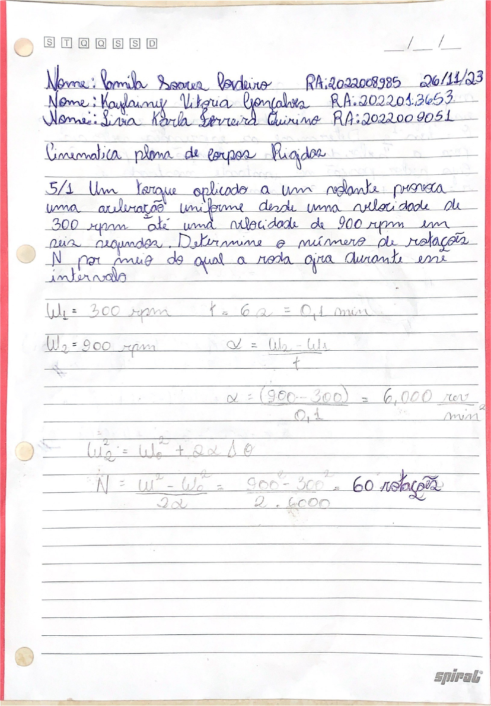<p>S D / / RAi2022008985 26/11/23 Name: Livia Karla Quirino Cinematica plana de 5/1 Um a um uma uniforme uma 300 rpm ate uma de 900 em Determine de N do qual a gira durante 300 rpm = 62 = 01 min W2=900 = - & (900-300) = 6,000 min = + - We = 2.6000</p><p>S D / / plana de 5/4 Q com formato de T gira em terms de um do panto O.No instante nua w=3 angular 14 rod/52 Determine a velocidade a (a) A do B. Expresse em dos lines me = = it = - 0,1E A B= 0,11 an 3 = 3,6 m = Tall = B 0,17 1,21 t in 1,24 a = in = m/s</p><p>/ / S D 5/13 Q circular gira uma constante w = em torno de sell que esta no no Determine a e a do P, instante mostrods r = Z of = K+90. = 32K 137sit - = 32K a = 480 K m/s spirali</p><p>S S D / 5/31 Q de P pelo de e polia se Ae B tem velocidade de 0,4 0,2 a de P, a veloridade do C para instante a da polia A m/s 2 100mm 200mm W 0,200 P -WR Up</p><p>/ / S D 5/35 Q de rola sem a superficie A uma velocidade m/s a calcule a velocidade a angular w do = Vo (0,9) W . B 10m 0,3 VA P2 0,6 ok - P3 VA 0,6 rod/s 0,6 = = 0,6</p><p>S S / / 5/46 Determine a do line B para = 60° a OA uma angular = 8 uma A mda entre a do + 20mm 2 2 0,080 spirali</p><p>S / 5/62 Q C da rada menor umo Vc = 0,4 m/s na direcas Q liga duas 2 em torns e noo Calcule a D esta ma Calcule tambim a que for Vc i constante 200 B A 100mg 150mm = = rodls R 0,3 3 Vo = 01 = m/s 0,3 3 Vo= Vo + D/G = = 3 = 0,5332 = 0,596 = m/s</p><p>/ S D 5/71 A barra CB deslina do a OA. CB uma WOA da barra OA 0=60° B = = mm/s - V1 = 240 = 480 mm/s 120 mm Wot = VA 480 - OA 120 S</p><p>S T S D / / Em vertice B da placa em de mostroda de um de 200 mms nula a 90 mm do B a da placa i sentido determine a do D 200 mm/s CB = 3 VB = CBW B VB 200 = radis CB 90 CD = 50 mm Vo = 250 mm/s</p><p>/ / S T S D 5/104 A extremidade A uma VA para a 00 longs da superficie Mostre que da da a VA pants C da entre em a B VB Vm B A VA VA CB VA AC VB</p>