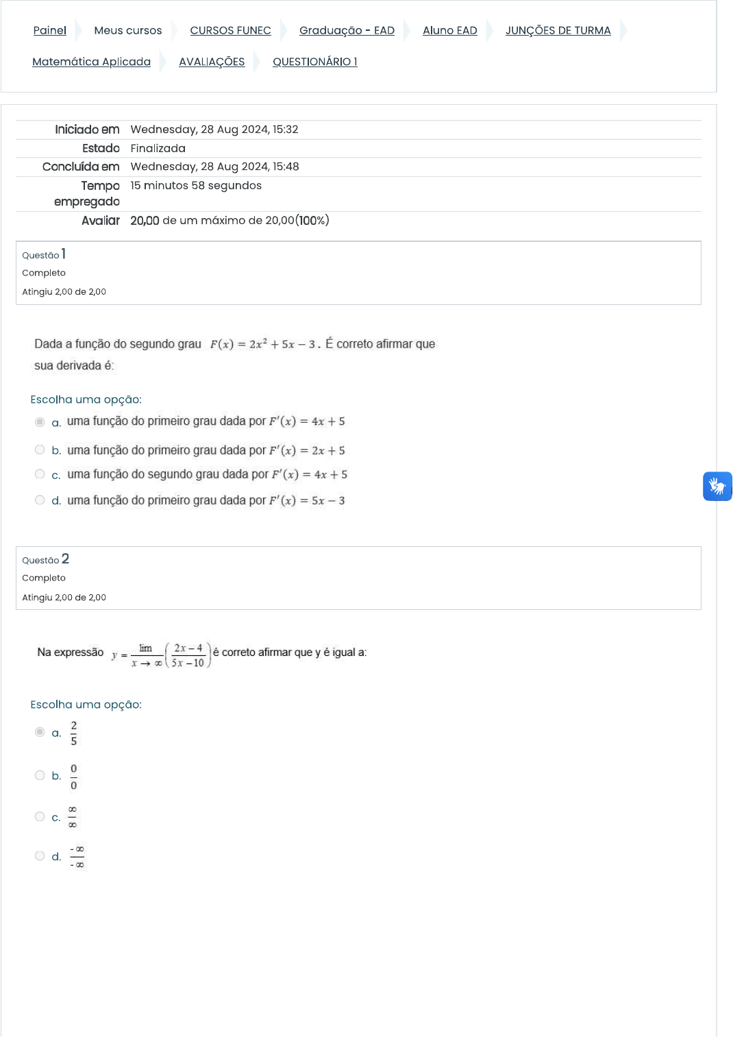 <p>Painel Meus cursos CURSOS FUNEC Graduação EAD Aluno EAD JUNÇÕES DE TURMA Matemática Aplicada AVALIAÇÕES QUESTIONÁRIO 1 Iniciado em Wednesday, 28 Aug 2024, 15:32 Estado Finalizada Concluída em Wednesday, 28 Aug 2024, 15:48 Tempo 15 minutos 58 segundos empregado 20,00 de um máximo de 20,00(100%) Questão 1 Completo Atingiu 2,00 de 2,00 Dada a função do segundo grau + 5x - 3. É correto afirmar que sua derivada Escolha uma opção: a. uma função do primeiro grau dada por b. uma função do primeiro grau dada por C. uma função do segundo grau dada por F'(x) = 4x + 5 d. uma função do primeiro grau dada por Questão 2 Completo Atingiu 2,00 de 2,00 Na expressão y = 2x-4 é correto afirmar que y é igual a: Escolha uma opção: 2 5 0 b. 0 C. d.</p><p>Questão 3 Completo Atingiu 2,00 de 2,00 Dada a função do segundo grau definida por f(x) = + 10x + 12. Podemos afirmar que a soma das coordenadas do vértice Escolha uma opção: a. 3,0 b. 2,5 C. 3,0 d. - 2,5 Questão 4 Completo Atingiu 2,00 de 2,00 A função do primeiro grau por será crescente quando valor do termo definido por a na equação for: Escolha uma Questão 5 Completo Atingiu 2,00 de 2,00 Dadas as funções definidas por f(x) = é correto Escolha uma opção: C. Os gráficos de f(x) e g(x) não se interceptam. d. f(x) é crescente e g(x) é decrescente.</p><p>Questão 6 Completo Atingiu 2,00 de 2,00 Se a variável X na lim 5x2-4 ao mais infinito. É correto afirmar que: Escolha uma opção: a. Tende a zero b. y tende a menos infinito C. tende a 5 d. y tende a mais infinito Questão 7 Completo Atingiu 2,00 de 2,00 Dada a função racional y = 2x2-4x-30 4x2-36 , podemos afirmar que o limite dessa função quando Escolha uma opção: 3 a. 2 2 b. 3 C. 0 2 d. 3 Questão 8 Completo Atingiu 2,00 de 2,00 o valor de y dado por lim 2 2x2-10x+12 é: Escolha uma opção: 1 b. 20 0 C. - 0 O 20 1</p><p>Questão 9 Completo Atingiu 2,00 de 2,00 discriminante de uma função do segundo grau, corresponde aos termos que se encontram dentro do radical da formula de A respeito do estudo dos sinais de uma função do segundo grau, é possível com certeza, que: Escolha uma opção: a. Se valor do discriminante for menor que zero, a função possui duas raízes reais e distintas e outras duas raízes complexas. b. Se valor do discriminante for igual a zero e coeficiente a for positivo, então todos os pontos dessa função estarão acima do eixo exceto pelo vértice que estará sobre esse eixo. C. Se o valor do discriminante for igual a zero e coeficiente a for positivo, então todos os pontos função do segundo grau estarão sob eixo X. d. valor do discriminante não pode ser usado para determinar a quantidade de raízes reais que uma função do segundo grau possui. Questão 10 Completo Atingiu 2,00 de 2,00 o limite da expressão dada por vale: Escolha uma opção a. -32 b. 32 C. 23 Manter contato RA (33) 99986-3935 secretariaead@funec.br f Baixar aplicativo</p>