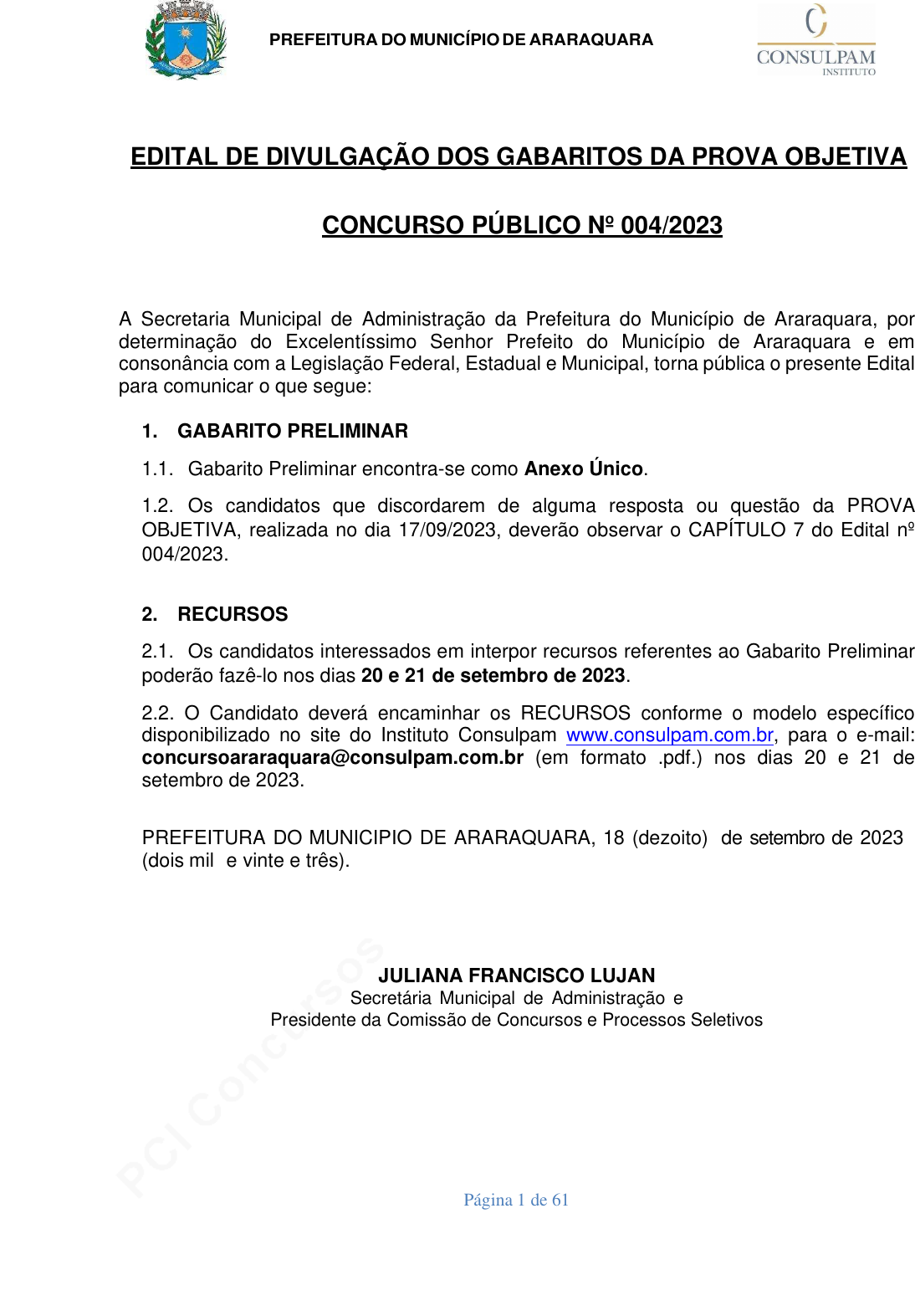 <p>pcimarkpci MjgwNDowZDRiOjhiOTI6YTgwMDpmZDM1OmE0MzE6OTUwYjoxZjVh:U2F0LCAxNiBEZWMgMjAyMyAyMTozMzo0NyAtMDMwMA==</p><p>www.pciconcursos.com.br</p><p>PREFEITURA DO MUNICÍPIO DE ARARAQUARA</p><p>Página 1 de 61</p><p>EDITAL DE DIVULGAÇÃO DOS GABARITOS DA PROVA OBJETIVA</p><p>CONCURSO PÚBLICO Nº 004/2023</p><p>A Secretaria Municipal de Administração da Prefeitura do Município de Araraquara, por</p><p>determinação do Excelentíssimo Senhor Prefeito do Município de Araraquara e em</p><p>consonância com a Legislação Federal, Estadual e Municipal, torna pública o presente Edital</p><p>para comunicar o que segue:</p><p>1. GABARITO PRELIMINAR</p><p>1.1. Gabarito Preliminar encontra-se como Anexo Único.</p><p>1.2. Os candidatos que discordarem de alguma resposta ou questão da PROVA</p><p>OBJETIVA, realizada no dia 17/09/2023, deverão observar o CAPÍTULO 7 do Edital nº</p><p>004/2023.</p><p>2. RECURSOS</p><p>2.1. Os candidatos interessados em interpor recursos referentes ao Gabarito Preliminar</p><p>poderão fazê-lo nos dias 20 e 21 de setembro de 2023.</p><p>2.2. O Candidato deverá encaminhar os RECURSOS conforme o modelo específico</p><p>disponibilizado no site do Instituto Consulpam www.consulpam.com.br, para o e-mail:</p><p>concursoararaquara@consulpam.com.br (em formato .pdf.) nos dias 20 e 21 de</p><p>setembro de 2023.</p><p>PREFEITURA DO MUNICIPIO DE ARARAQUARA, 18 (dezoito) de setembro de 2023</p><p>(dois mil e vinte e três).</p><p>JULIANA FRANCISCO LUJAN</p><p>Secretária Municipal de Administração e</p><p>Presidente da Comissão de Concursos e Processos Seletivos</p><p>pcimarkpci MjgwNDowZDRiOjhiOTI6YTgwMDpmZDM1OmE0MzE6OTUwYjoxZjVh:U2F0LCAxNiBEZWMgMjAyMyAyMTozMzo0NyAtMDMwMA==</p><p>www.pciconcursos.com.br</p><p>PREFEITURA DO MUNICÍPIO DE ARARAQUARA</p><p>Página 2 de 61</p><p>ANEXO I</p><p>CONCURSO PÚBLICO Nº 004/2023</p><p>GABARITO PRELIMINAR</p><p>401 – AGENTE DE SEGURANÇA ALIMENTAR</p><p>PROVA 01</p><p>LINGUA PORTUGUESA/CONHECIMENTOS MATEMÁTICOS</p><p>1 2 3 4 5 6 7 8 9 10</p><p>B B B A A B D C A B</p><p>CONHECIMENTOS ESPECÍFICOS</p><p>11 12 13 14 15 16 17 18 19 20</p><p>D C A C D A C C D B</p><p>21 22 23 24 25 26 27 28 29 30</p><p>C D B B A D C A D B</p><p>31 32 33 34 35 36 37 38 39 40</p><p>C D D B B D A D B C</p><p>41 42 43 44 45 46 47 48 49 50</p><p>D D A D D A C B D B</p><p>pcimarkpci MjgwNDowZDRiOjhiOTI6YTgwMDpmZDM1OmE0MzE6OTUwYjoxZjVh:U2F0LCAxNiBEZWMgMjAyMyAyMTozMzo0NyAtMDMwMA==</p><p>www.pciconcursos.com.br</p><p>PREFEITURA DO MUNICÍPIO DE ARARAQUARA</p><p>Página 3 de 61</p><p>CONCURSO PÚBLICO Nº 004/2023</p><p>GABARITO PRELIMINAR</p><p>401 – AGENTE DE SEGURANÇA ALIMENTAR</p><p>PROVA 02</p><p>LINGUA PORTUGUESA/CONHECIMENTOS MATEMÁTICOS</p><p>1 2 3 4 5 6 7 8 9 10</p><p>B</p><p>B D A B D C A A</p><p>CONHECIMENTOS ESPECÍFICOS</p><p>11 12 13 14 15 16 17 18 19 20</p><p>D C A C D A C B D B</p><p>21 22 23 24 25 26 27 28 29 30</p><p>C D B B A D C A D B</p><p>31 32 33 34 35 36 37 38 39 40</p><p>C D D B B D A D B C</p><p>41 42 43 44 45 46 47 48 49 50</p><p>D D A D D A C B C B</p><p>pcimarkpci MjgwNDowZDRiOjhiOTI6YTgwMDpmZDM1OmE0MzE6OTUwYjoxZjVh:U2F0LCAxNiBEZWMgMjAyMyAyMTozMzo0NyAtMDMwMA==</p><p>www.pciconcursos.com.br</p><p>PREFEITURA DO MUNICÍPIO DE ARARAQUARA</p><p>Página 4 de 61</p><p>CONCURSO PÚBLICO Nº 004/2023</p><p>GABARITO PRELIMINAR</p><p>402 – ANALISTA AMBIENTAL</p><p>PROVA 01</p><p>LINGUA PORTUGUESA/CONHECIMENTOS MATEMÁTICOS</p><p>1 2 3 4 5 6 7 8 9 10</p><p>C B B A C C D C A C</p><p>CONHECIMENTOS ESPECÍFICOS</p><p>11 12 13 14 15 16 17 18 19 20</p><p>C A D B D C A B D B</p><p>21 22 23 24 25 26 27 28 29 30</p><p>B B C D D A A D D B</p><p>31 32 33 34 35 36 37 38 39 40</p><p>D B D A D C C A D C</p><p>41 42 43 44 45 46 47 48 49 50</p><p>D C A D A C D D C D</p><p>pcimarkpci MjgwNDowZDRiOjhiOTI6YTgwMDpmZDM1OmE0MzE6OTUwYjoxZjVh:U2F0LCAxNiBEZWMgMjAyMyAyMTozMzo0NyAtMDMwMA==</p><p>www.pciconcursos.com.br</p><p>PREFEITURA DO MUNICÍPIO DE ARARAQUARA</p><p>Página 5 de 61</p><p>CONCURSO PÚBLICO Nº 004/2023</p><p>GABARITO PRELIMINAR</p><p>402 – ANALISTA AMBIENTAL</p><p>PROVA 02</p><p>LINGUA PORTUGUESA/CONHECIMENTOS MATEMÁTICOS</p><p>1 2 3 4 5 6 7 8 9 10</p><p>C B B D C C D C A B</p><p>CONHECIMENTOS ESPECÍFICOS</p><p>11 12 13 14 15 16 17 18 19 20</p><p>C A D B D C D B D B</p><p>21 22 23 24 25 26 27 28 29 30</p><p>B B C D D A A D D B</p><p>31 32 33 34 35 36 37 38 39 40</p><p>D B D A D C C A D C</p><p>41 42 43 44 45 46 47 48 49 50</p><p>D C A D A C D C C D</p><p>pcimarkpci MjgwNDowZDRiOjhiOTI6YTgwMDpmZDM1OmE0MzE6OTUwYjoxZjVh:U2F0LCAxNiBEZWMgMjAyMyAyMTozMzo0NyAtMDMwMA==</p><p>www.pciconcursos.com.br</p><p>PREFEITURA DO MUNICÍPIO DE ARARAQUARA</p><p>Página 6 de 61</p><p>CONCURSO PÚBLICO Nº 004/2023</p><p>GABARITO PRELIMINAR</p><p>403 – ANALISTA DE CONTROLE INTERNO</p><p>PROVA 01</p><p>LINGUA PORTUGUESA/CONHECIMENTOS MATEMÁTICOS</p><p>1 2 3 4 5 6 7 8 9 10</p><p>B B B D A B D C A B</p><p>CONHECIMENTOS ESPECÍFICOS</p><p>11 12 13 14 15 16 17 18 19 20</p><p>D C A C D A C C D B</p><p>21 22 23 24 25 26 27 28 29 30</p><p>C C D D A B A B D A</p><p>31 32 33 34 35 36 37 38 39 40</p><p>B A D A D A A C C D</p><p>41 42 43 44 45 46 47 48 49 50</p><p>A D C C A C D A D C</p><p>pcimarkpci MjgwNDowZDRiOjhiOTI6YTgwMDpmZDM1OmE0MzE6OTUwYjoxZjVh:U2F0LCAxNiBEZWMgMjAyMyAyMTozMzo0NyAtMDMwMA==</p><p>www.pciconcursos.com.br</p><p>PREFEITURA DO MUNICÍPIO DE ARARAQUARA</p><p>Página 7 de 61</p><p>CONCURSO PÚBLICO Nº 004/2023</p><p>GABARITO PRELIMINAR</p><p>403 – ANALISTA DE CONTROLE INTERNO</p><p>PROVA 02</p><p>LINGUA PORTUGUESA/CONHECIMENTOS MATEMÁTICOS</p><p>1 2 3 4 5 6 7 8 9 10</p><p>B B B A A B D C A A</p><p>CONHECIMENTOS ESPECÍFICOS</p><p>11 12 13 14 15 16 17 18 19 20</p><p>D C A C D A C B D B</p><p>21 22 23 24 25 26 27 28 29 30</p><p>C C D D A B A B D A</p><p>31 32 33 34 35 36 37 38 39 40</p><p>B A D A D A A C C D</p><p>41 42 43 44 45 46 47 48 49 50</p><p>A D C B A C D A D C</p><p>pcimarkpci MjgwNDowZDRiOjhiOTI6YTgwMDpmZDM1OmE0MzE6OTUwYjoxZjVh:U2F0LC