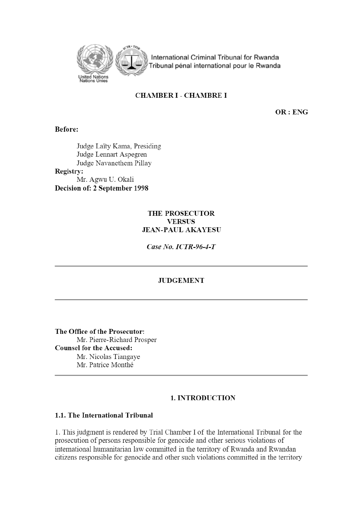 <p>International Criminal Tribunal for Rwanda Tribunal pénal international pour le Rwanda United Nations Nations Unies CHAMBER I - CHAMBRE I OR : ENG Before: Judge Kama, Presiding Judge Lennart Aspegren Judge Navanethem Pillay Registry: Mr. Agwu U. Okali Decision of: 2 September 1998 THE PROSECUTOR VERSUS JEAN-PAUL AKAYESU Case No. ICTR-96-4-T JUDGEMENT The Office of the Prosecutor: Mr. Pierre-Richard Prosper Counsel for the Accused: Mr. Nicolas Tiangaye Mr. Patrice Monthé 1. INTRODUCTION 1.1. The International Tribunal 1. This judgment is rendered by Trial Chamber I of the International Tribunal for the prosecution of persons responsible for genocide and other serious violations of international humanitarian law committed in the territory of Rwanda and Rwandan citizens responsible for genocide and other such violations committed in the territory</p><p>of neighbouring States, between 1 January and 31 December 1994 (the "Tribunal"). The judgment follows the indictment and trial of Jean Paul Akayesu, a Rwandan citizen who was bourgmestre of Taba commune, Prefecture of Gitarama, in Rwanda, at the time the crimes alleged in the indictment were perpetrated. 2. The Tribunal was established by the United Nations Security Council by its resolution 955 of 8 November 1994.1 After having reviewed various official United Nations reports2 which indicated that acts of genocide and other systematic, widespread and flagrant violations of international humanitarian law had been committed in Rwanda, the Security Council concluded that the situation in Rwanda in 1994 constituted a threat to international peace and security within the meaning of Chapter VII of the United Nations Charter. Determined to put an end to such crimes and convinced that the prosecution of persons responsible for such acts and violations would contribute to the process of national reconciliation and to the restoration and maintenance of peace", the Security Council, acting under the said Chapter VII established the Tribunal.3 Resolution 955 charges all States with a duty to cooperate fully with the Tribunal and its organs in accordance with the Statute of the Tribunal ( the "Statute"), and to take any measures necessary under their domestic law to implement the provisions of the Statute, including compliance with requests for assistance or orders issued by the Tribunal Subsequently, by its resolution 978 of 27 February 1995, the Security Council "urge[d] the States to arrest and detain, in accordance with their national law and relevant standards of international law, pending prosecution by the International Tribunal for Rwanda or by the appropriate national authorities, persons found within their territory against whom there is sufficient evidence that they were responsible for acts within the jurisdiction of the International Tribunal for Rwanda". 4 3. The Tribunal is governed by its Statute, annexed to the Security Council Resolution 955, and by its Rules of Procedure and Evidence (the "Rules"), adopted by the Judges on 5 July 1995 and amended The two Trial Chambers and the Appeals Chamber of the Tribunal are composed of eleven Judges in all, three sitting in each Trial Chamber and five in the Appeals Chamber. They are elected by the United Nations General Assembly and represent, in accordance with Article 12(3) (c) of the Statute, the principal legal systems of the world. The Statute stipulates that the members of the Appeals Chamber of the other special internatinal criminal tribunal, namely the Tribunal for the prosecution of persons responsible for serious violations of international humanitarian law committed in the territory of the former Yugoslavia since 1991 ("the Tribunal for the former Yugoslavia"), shall also serve as members of the Appeals Chamber of the Tribunal for Rwanda. 4. Under the Statute, the Tribunal has the power to prosecute persons responsible for serious violations of international human law committed in the territory of Rwanda and Rwandan citizens responsible for genocide and other such violations committed in the territory of neighbouring States, between 1 January and 31 December 1994. According to Articles 2 to 4 of the Statute relating to its ratione materiae jurisdiction, the Tribunal has the power to prosecute persons who committed genocide as defined in Article 2 of the Statute, persons responsible for crimes against humanity as defined in Article 3 of the Statute and persons responsible for serious violations of Article 3 Common to the Geneva Conventions of 12 August 1949 on the protection of victims of war6, and of Additional Protocol II thereto of 8 June 1977, a crime defined in</p><p>Article 4 of the Statute 7. Article 8 of the Statute provides that the Tribunal has concurrent jurisdiction with national courts over which it, however, has primacy. 5. The Statute stipulates that the Prosecutor, who acts as a separate organ of the Tribunal, is responsible for the investigation and prosecution of the perpetrators of such violations. Upon determination that a prima facie case exists to proceed against a suspect, the Prosecutor shall prepare an indictment containing a concise statement of the facts and the crime or crimes with which the accused is charged. Thereafter, he or she shall transmit the indictment to a Trial Judge for review and, if need be, confirmation. Under the Statute, the Prosecutor of the Tribunal for the former Yugoslavia shall also serve as the Prosecutor of the Tribunal for Rwanda. However, the two Tribunals maintain separate Offices of the Prosecutor and Deputy Prosecutors. The Prosecutor of the Tribunal for Rwanda is assisted by a team of investigators, trial attorneys and senior trial attorneys, who are based in Kigali, Rwanda. These officials travel to Arusha whenever they are expected to plead a case before the Tribunal. 1.2. The Indictment 6. The Indictment against Jean-Paul Akayesu was submitted by the Prosecutor on 13 February 1996 and was confirmed on 16 February 1996. 