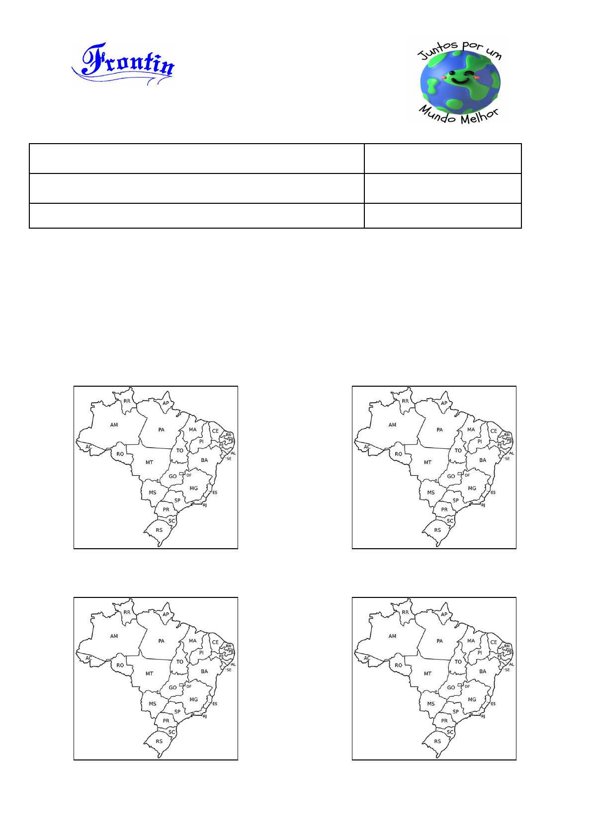<p>ESCOLA ESTADUAL DE ENSINO</p><p>MÉDIO PAULO FRONTIN</p><p>Nome: Turma:</p><p>Professora: Data:</p><p>Peso: 10 pontos Nota:</p><p>AVALIAÇÃO DE CIÊNCIAS HUMANAS E</p><p>DA NATUREZA</p><p>Geografia</p><p>1- Pinte os mapas conforme a região:</p><p>a) Região Norte: b) Região Nordeste:</p><p>c) Região Centro-Oeste: d) Região Sudeste:</p><p>e) Região Sul:</p><p>2- Complete:</p><p>a) A _________ __________ é a maior em extensão e a menor em _____________. Ela</p><p>possui a maior área de _________________.</p><p>b) A _________ _____________ é a região mais _____________ e a mais montanhosa.</p><p>c) A _________ _______________ é a _____________ maior região. É onde se localiza</p><p>o Distrito Federal.</p><p>d) A _________ ___________ possui grande potencial para o ______________ por</p><p>causa de sua longa faixa litorânea.</p><p>e) A __________ __________ é a menor de todas, possui relevo com _____________ e</p><p>depressões e é a mais _________ do Brasil.</p><p>Ciências:</p><p>3- Explique com suas palavras o que é uma mistura homogênea e dê exemplos:</p><p>___________________________________________________________________________</p><p>___________________________________________________________________________</p><p>___________________________________________________________________________.</p><p>4- Explique com suas palavras o que é uma mistura heterogênea e dê exemplos:</p><p>___________________________________________________________________________</p><p>___________________________________________________________________________</p><p>___________________________________________________________________________.</p><p>5- Conseguimos ver o sal e o açúcar depois de dissolvidos na água? Isso quer dizer que são</p><p>quais tipos de mistura?</p><p>___________________________________________________________________________.</p><p>6- Marque um X na opção correta, conforme as misturas:</p><p>a) Homogênea; homogênea; heterogênea, homogênea e homogênea.</p><p>b) Homogênea; heterogênea; homogênea; heterogênea e homogênea.</p><p>c) Heterogênea; heterogênea; homogênea; heterogênea e homogênea.</p><p>d) Heterogênea; heterogênea; homogênea; heterogênea e heterogênea.</p><p>e) Todas as misturas são homogêneas.</p><p>7- Relacione a primeira coluna com a segunda, conforme a separação de misturas:</p><p>(a) Consiste na separação dos materiais sólidos</p><p>presentes em um líquido. Deixando a mistura</p><p>em repouso, os materiais sólidos que não se</p><p>dissolvem tendem a se acumular no fundo do recipiente.</p><p>(b) É usada para separar cada um dos componentes</p><p>de misturas sólido- líquido ou líquido-líquido</p><p>misturável. O líquido de menor ponto de ebulição</p><p>evapora e chega ao condensador, onde retorna ao estado</p><p>líquido e é coletado em outro recipiente.</p><p>(c) É um processo de separação de</p><p>misturas bem simples, se resume no</p><p>ato de separar os componentes.</p><p>(d) É um processo de separação em que</p><p>se separa um composto que está no</p><p>estado sólido de um outro composto</p><p>que esteja no estado líquido,</p><p>através de um filtro.</p><p>(e) Separa os compostos evaporando um deles,</p><p>diferente da destilação, o líquido que evaporou não tem utilidade.</p><p>(f) Também chamada de separação magnética</p><p>separa alguns materiais que tem uma interação</p><p>com o ímã.</p><p>História</p><p>8- Observe as imagens a seguir e pinte apenas a imagem que representa uma paisagem não</p><p>ocupada pelo ser humano:</p><p>Agora, responda:</p><p>9- Quais são os pontos positivos de o ser humano ocupar um espaço da natureza?</p><p>___________________________________________________________________________</p><p>___________________________________________________________________________.</p><p>10- Quais são os pontos negativos de o ser humano ocupar um espaço da natureza?</p><p>___________________________________________________________________________</p><p>___________________________________________________________________________.</p><p>11- Responda com V para as alternativas verdadeiras e F para as falsas:</p><p>( ) Os habitantes que moravam no Brasil, quando os portugueses chegaram eram os</p><p>Quilombos.</p><p>( ) Pedro Álvares Cabral, durante uma expedição para as Índias, descobriu, em 22 de abril</p><p>de 1500, o Brasil, terra conhecida primeiramente como Vera Cruz.</p><p>( ) O nome Brasil é originário de uma árvore conhecida como “pau-brasil, que existia em</p><p>grande quantidade nessa época.</p><p>( ) Quando os portugueses chegaram ao Brasil, reconheceram que a Terra pertencia ao</p><p>povo originário e foram embora.</p><p>BOM TRABALHO!</p>