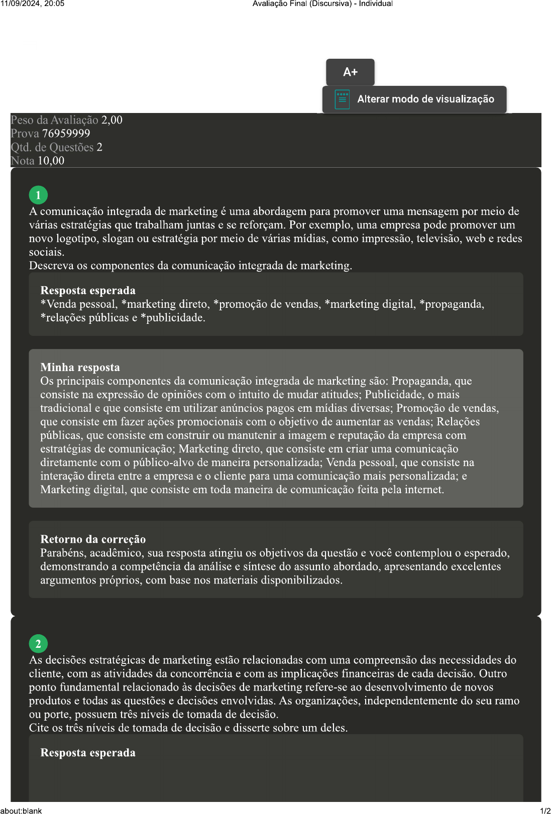<p>11/09/2024, 20:05 Avaliação Final (Discursiva) Individual A+ Alterar modo de visualização Peso da Avaliação 2,00 Prova 76959999 Qtd. de Questões 2 Nota 10,00 1 A comunicação integrada de marketing é uma abordagem para promover uma mensagem por meio de várias estratégias que trabalham juntas e se reforçam. Por exemplo, uma empresa pode promover um novo logotipo, slogan ou estratégia por meio de várias mídias, como impressão, televisão, web e redes sociais. Descreva os componentes da comunicação integrada de marketing. Resposta esperada *Venda pessoal, *marketing direto, *promoção de vendas, *marketing digital, *propaganda, *relações públicas e *publicidade. Minha resposta Os principais componentes da comunicação integrada de marketing são: Propaganda, que consiste na expressão de opiniões com intuito de mudar atitudes; Publicidade, o mais tradicional e que consiste em utilizar anúncios pagos em mídias diversas; Promoção de vendas, que consiste em fazer ações promocionais com objetivo de aumentar as vendas; Relações públicas, que consiste em construir ou manutenir a imagem e reputação da empresa com estratégias de comunicação; Marketing direto, que consiste em criar uma comunicação diretamente com o público-alvo de maneira personalizada; Venda pessoal, que consiste na interação direta entre a empresa e cliente para uma comunicação mais personalizada; e Marketing digital, que consiste em toda maneira de comunicação feita pela internet. Retorno da correção Parabéns, acadêmico, sua resposta atingiu os objetivos da questão e você contemplou esperado, demonstrando a competência da análise e síntese do assunto abordado, apresentando excelentes argumentos próprios, com base nos materiais disponibilizados. 2 As decisões estratégicas de marketing estão relacionadas com uma compreensão das necessidades do cliente, com as atividades da concorrência e com as implicações financeiras de cada decisão. Outro ponto fundamental relacionado às decisões de marketing refere-se ao desenvolvimento de novos produtos e todas as questões e decisões envolvidas. As organizações, independentemente do seu ramo ou porte, possuem três níveis de tomada de decisão. Cite os três níveis de tomada de decisão e disserte sobre um deles. Resposta esperada about:blank 1/2</p><p>11/09/2024, 20:05 Avaliação Final (Discursiva) - Individual *Existem três níveis de decisão: estratégico, tático e operacional. *As decisões do nível estratégico são de responsabilidade da alta gestão (proprietários, acionistas e diretores). É necessária uma visão total da corporação de longo prazo, trazendo respostas sobre os objetivos da empresa, porque faz que faz, e onde quer chegar. *As decisões do nível tático são Orientada aos setores ou unidades específicas. Sob responsabilidade dos gerentes e coordenadores. Respostas sobre que será feito e como serão as ações fazem com que as decisões de nível tático sejam mais detalhadas em comparação às decisões estratégicas, por estarem sob perspectivas específicas. *As decisões operacionais chegam na atuação individual dos colaboradores ou em grupos pequenos a serem liderados. Neste nível, as determinações do planejamento tático são detalhadas em responsável, meta, período de execução. Minha resposta Os três níveis de tomada de decisão são estratégico, tático e operacional, no qual o primeiro citado surge quando decisões mais genéricas de longo prazo precisam ser desenvolvidas, e seguem o mesmo caminho da missão e visão da empresa. Retorno da correção Parabéns, acadêmico, sua resposta atingiu os objetivos da questão e você contemplou esperado, demonstrando a competência da análise e síntese do assunto abordado, apresentando excelentes argumentos próprios, com base nos materiais disponibilizados. Imprimir about:blank 2/2</p>