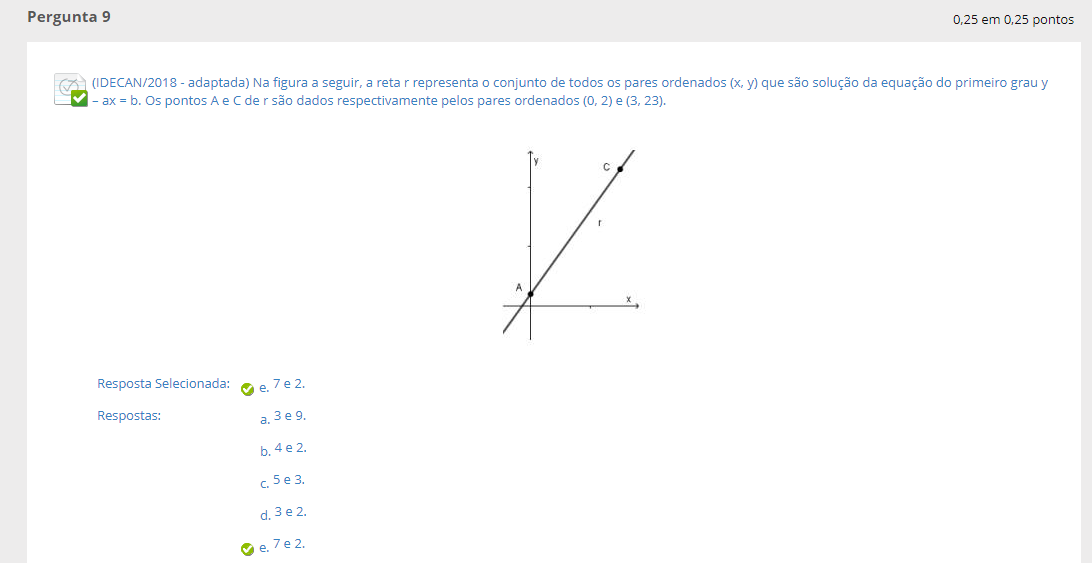 <p>Pergunta 9 0,25 em 0,25 pontos (IDECAN/2018 - adaptada) Na figura a seguir, a reta r representa conjunto de todos os pares ordenados que são solução da equação do primeiro grau y - ax = b. Os pontos Ae de r são dados respectivamente pelos pares ordenados y C A x Resposta Selecionada: e. 2. Respostas: a. b. 4e2.</p>