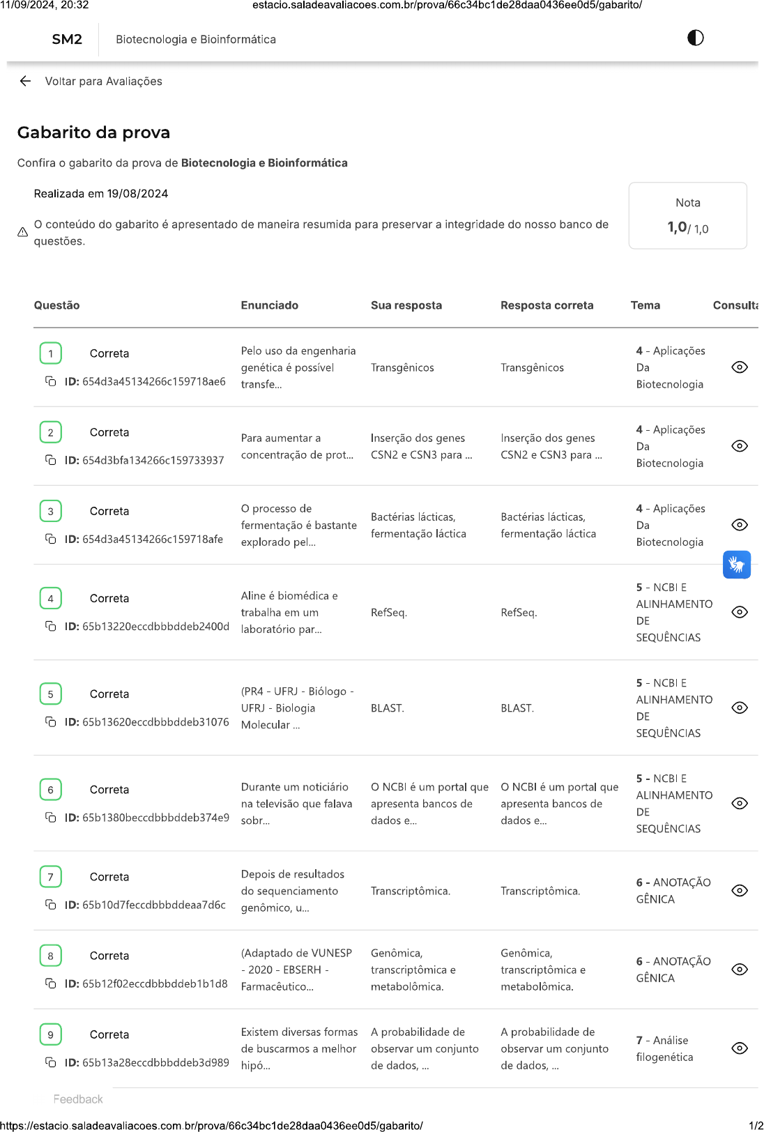 <p>11/09/2024, 20:32 SM2 Biotecnologia e Bioinformática Voltar para Avaliações Gabarito da prova Confira o gabarito da prova de Biotecnologia e Bioinformática Realizada em 19/08/2024 Nota conteúdo do gabarito é apresentado de maneira resumida para preservar a integridade do nosso banco de 1,0/1,0 questões. Questão Enunciado Sua resposta Resposta correta Tema Consulta 1 Correta Pelo uso da engenharia 4 Aplicações genética é possível Transgênicos Transgênicos Da ID: 654d3a45134266c159718ae6 transfe... Biotecnologia 2 Correta 4 Aplicações Para aumentar a Inserção dos genes Inserção dos genes Da ID: 654d3bfa134266c159733937 concentração de prot... CSN2 e CSN3 para CSN2 e CSN3 para Biotecnologia 3 Correta processo de 4 Aplicações Bactérias lácticas, Bactérias lácticas, fermentação é bastante Da ID: 654d3a45134266c159718afe fermentação láctica fermentação láctica explorado pel... Biotecnologia 4 Correta Aline é biomédica e ALINHAMENTO trabalha em um RefSeq. RefSeq. DE ID: 65b13220eccdbbbddeb2400d laboratório par... SEQUÊNCIAS 5 NCBI E 5 Correta (PR4 UFRJ Biólogo ALINHAMENTO UFRJ Biologia BLAST. BLAST. DE ID: 65b13620eccdbbbddeb31076 Molecular SEQUÊNCIAS 5 NCBI E 6 Correta Durante um noticiário O NCBI é um portal que NCBI é um portal que ALINHAMENTO na televisão que falava apresenta bancos de apresenta bancos de DE ID: 65b1380beccdbbbddeb374e9 sobr... dados dados SEQUÊNCIAS 7 Correta Depois de resultados 6 ANOTAÇÃO do sequenciamento Transcriptômica. Transcriptômica. GÊNICA ID: 65b10d7feccdbbbddeaa7d6c genômico, u... 8 Correta (Adaptado de VUNESP Genômica, Genômica, 6 ANOTAÇÃO 2020 EBSERH transcriptômica e transcriptômica e GÊNICA ID: 65b12f02eccdbbbddeb1b1d8 metabolômica. metabolômica. 9 Correta Existem diversas formas A probabilidade de A probabilidade de 7 Análise de buscarmos a melhor observar um conjunto observar um conjunto ID: 65b13a28eccdbbbddeb3d989 filogenética de dados, de dados, Feedback 1/2</p><p>11/09/2024, 20:32 Observe o caldograma abaixo: Imagem: Leandro Pe... 10 Correta conjunto de espécies conjunto de espécies 7 Análise HI H ID: 55b121b7eccdbbbddeaf0b48 filogenética i Encontrou algum problema? Você pode copiar o ID da questão, acessar o Campus Virtual (SIA) e abrir um requerimento. 2/2</p>