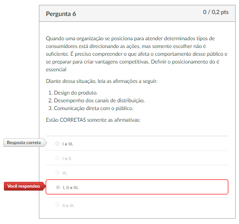 <p>Pergunta 6 pts Quando uma organização se posiciona para atender determinados tipos de consumidores está direcionando as mas somente escolher não é suficiente. É preciso compreender que afeta comportamento desse público e se preparar para criar vantagens competitivas. Definir posicionamento do é essencial Diante dessa leia as afirmações a seguir. 1. Design do produto. 2. Desempenho dos canais de distribuição. 3. Comunicação direta com O público. Estão CORRETAS somente as afirmativas: Resposta correta Você respondeu e III.</p>
