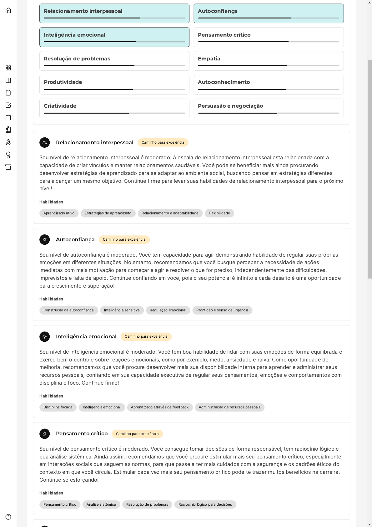 Relacionamento interpessoal Autocon�ança Inteligência emocional Pensamento crítico Resolução de problemas Empatia Produtividade Autoconhecimento Criatividade Persuasão e negociação Relacionamento interpessoal Caminho para excelência Seu nível de relacionamento interpessoal é moderado. A escala de relacionamento interpessoal está relacionada com a capacidade de criar vínculos e manter relacionamentos saudáveis. Você pode se beneficiar mais ainda procurando desenvolver estratégias de aprendizado para se adaptar ao ambiente social, buscando pensar em estratégias diferentes para alcançar um mesmo objetivo. Continue firme para levar suas habilidades de relacionamento interpessoal para o próximo nível! Habilidades Aprendizado ativo Estratégias de aprendizado Relacionamento e adaptabilidade Flexibilidade Autocon�ança Caminho para excelência Seu nível de autoconfiança é moderado. Você tem capacidade para agir demonstrando habilidade de regular suas próprias emoções em diferentes situações. No entanto, recomendamos que você busque perceber a necessidade de ações imediatas com mais motivação para começar a agir e resolver o que for preciso, independentemente das dificuldades, imprevistos e falta de apoio. Continue confiando em você, pois o seu potencial é infinito e cada desafio é uma oportunidade para crescimento e superação! Habilidades Construção da autoconfiança Inteligência sensitiva Regulação emocional Prontidão e senso de urgência Inteligência emocional Caminho para excelência Seu nível de inteligência emocional é moderado. Você tem boa habilidade de lidar com suas emoções de forma equilibrada e exerce bem o controle sobre reações emocionais, como por exemplo, medo, ansiedade e raiva. Como oportunidade de melhoria, recomendamos que você procure desenvolver mais sua disponibilidade interna para aprender e administrar seus recursos pessoais, confiando em sua capacidade executiva de regular seus pensamentos, emoções e comportamentos com disciplina e foco. Continue firme! Habilidades Disciplina focada Inteligência emocional Aprendizado através de feedback Administração de recursos pessoais Pensamento crítico Caminho para excelência Seu nível de pensamento crítico é moderado. Você consegue tomar decisões de forma responsável, tem raciocínio lógico e boa análise sistêmica. Ainda assim, recomendamos que você procure estimular mais seu pensamento crítico, especialmente em interações sociais que seguem as normas, para que passe a ter mais cuidados com a segurança e os padrões éticos do contexto em que você circula. Estimular cada vez mais seu pensamento crítico pode te trazer muitos benefícios na carreira. Continue se esforçando! Habilidades Pensamento crítico Análise sistêmica Resolução de problemas Raciocínio lógico para decisões Resolução de problemas Caminho para excelência Seu nível de resolução de problemas é moderado. Resultados moderados estão relacionados a uma habilidade mental adequada para identificar, analisar, superar adversidades a fim de alcançar uma solução vantajosa para todas as pessoas envolvidas. Ainda assim, recomendamos que você continue trabalhando no seu manejo das emoções e diálogo entre as partes para alcançar uma melhor solução dos conflitos. Lembre-se, o aprimoramento é uma jornada contínua. Continue investindo em você, que assim você vai alcançar um nível ainda mais alto de resolução de problemas! Habilidades Tomada de decisão efetiva Mecanismos nas tomadas de decisão Solução de problemas complexos Mediação e gestão de conflitos Empatia Caminho para excelência Seu nível de empatia é moderado. Você apresenta capacidade para se colocar no lugar das outras pessoas, respeitando a diversidade e demonstrando uma comunicação adequada. Por outro lado, você pode se beneficiar buscando formas de se colocar mais disponível para agir de forma colaborativa e cooperativa com as pessoas ao seu redor. Continue se esforçando e colocando sua empatia em prática! Habilidades Empatia Comunicação Colaboração orientada Reconhecimento do outro Produtividade Caminho para excelência Seu nível de produtividade é moderado. Você tem uma organização adequada e capacidade de otimizar o tempo para alcançar metas, mas você pode continuar se esforçando para melhorar seu gerenciamento do estresse, controle de impulsos e adaptação aos imprevistos para alcançar resultados ainda melhores. Mantenha o foco e siga se esforçando! Habilidades Otimização da gestão de tempo Adaptabilidade Autocontrole e performance Planejamento e organização Autoconhecimento Caminho para excelência Você apresenta um nível de autoconhecimento e consciência de forças e fragilidades moderados. Você é capaz de apresentar uma atitude otimista, voltada para o crescimento, envolvendo resiliência, motivação e coragem, mas ainda há espaço para desenvolvimento! Por isso, é importante que você continue desenvolvendo seu autoconhecimento para se tornar, cada vez mais, uma pessoa resiliente e motivada! Habilidades Identificação de potencial pessoal Resiliência Motivação Coragem Criatividade Início da jornada Seu nível de criatividade pode melhorar! Você apresenta dificuldade para chegar a soluções diferentes, com autonomia e proatividade. Não perca o ânimo! Encare os desafios do dia a dia como uma forma inteligente de desenvolver sua criatividade. Aos poucos, você vai conseguir! Habilidades Criatividade Análise e inovação Iniciativa e proatividade Autonomia e relacionamento Persuasão e negociação Início da jornada Seu nível de persuasão e negociação pode melhorar! Níveis baixos na escala estão relacionados à falta de escuta ativa e comunicação agressiva. Você pode não estar considerando adequadamente a opinião das outras pessoas e pode ser rude em alguns casos. Algumas pessoas têm uma pontuação baixa na escala de persuasão e nego