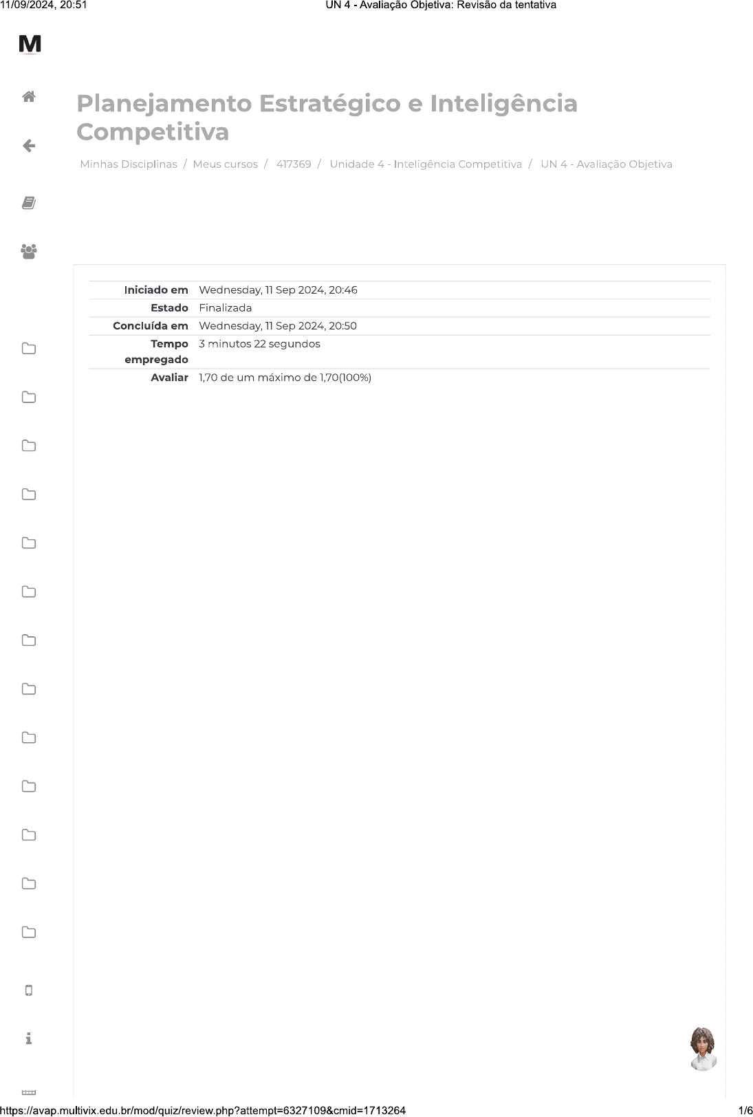 <p>UN 4 - Avaliação Objetiva: Revisão da tentativa 11/09/2024, 20:51 M Planejamento Estratégico e Inteligência Competitiva Minhas Disciplinas / Meus cursos / 417369 / Unidade 4 - Inteligência Competitiva / UN 4 - Avaliação Objetiva Iniciado em Wednesday, 11 Sep 2024, 20:46 Estado Finalizada Concluída em Wednesday, 11 Sep 2024, 20:50 Tempo 3 minutos 22 segundos empregado Avaliar 1,70 de um máximo de 1,70(100%) 1/6</p><p>11/09/2024, 20:51 UN 4 - Avaliação Objetiva: Revisão da tentativa Questão 1 M Correto Atingiu 0,34 de 0,34 São Paulo - Os vegetarianos sempre foram bem-vindos no Outback, apesar da rede de restaurantes inspirada na culinária australiana levar "steakhouse" no nome e ser famosa pelas suas carnes, como as costelas ao molho barbecue. Quem não queria a carne podia se concentrar, por exemplo, na famosa cebola Blomin' Onion ou nas batatas fritas. Agora, Outback Brasil resolveu pensar exclusivamente nos vegetarianos e, pela primeira vez, vai incluir no cardápio três pratos criados desde começo com essa fatia dos consumidores em mente. As novidades chegam hoje (28) aos restaurantes brasileiros. A marca estava de olho em pesquisas recentes. Pesquisa da Kantar Ibope Media aponta que, entre 2012 e 2017, número de adultos vegetarianos no País foi de 8% para 12%. Já Ibope aponta que 14% dos brasileiros se declaravam vegetarianos em 2018. Renata Lamarco, diretora de marketing do Outback Brasil, explica à EXAME que os consumidores há tempos pediam opções vegetarianas elaboradas. "Há bastante tempo acompanhamos a tendência de pessoas que mudam seus hábitos e se tornam vegetarianas. Tanto em contatos recebidos pelo nosso Fale Conosco quanto nas nossas redes sociais e esse último com uma frequência bastante expressiva recebemos relatos apaixonados de clientes que amam a culinária do Outback, mudaram seus hábitos de consumo e queriam que oferecêssemos pratos veggie", diz Renata. Disponível em: publico-vegetariano/>; Acesso em: 30 janeiro, 2019. Neste contexto avalie as informações a seguir: I. A decisão de se criar um produto novo para atender a necessidade de um público que já é cliente não se relaciona com processo de Inteligência Competitiva, pois este público já consumia os produtos do Outback e não tem nada de diferente nisto. II. Um processo de Inteligência Competitiva está de olho na competitividade e vantagem competitiva, portanto concorrência. No caso acima, a estratégia escolhida não tem relacionamento com os concorrentes da empresa. III. Atender a necessidade de um público que já faz parte da sua carteira de clientes é sim uma ação de Inteligência Competitiva, pois traz um diferencial de mercado frente aos concorrentes, satisfação do cliente e atrai um novo público. É correto que se afirma em: Escolha uma opção: a. I, apenas. b. II e III. C. II e III, apenas. d. III, apenas. e. II, apenas. i 2/6</p><p>11/09/2024, 20:51 UN 4 - Avaliação Objetiva: Revisão da tentativa Questão 2 M Correto Atingiu 0,34 de 0,34 Hoje, ter uma boa ideia e desenvolver um bom plano de negócios é apenas primeiro passo que uma empresa deve fazer para ter sucesso em seu segmento. Em um mundo altamente competitivo, é importante além e se posicionar sempre à frente da concorrência que significa saber utilizar os dados a favor com atual cenário de conectividade. Por conta disso, uma das primeiras estratégias utilizadas por empreendedores compreende justamente o armazenamento de informações relevantes para a organização e que podem oferecer insights importantes no futuro. É uma situação já percebida pela grande maioria das empresas atualmente. Segundo a pesquisa Evolution Report Latam, elaborada pelo MIT Technology Review, nove em cada dez líderes de corporações na América Latina (93%) desenvolvem suas estratégias de dados com uma abordagem centrada no cliente. Além disso, 89% deles concordam que essa tática melhora as decisões de negócios. Disponível em competitiva consultado em 29 de janeiro. 2019. Nesse contexto, avalie as informações a seguir: I. armazenamento de informações relevantes para a organização permite que a empresa desenvolva estratégias assertivas de ação no mercado obtendo vantagem competitiva. II. A obtenção de dados importantes para a empresa permite que processo de inteligência competitiva desenvolva ações antecipadas com o objetivo que se pretende atingir. III. Como o mercado é considerado por possuir consumidores prospects, ou seja, que ainda não são clientes, as empresas têm buscado estratégias que as beneficiem na busca por estes possíveis clientes. Com base nos estudos realizados nesta unidade, é correto que se afirma em: Escolha uma opção: a. e II, apenas. b. e III. III, apenas. d. I, apenas. e. e III apenas. 3/6</p><p>11/09/2024, 20:51 UN 4 - Avaliação Objetiva: Revisão da tentativa Questão 3 M Correto Atingiu 0,34 de 0,34 I. Os proprietários de um novo petshop decidiram não estabelecer um ponto de venda (PDV) físico, optando por promoverem suas vendas através de site, ou seja, e-commerce. No que diz respeito às estratégias para captar novos consumidores, optaram pelo investimento em marketing digital de uma forma que pudesse promover e fortalecer sua marca. Para isso, criaram um site com informações importantes sobre diversos tipos de animais, principalmente os domésticos, como vídeos, e-books, artigos, pois entendem que este tipo de ação permite uma fidelização de clientes e atração de novos consumidores. Para gerar leads (possíveis clientes) solicitaram o preenchimento de um cadastro onde obtinham informações importantes, como por exemplo, hábitos de compra, quem são seus fornecedores e onde ficam, como compram (loja, e-commerce), o que compram, quando compram, quais animais possuem e um convite para compartilhar suas experiências com seus pets no próprio site. Considerando cenário descrito, na perspectiva de implementação de estratégias d
