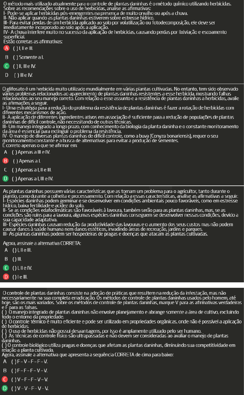 <p>método mais utilizado atualmente para controle de plantas daninhas é método químico utilizando herbicidas. Sobre as recomendações sobre de herbicidas, analise as afirmativas: Pode-se aplicar herbicidas pós-emergentes na presença de muito orvalho ou após a II- Não aplicar quando as plantas daninhas estiverem sobre estresse hídrico. III- Para evitar perdas de um herbicida aplicado ao solo por volatilização ou fotodecomposição, ele deve ser imediatamente incorporado ao solo após a aplicação. IV- A chuva interfere muito no sucesso da aplicação de herbicidas, causando perdas por lixiviação e escoamento superficial. Estão corretas as afirmativas: A ( I, II e III. B ( ) Somente a ( ) II, III e IV. D ( III e IV. glifosato é um herbicida muito utilizado mundialmente em várias plantas cultivadas. No entanto, tem sido observado vários problemas relacionados ao aparecimento de plantas daninhas resistentes a esse mostrando falhas relacionados ao seu manejo correto. Com relação a esse assunto e a resistência de plantas daninhas a herbicidas, avalie as afirmações a seguir. Uma estratégia para a redução do problema da resistência de plantas daninhas é fazer a rotação de herbicidas com diferentes mecanismos de ação. II- A aplicação de diferentes ingredientes ativos em associação é suficiente para a redução de populações de plantas daninhas de difícil não necessitando de outras III- Um manejo integrado a longo prazo, com conhecimento da biologia da planta daninha e constante monitoramento da área é essencial para extinguir problema da resistência. manejo de diversas plantas daninhas de difícil controle, como a buya (Conyza bonariensis), requer seu monitoramento constante e a busca de alternativas para evitar a produção de sementes. E correto apenas que se afirmar em: A ( Apenas a III e IV. B Apenas a Apenas a e III. D Apenas a III e IV. As plantas daninhas possuem várias características que as tornam um problema para agricultor, tanto durante plantio, como durante a colheita e processamento. Com relação a essas analise as afirmativas a seguir: Espécies daninhas podem germinar e se desenvolver em condições ambientais pouco favoráveis, como em estresse hídrico, baixa fertilidade e acidez do solo. II- Se as condições edafoclimáticas são favoráveis à lavoura, também serão para as plantas se as condições são ruins para a lavoura, algumas espécies daninhas conseguem se desenvolver nessas condições, devido a sua capacidade adaptativa. III- Espécies daninhas causam redução da produtividade das lavouras e aumento dos seus custos mas não podem causar danos à saúde humana nem danos estéticos, invadindo áreas de recreação, jardins e parques. III- As plantas daninhas podem ser hospedeiras de pragas e doenças que atacam as plantas cultivadas. Agora, assinale a alternativa CORRETA: A () I, II e III. B D controle de plantas daninhas consiste na de práticas que resultem na redução da infestação, mas não necessariamente na sua completa Os métodos de controle de plantas daninhas usados pelo até hoje, são os mais variados. Sobre os métodos de controle de plantas daninhas, marque V para as afirmativas verdadeiras e F para as falsas. O manejo integrado de plantas daninhas não envolve planejamento e abrange somente a área de cultivo, excluindo todo entorno da propriedade. controle térmico é muito eficiente e pode ser utilizado em propriedades orgânicas, onde não é possível a aplicação de herbicidas. uso de herbicidas não possui desvantagens, por isso é amplamente utilizado pelo ser As técnicas de controle físico são ultrapassadas e não devem ser consideradas ao avaliar manejo de plantas controle biológico utiliza pragas e doenças que afetam as plantas daninhas, diminuindo sua competitividade em relação a planta cultivada. Agora, assinale a alternativa que apresenta a CORRETA de cima para baixo: A D</p>