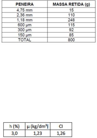 <p>MCC1- Lista de exercícios complementares</p><p>Exercícios Agregados de 1 a 9 e de 10 a 12 concreto</p><p>1. Determine a massa unitária da areia usada no ensaio em que o volume dos</p><p>grãos, contido em um recipiente de 15dm³, é de 8,25 dm³ e sua massa específica</p><p>é de 2,62 kg/dm³?</p><p>2. Determine o percentual de vazios de um material cuja massa específica é 2,50</p><p>kg/dm³ e massa unitária é 0,85 kg/dm³?</p><p>3. Determine o volume de água que existe em 90 kg de areia com umidade de</p><p>3,2%?</p><p>4. Determine o volume de brita que deve ser pedido no depósito sabendo-se que</p><p>serão necessárias 8 toneladas dessa brita na obra? O ensaio para determinação</p><p>da massa unitária em estado solto apresentou os seguintes valores: Massa do</p><p>recipiente = 9,7 kg; Massa do recipiente + amostra = 38,2 kg Volume do</p><p>recipiente = 20,0 dm³.</p><p>5. Qual a quantidade de toneladas de brita que cabe num silo com as seguintes</p><p>dimensões: Base = 2,5 m x 1,4 m ; Altura = 1,5 m. Sabe-se que a massa unitária</p><p>da brita é 1,42 kg/dm³</p><p>6. Para se executar um filtro serão necessários 3 kg de areia com grãos maiores</p><p>que 1,18 mm. Quantos quilos de areia serão necessários, se a areia apresenta a</p><p>seguinte granulométrica:</p><p>7. Determine a massa de água necessária para conferir a 130 kg de uma areia seca</p><p>um inchamento de 28%, sabendo-se que: • I = 0% -----------> μ = 1,51 kg/dm³ • I</p><p>= 28% ------------> μh = 1,24 kg/dm³ • Massa específica = 2,65 kg/dm³</p><p>8. Determine a massa de água que está incorporada em 220 kg de areia,</p><p>considerando-se a mesma no ponto de umidade crítica? (CI e Umidade crítica</p><p>igual ao exemplo). Mh = 220Kg. No exemplo temos:</p><p>9. Sabendo que a umidade da areia é um dos principais fatores que afetam a</p><p>resistência a compressão e também o custo do concreto, assim, complete a</p><p>tabela e graficamente determine o inchamento médio e a umidade critica.</p><p>H Mc H S h i</p><p>n</p><p>capsula</p><p>umid</p><p>teórica</p><p>Volume das</p><p>capsulas</p><p>Massa</p><p>Capsula</p><p>Areia+</p><p>Cap</p><p>Areia + Cap ρh ρs umis.</p><p>Exp.</p><p>Inch.</p><p>0 0 80,30066688 15,44 145,46 145,26</p><p>1 0,5 78,90449631 12,83 123,3 122,61</p><p>2 1 77,10432807 14,33 108,52 107,48</p><p>3 2 74,94630606 15,65 102,82 100,96</p><p>4 3 75,58142704 15 100,5 97,79</p><p>5 4 72,65450091 12,97 99,85 96,21</p><p>6 5 75,81470305 19,11 93,84 89,89</p><p>7 7 79,72031245 16,93 99,23 93,17</p><p>8 9 80,40711974 17,22 104,33 96,21</p><p>9 12 74,79615178 12,9 103,31 92,16</p><p>10. Conhecendo as informações básicas, sabe-se que em uma argamassa usaram-</p><p>se 30 litros de água para 50 kg de cimento e 150 kg de areia seca. Qual a</p><p>quantidade de água a colocar num determinado volume de argamassa, com</p><p>estas mesmas características, quando empregamos 260 dm³ de areia com 3%</p><p>de umidade? Considerar a areia com inchamento de 27% e μ=1,51 kg/dm³.</p><p>Resolução: Traço em Massa >>> 50:150:30.</p><p>11. Em uma obra, esta se iniciando a concretagem da estrutura, o mestre de obras</p><p>necessita de formalizar o pedido de materiais para concretagem, assim o</p><p>engenheiro de execução, levanta a quantidade de concreto cujo volume é de 55</p><p>m³. Apartir dai o engenheiro necessita calcular as quantidades de materiais a</p><p>serem adquiridos para essa execução. O traço do concreto para essa obra é: 1:</p><p>2,20: 1,15: 2,52 (cimento, areia grossa, brita 12,5mm e brita 25mm), com</p><p>relação água/cimento igual a 0,56. Assim calcule essas quantidades.</p><p>12. Para uma melhor analise da dosagem, com relação a custo, faremos uma</p><p>dosagem de concreto para um projeto com solicitação de 30 Mpa, pelo método</p><p>ABCP/ACI, a partir dos dados ofertados a seguir, calcular a padiola,</p><p>considerando a areia com 6% de umidade. Serão utilizados dois tipos de britas,</p><p>sendo brita 0 e brita 1.</p><p>➢ Cimento CP II E-32</p><p>𝛾= 3100 kg/m³</p><p>➢ Areia</p><p>MF = 2,60 Inch. 30% c/ 6% de umid.</p><p>g = 2650 kg/m3</p><p>𝜌 =1470 kg/m3 (solta)</p><p>➢ Brita</p><p>𝛾 = 2700 kg/m3</p><p>𝜌 = 1500 kg/m3 (compac.)</p><p>𝜌 = 1430 kg/m3 (b0 solta) D = 9,5 mm</p><p>𝜌 = 1400 kg/m3 (b1 solta) D = 19 mm</p><p>➢ Concreto</p><p>fck = 30,0 MPa</p><p>Abat. = 90±10 mm</p><p>SD = 5,5 MPa</p><p>➢ Proporção das britas</p><p>B0 = 80%</p><p>B1 = 20%</p>