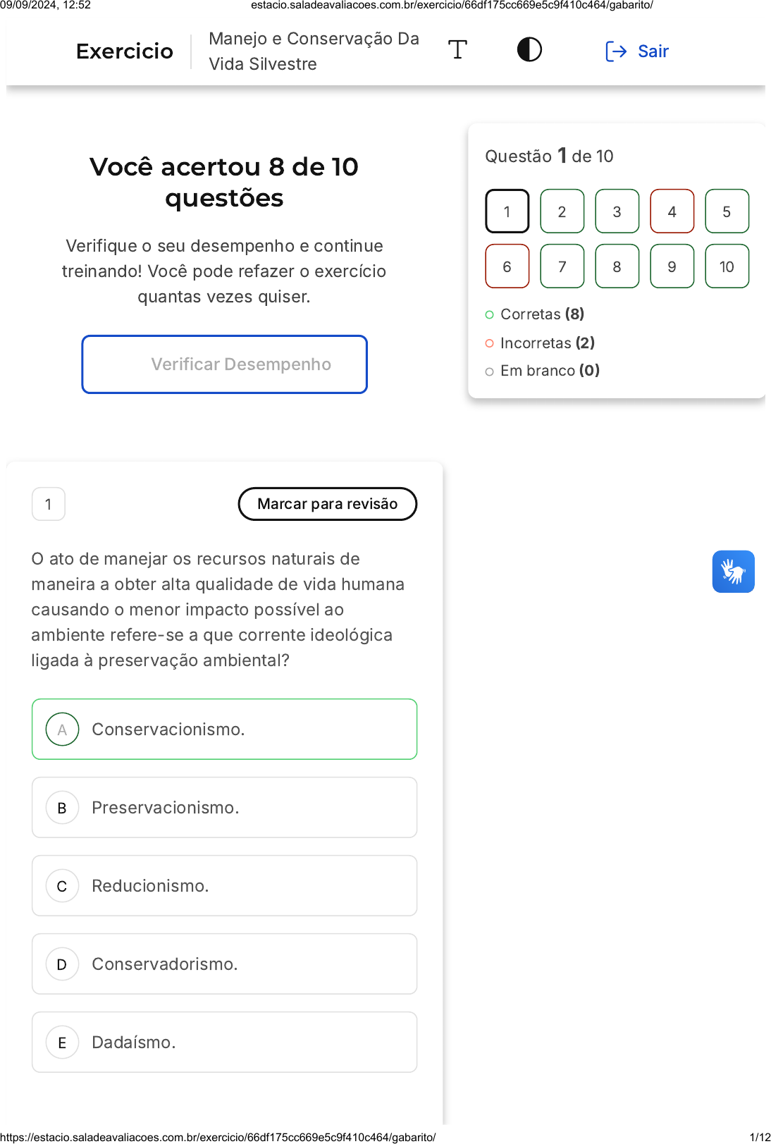 <p>Você acertou 8 de 10</p><p>questões</p><p>Verifique o seu desempenho e continue</p><p>treinando! Você pode refazer o exercício</p><p>quantas vezes quiser.</p><p>Verificar Desempenho</p><p>A</p><p>B</p><p>C</p><p>D</p><p>E</p><p>1 Marcar para revisão</p><p>O ato de manejar os recursos naturais de</p><p>maneira a obter alta qualidade de vida humana</p><p>causando o menor impacto possível ao</p><p>ambiente refere-se a que corrente ideológica</p><p>ligada à preservação ambiental?</p><p>Conservacionismo.</p><p>Preservacionismo.</p><p>Reducionismo.</p><p>Conservadorismo.</p><p>Dadaísmo.</p><p>Questão 1 de 10</p><p>Corretas �8�</p><p>Incorretas �2�</p><p>Em branco �0�</p><p>1 2 3 4 5</p><p>6 7 8 9 10</p><p>Exercicio</p><p>Manejo e Conservação Da</p><p>Vida Silvestre</p><p>Sair</p><p>09/09/2024, 12:52 estacio.saladeavaliacoes.com.br/exercicio/66df175cc669e5c9f410c464/gabarito/</p><p>https://estacio.saladeavaliacoes.com.br/exercicio/66df175cc669e5c9f410c464/gabarito/ 1/12</p><p>Resposta correta</p><p>Parabéns, você selecionou a</p><p>alternativa correta. Confira o</p><p>gabarito comentado!</p><p>Gabarito Comentado</p><p>O termo "Conservacionismo" se refere à</p><p>corrente ideológica que busca manejar os</p><p>recursos naturais de forma a obter alta</p><p>qualidade de vida humana, causando o</p><p>menor impacto possível ao ambiente. Esta</p><p>corrente se diferencia do</p><p>preservacionismo, que defende a</p><p>preservação integral da natureza, sem a</p><p>interferência humana. O reducionismo, por</p><p>sua vez, não está diretamente ligado à</p><p>gestão ambiental, enquanto o</p><p>conservadorismo é uma corrente política e</p><p>o dadaísmo é um movimento artístico.</p><p>Portanto, a alternativa correta é o</p><p>"Conservacionismo".</p><p>2 Marcar para revisão</p><p>Levando em consideração a teoria da</p><p>biogeografia de ilhas, em um cenário em que</p><p>existam uma ilha grande e uma ilha pequena,</p><p>ambas próximas ao continente, e uma ilha</p><p>pequena, distante do continente, podemos</p><p>afirmar que:</p><p>09/09/2024, 12:52 estacio.saladeavaliacoes.com.br/exercicio/66df175cc669e5c9f410c464/gabarito/</p><p>https://estacio.saladeavaliacoes.com.br/exercicio/66df175cc669e5c9f410c464/gabarito/ 2/12</p><p>A</p><p>B</p><p>C</p><p>D</p><p>E</p><p>Ilhas próximas ao continente têm</p><p>menor taxa de imigração.</p><p>A ilha pequena próxima ao continente</p><p>possui uma taxa de extinção menor</p><p>que a ilha grande próxima ao</p><p>continente.</p><p>Ilhas distantes do continente têm</p><p>menor taxa de extinção.</p><p>O tamanho das ilhas não interfere na</p><p>taxa de extinção.</p><p>A ilha pequena próxima ao continente</p><p>possui uma taxa de imigração maior</p><p>que a ilha pequena distante do</p><p>continente.</p><p>Resposta correta</p><p>Parabéns, você selecionou a</p><p>alternativa correta. Confira o</p><p>gabarito comentado!</p><p>Gabarito Comentado</p><p>De acordo com a teoria da biogeografia de</p><p>ilhas, a proximidade de uma ilha ao</p><p>continente influencia diretamente na taxa</p><p>de imigração de espécies. Isso ocorre</p><p>porque ilhas mais próximas ao continente</p><p>são mais acessíveis para as espécies</p><p>migrarem. Portanto, a alternativa correta é</p><p>a E� "A ilha pequena próxima ao continente</p><p>possui uma taxa de imigração maior que a</p><p>ilha pequena distante do continente".</p><p>09/09/2024, 12:52 estacio.saladeavaliacoes.com.br/exercicio/66df175cc669e5c9f410c464/gabarito/</p><p>https://estacio.saladeavaliacoes.com.br/exercicio/66df175cc669e5c9f410c464/gabarito/ 3/12</p><p>A</p><p>B</p><p>C</p><p>D</p><p>E</p><p>3 Marcar para revisão</p><p>Em áreas sob efeito de borda, o que</p><p>normalmente ocorre com as comunidades</p><p>animais?</p><p>Extinção de espécies generalistas.</p><p>Aumento da abundância de espécies</p><p>especialistas.</p><p>Diminuição na riqueza e abundância</p><p>de espécies mais especialistas.</p><p>Extinção de todas as espécies.</p><p>Aumento na densidade populacional</p><p>de todas as espécies.</p><p>Resposta correta</p><p>Parabéns, você selecionou a</p><p>alternativa correta. Confira o</p><p>gabarito comentado!</p><p>Gabarito Comentado</p><p>O efeito de borda é um fenômeno</p><p>ecológico que ocorre nas margens de um</p><p>habitat, onde as condições ambientais</p><p>podem ser significativamente diferentes do</p><p>interior do habitat. Isso pode levar a uma</p><p>diminuição na riqueza e abundância de</p><p>espécies mais especialistas, como indicado</p><p>na alternativa C. Espécies especialistas são</p><p>aquelas que têm requisitos de habitat muito</p><p>específicos e, portanto, são mais sensíveis</p><p>09/09/2024, 12:52 estacio.saladeavaliacoes.com.br/exercicio/66df175cc669e5c9f410c464/gabarito/</p><p>https://estacio.saladeavaliacoes.com.br/exercicio/66df175cc669e5c9f410c464/gabarito/ 4/12</p><p>A</p><p>B</p><p>C</p><p>D</p><p>E</p><p>a mudanças ambientais. Portanto, em áreas</p><p>sob efeito de borda, essas espécies</p><p>tendem a diminuir em número e</p><p>diversidade.</p><p>4 Marcar para revisão</p><p>Em relação ao tamanho e à forma dos</p><p>fragmentos, podemos afirmar que:</p><p>Fragmentos estreitos sofrem mais</p><p>efeito de borda.</p><p>Fragmentos pequenos têm menor</p><p>efeito de borda.</p><p>A forma do fragmento não influencia o</p><p>efeito de borda.</p><p>A forma do fragmento só influencia o</p><p>efeito de borda em fragmentos</p><p>grandes.</p><p>Os fragmentos que sofrem menos</p><p>efeito de borda são pequenos e</p><p>estreitos.</p><p>Resposta incorreta</p><p>Opa! A alternativa correta é a letra</p><p>A. Confira o gabarito comentado!</p><p>Gabarito Comentado</p><p>A alternativa correta é a A, que afirma que</p><p>"Fragmentos estreitos sofrem mais efeito</p><p>09/09/2024, 12:52 estacio.saladeavaliacoes.com.br/exercicio/66df175cc669e5c9f410c464/gabarito/</p><p>https://estacio.saladeavaliacoes.com.br/e