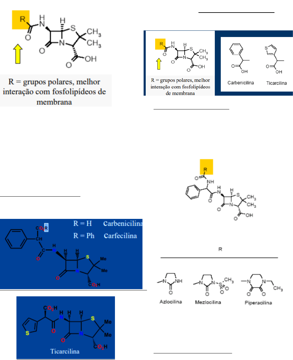 <p>PENICICILINAS DE ESPECTRO</p><p>ESTENDIDO</p><p>→Aminopenicilinas ➢ Classe 1: NH2 na</p><p>posição α</p><p>→Carboxipenicilinas ➢ Classe 2: COOH</p><p>na posição α</p><p>→Ureidopenicilinas ➢ Classe 3: grupo</p><p>uréia na posição α</p><p>CARBOXIPENICILINAS</p><p>➔ COOH na posição alfa!</p><p>•Carfecillina: pró-fármaco para</p><p>carbenicilina;</p><p>•Introdução de grupo ácido, ativo sobre</p><p>uma gama mais ampla de bactérias Gram -;</p><p>•Resistente à maioria das β-lactamases;</p><p>•Menos ativo contra bactérias Gram +;</p><p>•Instável em solução ácida;</p><p>•Adm. via intravenosa;</p><p>•Ativas contra Pseudomonas aeruginosa;</p><p>UREIDOPENICILINAS</p><p>-Cadeia lateral mimetiza segmento do</p><p>peptidoglicano;</p><p>- Alta fixação às PBP;</p><p>- Boa ação contra gram – (Pseudomonas)</p><p>• Adm. via IV; • Baixa solubilidade em</p><p>água. • Nefrotoxicidade.</p><p>EAs: baixa toxicidade; hemorragias;</p><p>alteração da função plaquetária; hepato e</p><p>nefrotoxicidade; flebites...</p><p>HIPERSENSIBILIDADE</p><p>- À própria penicilina e aos produtos da sua</p><p>degradação;</p><p>- Contato anterior ao fungo;</p><p>- Impurezas provenientes do processo de</p><p>obtenção;</p><p>REAÇÕES IMEDIATAS: edema da glote</p><p>(fatal); urticária (ñ-fatais).</p><p>REAÇÕES TARDIAS: hemólise, vasculite</p><p>(fatais); febre, erupções cutâneas...</p><p>INIBIDORES DE BETA-LACTAMASE</p><p>*enzimas bacterianas que catalisam</p><p>reações de hidrólise de fármacos -</p><p>lactâmicos</p><p>→São moléculas semelhantes aos</p><p>antibióticos beta-lactâmicos, com fraca</p><p>ação antibiótica, que têm como função</p><p>proteger as penicilinas sensíveis às beta-</p><p>lactamases.</p><p>Como atuam as beta-lactamases?</p><p>*Ataque nucleofílica aos antibióticos</p><p>beta-lactâmicos</p><p>Ácido clavulânico</p><p>•Isolado de Streptomyces clavuligerus</p><p>•Atividade antibacteriana fraca;</p><p>•Poderoso inibidor irreversível de β-</p><p>lactamases - substrato suicida;</p><p>•Usado como um medicamento de sentinela</p><p>para ampicilina;</p><p>•Permite menor dose de penicilina e um</p><p>maior espectro de atividade;</p><p>Associações disponíveis:</p><p>→ Amoxicilina + clavulanato de potássio</p><p>→ Ampicilina + sulbactam sódico</p><p>→ Amoxicilina + sulbactam</p><p>→ Piperacilina + tazobactam</p><p>Como atuam os inibidores das beta-</p><p>lactamases?</p><p>Cefalosporinas</p><p>•Agentes antibacterianos que inibem a</p><p>síntese da parede celular bacteriana</p><p>•Descoberto de uma colônia de fungos</p><p>na água de esgoto da Sardenha (1948)</p><p>•Cefalosporina C identificada estrutura</p><p>cristalográfica em 1961.</p><p>→Beta lactamase pelo ác. Clavulânico -</p><p>Inativação irreversível</p><p>→grupo nucleófilo que forma uma ponte</p><p>dupla de ligação.</p><p>As cefalosporinas são naturalmente menos</p><p>potentes que as penicilinas, porém...</p><p>• Algumas são resistentes às beta-</p><p>lactamases;</p><p>• Seu anel diidrotiazina tem 6 átomos →</p><p>menos reativo que as penicilinas • Menor</p><p>tensão no anel também diminui sua</p><p>atividade</p><p>• Ligação dupla entre 3 e 4 – responsável</p><p>por captar e- → reatividade do anel -</p><p>lactâmico; • Substituições em C7 –</p><p>protegem da hidrólise ácida e quebra do</p><p>anel • Cadeia lateral em C3 – protegem</p><p>contra a abertura do anel.</p><p>MECANISMO DE AÇÃO</p><p>Possíveis modificações:</p><p>→ Cadeia lateral 7-Acillamino;</p><p>→Cadeia lateral de 3-acetoximetileno;</p><p>→Substituição em C-7.</p><p>CEFALOSPORINAS DE 1ª GERAÇÃO</p><p>*Melhor representante da classe, ativo v.o</p><p>CEFALOSPORINAS DE 2ª GERAÇÃO</p><p>CEFALOSPORINAS DE 3ª GERAÇÃO</p><p>→Colocação do anel aminotiazol:</p><p>melhora na ação contra gram-negativos e</p><p>afinidade pela transpeptidase</p><p>→Colocação de grupo iminometoxi na</p><p>cadeia lateral melhora a resistência às β-</p><p>lactamases;</p><p>→Espectro contra cocos Gram-positivos.</p><p>CEFALOSPORINAS DE 4ª GERAÇÃO</p><p>➔ Forma zwitteriônica melhora a penetração na parede celular gram-negativa; Possuem</p><p>alta afinidade pela transpeptidase e resistência à muitas β-lactamases.</p><p>CEFALOSPORINAS DE 5ª GERAÇÃO</p><p>•Ceftarolina – cefalosporina anti-MRSA</p><p>• Induz mudança conformacional nas PBP de bactérias resistentes, permitindo sua ligação;</p><p>• Agrega todos os avanços das cefalosporinas anteriores.</p><p>Administrada via IV; - Administrada na</p><p>forma de pró-fármaco, convertida em forma</p><p>ativa pelas fosfatases plasmáticas;</p><p>Carbapenêmicos</p><p>*Tienamicina isolada de S. cattleya em</p><p>1979;</p><p>*Espectro contra G+ e G-;</p><p>O carbapenêmicos naturais tem pouca</p><p>estabilidade química ao metabolismo →</p><p>dehidropeptidases;</p><p>Monobactâmicos</p><p>Espectro contra G- e bactérias aeróbias – P.</p><p>aeruginosa, H. influenza e N. meningitidis</p><p>Não possui ação contra G+ e anaeróbios</p><p>Uso parenteral.</p><p>Espectro contra G- e bactérias aeróbias – P.</p><p>aeruginosa;</p><p>H. influenza e N. meningitidis;</p><p>Não possui ação contra G+ e anaeróbios;</p><p>Uso parenteral</p>
