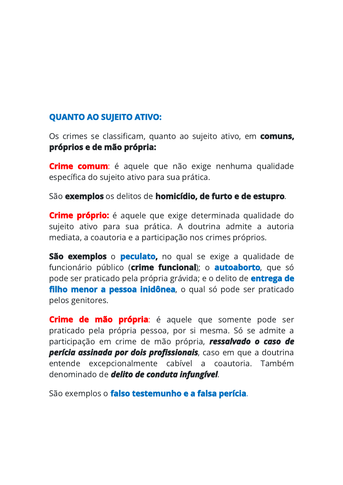 <p>RESUMO DE AULA - DIREITO PENAL I</p><p>CLASSIFICAÇÃO DOS CRIMES</p><p>CLASSIFICAÇÃO DOS CRIMES – EXEMPLOS</p><p>QUANTO AO SUJEITO ATIVO:</p><p>Os crimes se classificam, quanto ao sujeito ativo, em comuns,</p><p>próprios e de mão própria:</p><p>Crime comum: é aquele que não exige nenhuma qualidade</p><p>específica do sujeito ativo para sua prática.</p><p>São exemplos os delitos de homicídio, de furto e de estupro.</p><p>Crime próprio: é aquele que exige determinada qualidade do</p><p>sujeito ativo para sua prática. A doutrina admite a autoria</p><p>mediata, a coautoria e a participação nos crimes próprios.</p><p>São exemplos o peculato, no qual se exige a qualidade de</p><p>funcionário público (crime funcional); o autoaborto, que só</p><p>pode ser praticado pela própria grávida; e o delito de entrega de</p><p>filho menor a pessoa inidônea, o qual só pode ser praticado</p><p>pelos genitores.</p><p>Crime de mão própria: é aquele que somente pode ser</p><p>praticado pela própria pessoa, por si mesma. Só se admite a</p><p>participação em crime de mão própria, ressalvado o caso de</p><p>perícia assinada por dois profissionais, caso em que a doutrina</p><p>entende excepcionalmente cabível a coautoria. Também</p><p>denominado de delito de conduta infungível.</p><p>São exemplos o falso testemunho e a falsa perícia.</p><p>QUANTO À NECESSIDADE DE RESULTADO NATURALÍSTICO</p><p>PARA A SUA CONSUMAÇÃO:</p><p>Este critério leva em conta a necessidade de resultado</p><p>naturalístico para a consumação, distinguindo os delitos em</p><p>materiais, formais e de mera conduta.</p><p>Crime material: é aquele que prevê um resultado naturalístico</p><p>como necessário para sua consumação. São exemplos o delito</p><p>de aborto e o crime de dano. Há quem o chame de crime de</p><p>resultado.</p><p>Crime formal: é aquele que descreve um resultado naturalístico,</p><p>cuja ocorrência é prescindível para a consumação do delito.</p><p>Também denominado de delito de tipo incongruente. É o caso</p><p>da extorsão mediante sequestro e o do descaminho.</p><p>Crime de mera conduta: é aquele cujo resultado naturalístico</p><p>não pode ocorrer, porque sequer há a sua descrição. Podemos</p><p>tomar como exemplo o crime de ato obsceno, assim como o</p><p>de violação de domicílio.</p><p>QUANTO À NECESSIDADE DE LESÃO AO BEM JURÍDICO PARA A</p><p>SUA CONSUMAÇÃO.</p><p>Se tomada como critério a necessidade ou não de efetiva lesão</p><p>ao bem jurídico, temos a classificação dos delitos em crimes de</p><p>dano e crimes de perigo. Esta forma de classificação toma</p><p>como base o resultado jurídico do delito.</p><p>Crime de dano: é aquele em que se exige, para sua</p><p>configuração, a efetiva ocorrência de lesão ou de dano ao</p><p>bem jurídico protegido pela norma penal.</p><p>São exemplos o crime de dano, o crime de vilipêndio a</p><p>cadáver, o próprio crime de dano e o infanticídio.</p><p>Crime de perigo: é aquele que, para que se considere</p><p>consumado, exige apenas que o bem seja exposto a perigo.</p><p>Portanto, a efetiva ocorrência de dano ao bem jurídico protegido</p><p>pela lei penal é desnecessária para que o crime se consume.</p><p>São exemplos os crimes de perigo de contágio venéreo, de</p><p>omissão de socorro e de tráfico ilícito de entorpecentes.</p><p>Os crimes de perigo podem ser subdivididos em:</p><p>De perigo concreto: é o crime de perigo cuja configuração</p><p>requer a demonstração de que o bem jurídico efetivamente</p><p>foi posto em perigo. É exemplo o crime de incêndio, em</p><p>que o perigo deve ser demonstrado.</p><p>De perigo abstrato (ou puro): é o crime de perigo em que a</p><p>sua consumação não depende da demonstração de que</p><p>tenha colocado o bem jurídico em risco. O risco é</p><p>presumido, de forma absoluta, pela lei. É o caso do crime</p><p>de associação criminosa e crime de posse irregular de</p><p>munição de uso permitido ou restrito, dos artigos 12 e 14</p><p>da Lei 10.826/2003.</p><p> De perigo individual: é o delito que causa perigo a uma</p><p>pessoa ou a um grupo determinado de pessoas. Pode-se</p><p>apontar como exemplo o delito de perigo de contágio de</p><p>moléstia grave.</p><p> De perigo comum ou coletivo: é aquele cujo perigo de</p><p>dano atinge um número indeterminado de pessoas. Temos</p><p>como exemplos o crime de fabrico, fornecimento, aquisição</p><p>posse ou transporte de explosivos ou gás tóxico, ou</p><p>asfixiante (artigo 253 do CP) e o de incêndio (artigo 250 do</p><p>CP).</p><p> De perigo atual: é aquele cujo perigo causado é</p><p>contemporâneo à conduta do agente. O crime de</p><p>desabamento ou desmoronamento do artigo 256 do CP</p><p>tende a ser de perigo atual, pois o desabamento de um</p><p>prédio, no momento em que ocorre, já coloca em perigo a</p><p>vida, a integridade física ou o patrimônio de outrem.</p><p> De perigo iminente: é aquele cujo perigo está prestes a</p><p>acontecer. O abandono de incapaz, do artigo 133 do CP,</p><p>na prática, pode se mostrar um crime de perigo iminente, já</p><p>que, ainda que a pessoa sob cuidado não fique em perigo</p><p>imediatamente, pode ficar depois de algum tempo sem</p><p>cuidado.</p><p> De Perigo futuro ou mediato: é aquele que produz um</p><p>risco futuro. Os exemplos são a associação criminosa ou</p><p>o porte de munição de uso permitido.</p><p>A doutrina mais consagrada se preocupa em classificar os</p><p>crimes de perigo do seguinte modo, sem misturar os critérios:</p><p> Crime de perigo abstrato;</p><p> Crime de perigo concreto;</p><p> Crime de perigo individual;</p><p> Crime de perigo comum.</p><p>QUANTO À FORMA DA CONDUTA.</p><p>Leva em conta a forma da conduta, se positiva ou negativa,</p><p>separando os crimes em comissivos e omissivos.</p><p>Crime comissivo: é aquele que é praticado por um</p><p>comportamento positivo do agente, isto é,