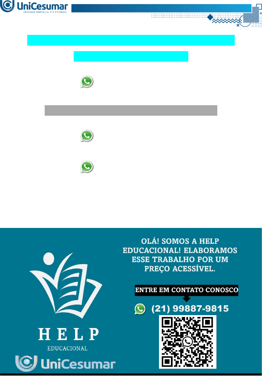 <p>MAPA – PRÁTICA DE ENSINO: CONCEPÇÃO E</p><p>ORGANIZAÇÃO - 53_2024</p><p>(21) 99887-9815</p><p>ASSESSORIA NOS SEUS TRABALHOS</p><p>(21) 99887-9815</p><p>(21) 99887-9815</p><p>Olá, Acadêmico(a)!</p><p>Esta atividade MAPA o(a) ajudará a desenvolver práticas de ensino, bem como o seu</p><p>aprendizado pessoal. O objetivo é oferecer uma contribuição prática e teórica para que você</p><p>possa se preparar para futuro desenvolvimento em sua atuação profissional. Para isso, para</p><p>o desenvolvimento do MAPA considerar os seguintes textos</p><p>Texto 1</p><p>Disponível em: <https://olhonavaga.com.br/images?id=12330>. Acesso em: 09/06/2023</p><p>Texto 2:</p><p>Como lidar com a falta de materiais nas escolas públicas?</p><p>Para desempenhar seu papel de ensinar, os professores se deparam, constantemente, com</p><p>situações difíceis de contornar. A formação é deficitária, a estrutura não é das melhores, o</p><p>Estado, muitas vezes, deixa de cumprir com suas responsabilidades, não há participação</p><p>ativa de várias famílias, além da falta de materiais nas escolas.</p><p>É um conjunto de fatores que influencia, diretamente, na qualidade das aulas e, em conse-</p><p>quência, no aprendizado dos alunos.</p><p>Muitas vezes, o professor quer fazer uma atividade diferente, porém os recursos são escas-</p><p>sos e o profissional acaba desanimando. Tem aqueles ainda que, com o objetivo de tirar</p><p>seus projetos do papel e engajar mais os alunos nas aulas, compram materiais com seu</p><p>próprio dinheiro.</p><p>Se tratando de equipamentos eletrônicos, como os projetores, muitas vezes eles existem</p><p>nas escolas, mas seu uso é tão concorrido que o professor resolve, por fim, se ater aos li-</p><p>vros didáticos e ao quadro negro.</p><p>Segundo pesquisa realizada com gestores de escolas municipais de SP, mesmo quando os</p><p>insumos são fornecidos, eles são insuficientes ou inadequados. Além de as escolas não</p><p>participarem das decisões de compra, o que acarreta em envios que não competem com a</p><p>realidade, os materiais, na maioria das vezes, são de baixa qualidade.</p><p>Disponível em: <https://blog.portabilis.com.br/como-lidar-com-a-falta-de-materiais-nas-esco-</p><p>las/>. Acesso em: 09/06/2023.</p><p>O docente havia elaborado um planejamento que incluía a exibição de um filme seguida da</p><p>proposição de um trabalho aos estudantes. Contudo, no dia designado, a turma se apresen-</p><p>tou indisposta com muita conversa paralela, além de ocorrer uma falha no projetor disponí-</p><p>vel na sala de aula, impossibilitando a realização da atividade prevista. Diante dessa cir-</p><p>cunstância, como solucionar esse impasse? Sua tarefa consiste em propor duas alternati-</p><p>vas para contornar essa situação, bem como elaborar dois planejamentos voltados para</p><p>aulas diferenciadas e não convencionais.</p><p>Nesta atividade MAPA, você deve realizar dois planejamentos de atividades para a mesma</p><p>aula, levando em consideração as dificuldades apresentadas e a necessidade de utilizar</p><p>metodologias práticas de ensino. Cada planejamento deve conter informações como o con-</p><p>teúdo a ser abordado, o ano e a disciplina, a quantidade de aulas, os materiais necessários</p><p>e a metodologia de ensino a ser empregada. Além disso, você deve elaborar um parágrafo</p><p>que responda à seguinte questão: 'É possível realizar uma aula diferenciada, com metodo-</p><p>logias práticas de ensino, sem utilizar programas digitais, internet e equipamentos eletrôni-</p><p>cos como projetor, caixas de som, televisão?' Justifique sua resposta em até 20 linhas,</p><p>apresentando argumentos embasados e coerentes.</p><p>Orientações:</p><p>- Siga atentamente às orientações descritas acima, desenvolvendo em seu trabalho todos</p><p>os conteúdos elencados.</p><p>- Desenvolva o seu trabalho no Template do MAPA disponibilizado no Material da Disci-</p><p>plina.</p><p>- Assista ao vídeo explicativo disponível na Sala do Café.</p><p>- Para auxiliar no desenvolvimento da atividade faça o uso de seu livro didático e de materi-</p><p>ais de apoio.</p><p>- Mantenha uma escrita formal e cuidadosa, desenvolvendo as respostas de forma ade-</p><p>quada ao nível de graduação. Antes de submeter sua resposta, revise o texto, verificando a</p><p>correção ortográfica, a coesão textual e a clareza das ideias.</p><p>- Caso utilize citações para fundamentar seu texto, siga as normas da ABNT para citações e</p><p>referências, informe a referência completa dos materiais pesquisados ao final de seu texto.</p><p>- Formate seu texto com as seguintes configurações: Fonte Arial ou Times New Roman, ta-</p><p>manho 12, espaçamento entre linhas 1,5, texto justificado.</p><p>- Após concluir a sua atividade, salve e envie o arquivo em formato de documento Word.</p><p>- Aproveite esse momento para usar sua criatividade, demonstrar suas habilidades e seu</p><p>conhecimento, mas, principalmente, para treinar para a sua prática docente.</p><p>Atenção:</p><p>- Para anexar o arquivo na atividade, clique sobre o botão "Selecionar arquivo". Após ane-</p><p>xar o trabalho e certificar-se que se trata do arquivo correto, clique no botão "Responder" e,</p><p>posteriormente, em "Finalizar".</p><p>- Após "Finalizar a Atividade", não será possível reenviar ou realizar qualquer modificação</p><p>no arquivo enviado.</p><p>Bom trabalho!</p><p>OLÁ! SOMOS A HELP EDUCACIONAL!</p><p>ELABORAMOS ESSE TRABALHO POR UM PREÇO</p><p>ACESSÍVEL.</p><p>ENTRE EM CONTATO CONOSCO</p><p>(21) 99887-9815</p>