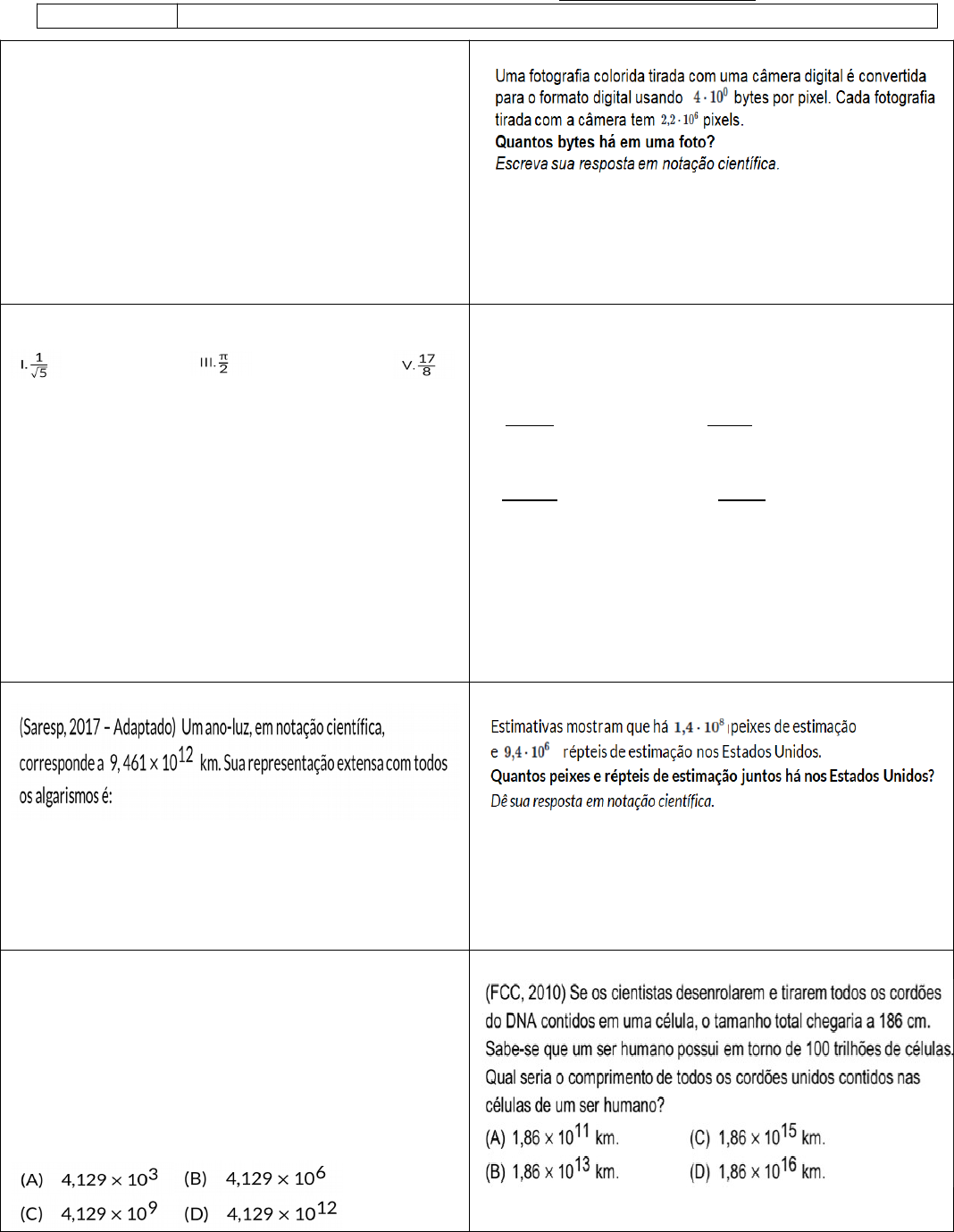 <p>JOGO DA MATEMÁTICA 1º serie EM (4ª rodada – 1º Bimestre)</p><p>GRUPO: ___________________________ DATA / /2024</p><p>Participante:</p><p>1) O tamanho esférico da partícula de um vírus SARS-COV-2 é 0,00000005 m. Esse número em notação científica corresponde a:</p><p>A) 5.10⁻⁵</p><p>B) 5.10⁻⁶</p><p>C) 5.10⁻⁷</p><p>D) 5.10⁻⁸</p><p>6)</p><p>A) 2,2 x 102</p><p>B) 8,8 x 10⁶</p><p>C) 6,2 x 10⁴</p><p>D) 4,4 x 10-⁶</p><p>2) Observe os números apresentados nos itens a seguir:</p><p>Os números irracionais estão apresentados nos itens:</p><p>(A) I, II e III.</p><p>(B) II, III e V.</p><p>(C) II e V.</p><p>(D) I, III e IV.</p><p>7) Pâmela ao dividir dois números inteiros positivos, obteve a dízima periódica 124,444... A fração geratriz dessa dízima pode ser identificada corretamente como:</p><p>a) c)</p><p>b) d)</p><p>3)</p><p>A) 9 461 000 000</p><p>B) 9, 461 000 000 000</p><p>C) 9461 000</p><p>D) 9 461 000 000 000</p><p>8)</p><p>A) 1,08 x 10⁹</p><p>B) 1,49 x 10⁶</p><p>C) 1,494 x 10⁸</p><p>D) 1,594 x 10-⁶</p><p>4) (ENEM – 2015) As exportações de soja do Brasil totalizaram 4,129 milhões de toneladas no mês de julho de 2012, e registraram um aumento em relação ao mês de julho de 2011, embora tenha havido uma baixa em relação ao mês de maio de 2012.</p><p>Disponível em: www.noticiasagricolas.com.br. Acesso em: 2 ago. 2012</p><p>A quantidade, em quilogramas, de soja exportada pelo Brasil no mês de julho de 2012 foi de:</p><p>9</p><p>5)</p><p>10) Bento aprendeu que há frações que geram dízimas periódica. Ao observar a fração Bento calculou corretamente que a dízimas periódica é:</p><p>A) 0,06111...</p><p>B) 0,05777...</p><p>C) 0,577...</p><p>D) 0,6111...</p><p>(</p><p>5</p><p>)</p><p>image5.png</p><p>image6.png</p><p>image7.png</p><p>image8.png</p><p>image9.png</p><p>image10.png</p><p>image11.png</p><p>image12.png</p><p>image1.png</p><p>image2.png</p><p>image3.png</p><p>image4.png</p>