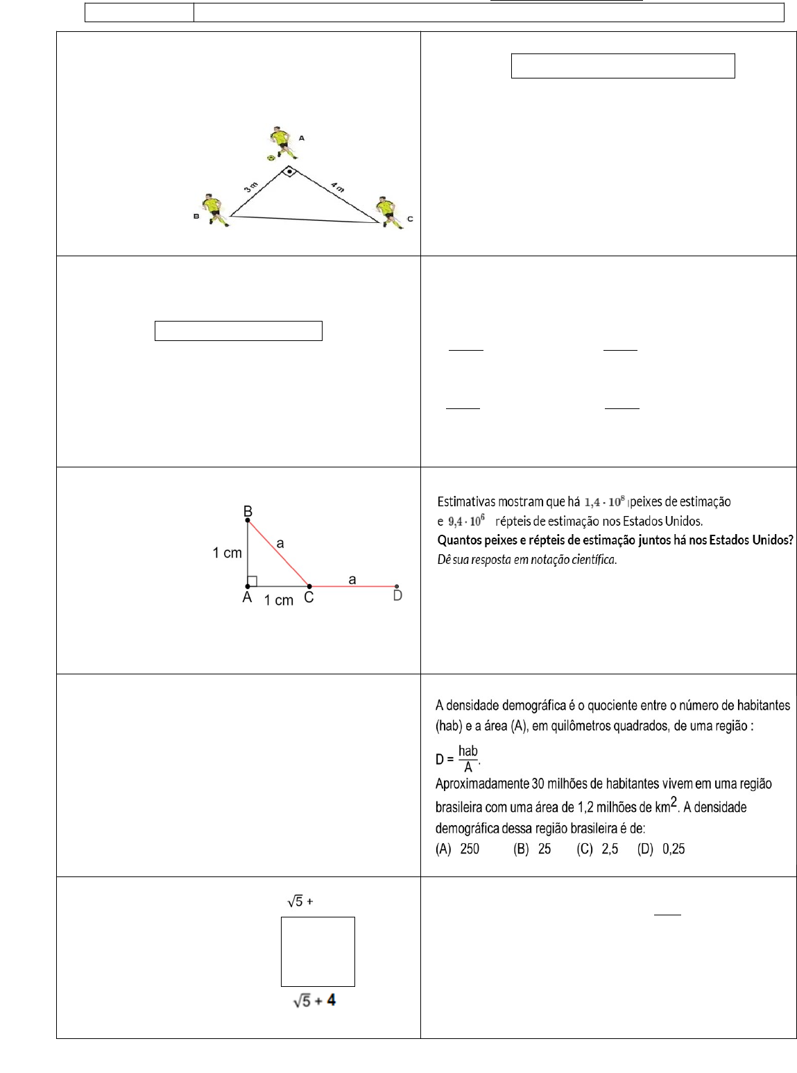 <p>JOGO DA MATEMÁTICA 1º serie EM (6ª rodada – 1º Bimestre)</p><p>GRUPO: ___________________________ DATA / /2024</p><p>Participante:</p><p>1) (Instituto Avança São Paulo) Em uma jogada ensaiada, o jogador A passa a bola para o jogador B, que passa para o jogador C. Considerando que a trajetória da bola é linear e eles estão parados em seus lugares, qual é o total da distância percorrida pela bola nessa jogada?</p><p>A) 3 m</p><p>B) 4 m</p><p>C) 5 m</p><p>D) 7 m</p><p>E) 8 m</p><p>6) Observe a operação apresentada no quadro abaixo.</p><p>3,5 × 10⁻⁵ + 0,014 × 10⁻²</p><p>O resultado dessa operação, expresso em notação científica, é:</p><p>A) 3,514 × 10⁻⁷.</p><p>B) 3,500014 × 10⁻⁵.</p><p>C) 1,75 × 10⁻⁴.</p><p>D) 1,75 × 10⁰ .</p><p>2) Observe a expressão apresentada no quadro abaixo.</p><p>3² × 3⁻⁷× 3⁸ × 10⁵</p><p>O resultado dessa expressão, em notação científica, é: A) 3,0 × 10⁸.</p><p>B) 9,0 × 10⁵.</p><p>C) 27 × 10⁵.</p><p>D) 2,7 × 10⁶.</p><p>7) Pâmela ao dividir dois números inteiros positivos, obteve a dízima periódica 129,999... A fração geratriz dessa dízima pode ser identificada corretamente como:</p><p>a) c)</p><p>b) d)</p><p>3) Qual a medida do segmento AD, sabendo que os seguimentos BC e CD têm as mesmas medidas?</p><p>A) 1,4 cm</p><p>B) 1,0 cm</p><p>C) 2,4 cm</p><p>D) 2,0 cm</p><p>8)</p><p>A) 1,08 x 10⁹</p><p>B) 1,49 x 10⁶</p><p>C) 1,494 x 10⁸</p><p>D) 1,594 x 10-⁶</p><p>4) Um automóvel partiu da cidade do Recife às 10h e chegou na cidade de Natal às 17h. Ele percorreu 290 km. Qual foi a velocidade média desse automóvel?</p><p>A) 47,7 km/h</p><p>B) 75,5 km/h</p><p>C) 41,4 km/h</p><p>D) 39,7 km/h</p><p>9</p><p>5) Qual o valor aproximado da área de um quadrado que tenha a medida dos lados de 4</p><p>A) 27,50 cm</p><p>B) 39,00 cm</p><p>C) 24,70 cm</p><p>D) 36,0 cm</p><p>10) Bento aprendeu que há frações que geram dízimas periódica. Ao observar a fração Bento calculou corretamente que a dízimas periódica é:</p><p>A) 0,06111...</p><p>B) 0,6111...</p><p>C) 0,06444...</p><p>D) 0,6444...</p><p>(</p><p>5</p><p>)</p><p>image5.png</p><p>image6.png</p><p>image1.png</p><p>image2.png</p><p>image3.png</p><p>image4.png</p>