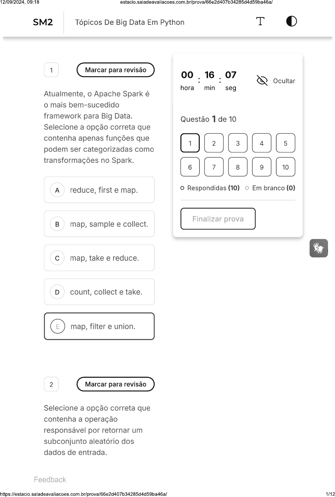 <p>12/09/2024, 09:18 estacio.saladeavaliacoes.com.br/prova/66e2d407b34285d4d59ba46a/ SM2 Tópicos De Big Data Em Python T 1 Marcar para revisão 00 : 16 07 Ocultar hora min seg Atualmente, o Apache Spark é o mais bem-sucedido framework para Big Data. Questão 1 de 10 Selecione a opção correta que contenha apenas funções que 1 2 3 4 5 podem ser categorizadas como transformações no Spark. 6 7 8 9 10 A reduce, first e map. Respondidas (10) Em branco (0) Finalizar prova B map, sample e collect. C map, take e reduce. D count, collect e take. E map, filter e union. 2 Marcar para revisão Selecione a opção correta que contenha a operação responsável por retornar um subconjunto aleatório dos dados de entrada. Feedback 1/12</p><p>12/09/2024, 09:18 A filter B random C mapRandom D distinct E sample 3 Marcar para revisão PySpark caracteriza-se como uma biblioteca Spark responsável por executar programas usando recursos do Apache Spark. Selecione a opção correta que contenha itens que são pré-requisitos de instalação para utilização do PySpark. A Hadoop e Spark B Casandra e Spark C Java e Python 2/12</p><p>12/09/2024, 09:18 estacio.saladeavaliacoes.com.br/prova/66e2d407b34285d4d59ba46a/ D Python e Escala E Java e R 4 Marcar para revisão A visualização dos dados é fundamental no processo de análise, interpretação e obtenção de conhecimento. Dentre as visualizações mais adequadas para dados numéricos estão: I - Histograma - Gráfico de Dispersão III - Gráfico de Pizza Analisem as alternativas listadas e assinalem a correta. A Apenas e III B Apenas e III C Apenas e D Apenas III E As alternativas I, II e III 3/12</p><p>12/09/2024, 09:18 5 Marcar para revisão Luís planeja começar um projeto particular visando construir um módulo de análise de dados. Primeiramente, ele deseja começar por um módulo de coleta de dados. Para que ele possa obter um padrão organizado de criação de projeto, qual é a sequência desejável de passos que esperamos que Luís siga? 4/12</p><p>12/09/2024, 09:18 Criar uma pasta para acomodar seu projeto; Levantar um virtualenv através do venv; Instalar as dependências com as quais ele quer trabalhar através do A pip install; congelar as mesmas no requirements.txt através do pip freeze; criar uma pasta para o módulo de coleta e dentro dela criar um para a lógica do módulo. Criar uma pasta para acomodar seu projeto; Instalar as dependências com as quais ele quer trabalhar através do B pip install; criar uma pasta para o módulo de coleta e dentro dela criar um arquivo __init_.py em branco e outro para a lógica do módulo. 5/12</p><p>12/09/2024, 09:18 estacio.saladeavaliacoes.com.br/prova/66e2d407b34285d4d59ba46a/ Criar uma pasta para acomodar seu projeto; Instalar as dependências com as quais ele quer trabalhar através do pip install; congelar as mesmas no C requirements.txt através do pip freeze; criar uma pasta para o módulo de coleta e dentro dela criar um arquivo __init_.py em branco e outro para a lógica do módulo. Criar uma pasta para acomodar seu projeto; Levantar um virtualenv através do venv; Instalar as dependências com as quais ele quer trabalhar através do pip install; congelar as D mesmas no requirements.txt através do pip freeze; criar uma pasta para o módulo de coleta e dentro dela criar um arquivo __init_.py em branco e outro para a lógica do módulo. 6/12</p><p>12/09/2024, 09:18 Criar uma pasta para acomodar seu projeto; Levantar um virtualenv através do Instalar as dependências com as quais ele quer trabalhar através do pip install; congelar as E mesmas no requirements.txt através do pip freeze; criar uma pasta para o módulo de coleta e dentro dela criar um arquivo - _init_.py com a lógica do módulo. 6 Marcar para revisão Gabriel entrou recentemente em uma empresa de gestão de fundos de investimento. No seu primeiro dia de trabalho, lhe é conferida a tarefa de buscar os relatórios do pessoal da contabilidade para fazer suas análises exploratórias. O departamento de contabilidade extrai os dados de seus relatórios de um SAP que retorna valores brutos de compras, quantidades de produtos etc. Então os contadores organizam, por agregação, informação relevante no 7/12</p><p>12/09/2024, 09:18 relatório em planilhas por eles desenvolvidos. Por questões de acesso e segurança, Gabriel só pode lidar com essas planilhas. Este tipo de coleta feita por Gabriel e pelos Contadores é respectivamente dos tipos: A Secundária; Primária. B Primária; Primária. C Secundária; Terciária. D Primária; Secundária. Secundária; E Secundária. 7 Marcar para revisão Qual o objetivo da inteligência artificial ao simular comportamentos humanos na máquina? 8/12</p><p>12/09/2024, 09:18 Fazer com que computadores A acessem a internet mais rápido. Incrementar o uso da B memória de longa duração do sistema. Otimizar algoritmos para que eles se C adaptem a contextos não previamente codificados. Melhorar a capacidade de D processamento de dados do sistema. Viabilizar a E computação paralela. 8 Marcar para revisão Dentre as inúmeras bibliotecas da linguagem Python, qual destas é a que abstrai conceitos de engenharia de aprendizado de máquina e implementa modelos de ML? 9/12</p><p>12/09/2024, 09:18 estacio.saladeavaliacoes.com.br/prova/66e2d407b34285d4d59ba46a/ A BeautifulSoup B Scikit-Learn C Numpy D Pandas E 9 Marcar para revisão Os componentes do Spark têm como objetivo facilitar o desenvolvimento de projetos com finalidades específicas. Nesse sentido, selecione a opção que contém o componente responsável por estabelecer uma conexão com o Cluster. A SparkSession B DataFrame C RDD 10/12</p><p>12/09/2024, 09:18 D SparkContext E Spark.Catalog 10 Marcar para revisão Sobre o Pandas DataFrame, o que podemos afirmar? - É o coletivo de séries temporais pandas.Series a estrutura de dados que representa os dados em painel - uma matriz conjunto de vetores - bloco fundamental da análise de da