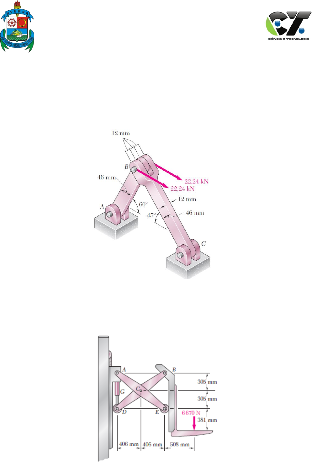 <p>UNIVERSIDADE FEDERAL RURAL DO SEMI-ÁRIDO - UFERSA</p><p>CENTRO DE ENGENHARIAS – CE</p><p>DEPARTAMENTO DE ENGENHARIA E TECNOLOGIA – DET</p><p>BACHARELADO EM CIÊNCIA E TECNOLOGIA – BCT MOSSORÓ</p><p>DISCIPLINA: RESISTÊNCIA DOS MATERIAIS 1</p><p>1ª AVALIAÇÃO</p><p>1 – Duas forças horizontais de 22,24 kN são aplicadas ao pino B do conjunto mostrado na figura. Sabendo que é</p><p>utilizado um pino de 20,32 mm de diâmetro em cada conexão, determine o valor máximo da tensão normal média (a)</p><p>na haste AB, (b) na haste BC e (c) a tensão de cisalhamento média no pino C.</p><p>2 – Um sistema constituido de barras e cilindro hidráulico controla a posição dos garfos de uma empilhadeira. A carga</p><p>suportada pelo sistema mostrado na figura é 6670 N. Sabendo que a espessura do elemento BD é 15,88 mm,</p><p>determine (a) a tensão de cisalhamento média no pino de 12,5 mm de diâmetro em B e (b) a tensão de esmagamento</p><p>em B do elemento BD.</p><p>UNIVERSIDADE FEDERAL RURAL DO SEMI-ÁRIDO - UFERSA</p><p>CENTRO DE ENGENHARIAS – CE</p><p>DEPARTAMENTO DE ENGENHARIA E TECNOLOGIA – DET</p><p>BACHARELADO EM CIÊNCIA E TECNOLOGIA – BCT MOSSORÓ</p><p>DISCIPLINA: RESISTÊNCIA DOS MATERIAIS 1</p><p>3 – (a) O elemento ABC, suportado por um pino em C e por um cabo BD, foi projetado para suportar uma carga P de</p><p>16 kN conforme mostrado. Sabendo que a carga limite para o cabo BD é de 100 kN, determine o coeficiente de</p><p>segurança com relação à falha do cabo. (b) Sabendo que a carga limite no cabo BD é de 100 kN e que o coeficiente de</p><p>segurança exigido para a falha do cabo é de 3,2, determine a intensidade do maior esforço P que pode ser aplicado</p><p>com segurança conforme o indicado para o elemento ABC.</p><p>4 – Na estrutura mostrada, é utilizado um pino de 8 mm de diâmetro em A e pinos de 12 mm de diâmetro em B e D.</p><p>Sabendo que o limite da tensão de cisalhamento é 100 MPa em todas as conexões e que o limite da tensão normal é</p><p>250 MPa em cada um dos dois vínculos que conectam B e D, determine a carga P admissível se adotarmos um</p><p>coeficiente global de segurança de 3,0.</p><p>UNIVERSIDADE FEDERAL RURAL DO SEMI-ÁRIDO - UFERSA</p><p>CENTRO DE ENGENHARIAS – CE</p><p>DEPARTAMENTO DE ENGENHARIA E TECNOLOGIA – DET</p><p>BACHARELADO EM CIÊNCIA E TECNOLOGIA – BCT MOSSORÓ</p><p>DISCIPLINA: RESISTÊNCIA DOS MATERIAIS 1</p><p>5 – Parte de uma ligação de controle para um avião consiste em um elemento rígido CBD e um cabo flexível AB. (a) Se</p><p>uma força for aplicada à extremidade D do elemento e provocar uma rotação Ɵ = 0,3°, determine a deformação normal</p><p>no cabo. Em sua posição original, o cabo não está esticado. (b) Se uma força for aplicada à extremidade D do elemento</p><p>e provocar uma deformação normal no cabo de 0,0035 mm/mm, determine o deslocamento do ponto D. Em sua</p><p>posição original, o cabo não está esticado.</p>