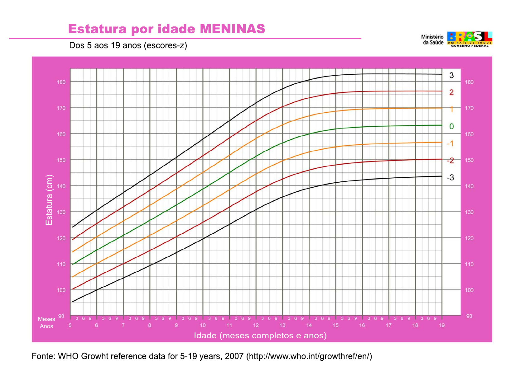 <p>Estatura por idade MENINAS Ministério da Saúde UM PAIS DE TODOS GOVERNO FEDERAL Dos 5 aos 19 anos (escores-z) 3 180 180 2 1 170 170 0 160 160 -1 -2 150 150 -3 140 140 130 130 120 120 110 110 100 100 90 90 9 3 9 3 6 3 6 9 3 6 9 Meses 369 369 3 6 9 3 6 9 3 6 9 3 9 369 3 6 9 3 6 9 3 6 Anos 5 6 7 8 9 10 11 12 13 14 15 16 17 18 19 Idade (meses completos e anos) Fonte: WHO Growht reference data for 5-19 years, 2007</p>