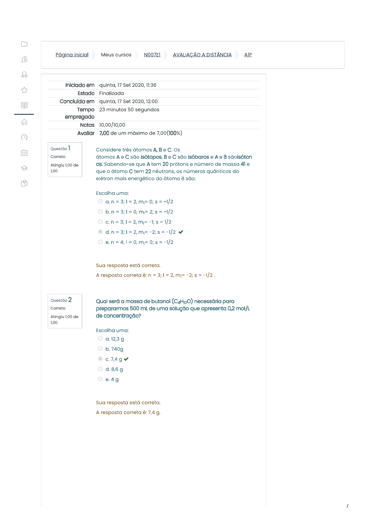 <p>Página inicial Meus cursos N007E1 AVALIAÇÃO A DISTÂNCIA Iniciado em quinta, 17 Set 2020, 11:36 Estado Finalizada Concluída em quinta, 17 Set 2020, 12:00 Tempo 23 minutos 50 segundos empregado Notas 10,00/10,00 7,00 de um máximo de 7,00 (100%) Questão 1 Considere três átomos A, B e C. Os Correto átomos A e C são isótopos, B e C são isóbaros e A e B sãoisóton Atingiu 1,00 de Sabendo-se que A tem 20 prótons e número de massa 41 e 1,00 que o átomo C tem 22 nêutrons, os números quânticos do elétron mais energético do átomo B são: Escolha uma: 1/2 S = -1/2 = -1/2 Sua resposta está correta. A resposta Questão 2 Qual será a massa de butanol (C4H10O) necessária para Correto prepararmos 500 mL de uma solução que apresenta 0,2 mol/L Atingiu 1,00 de de concentração? 1,00 Escolha uma: a. 12,3 g b. 740g C. 7,4 g d. 8,6 g e. 4 g Sua resposta está correta. A resposta correta é: 7,4 g. /</p><p>Questão 3 Quais são as soluções aquosas contendo uma única Correto substância dissolvida que podem apresentar corpo de fundo Atingiu 1,00 de dessa substância? 1,00 Escolha uma: a. saturadas e supersaturadas. b. insaturadas diluídas. C. somente as supersaturadas. d. insaturadas concentradas. somente as saturadas. Sua resposta está correta. A resposta correta é: somente as saturadas.. Questão 4 Determine a molaridade de uma solução que apresenta 0,8 Correto mol de sacarose (C12H22O11) em 200 mL de solução. Atingiu 1,00 de 1,00 Escolha uma: a. 4 mol/L b. 14 mol/L C. 24 mol/L d. 8 mol/L e. 400 mol/L Sua resposta está correta. A resposto correta é: 4 Questão 5 Átomos neutros de um certo elemento representativo M Correto apresentam dois elétrons em sua camada de valência. As Atingiu 1,00 de fórmulas corretas para seu óxido normal e brometo são, 1,00 respectivamente: (Dados: O= 6A e Br = 7A.) Escolha uma: a. M2O e MBr2 b. M2O e MBr C. MO e MBr2 d. M2O2 e M2Br e. MO2 e MBr2 Sua resposta está correta. A resposta correta é: MO e MBr2. /</p><p>Questão 6 Considerando a equação química: Correto + 2 NaOH Atingiu 1,00 de 1,00 os reagentes e produtos pertencem, respectivamente, às funções: Escolha uma: a. sal, base, sal e hidreto b. óxido, base, óxido e hidreto C. ácido, sal, óxido e hidreto d. base, ácido, óxido e óxido e. óxido, base, sal e Sua resposta está correta. A resposta correta é: óxido, base, sal e óxido. Questão 7 Um dos elementos químicos que tem se mostrado muito Correto eficiente no combate ao câncer de próstata é o Selênio Atingiu 1,00 de Com base na Tabela de Classificação Periódica dos Elementos, 1,00 os símbolos de elementos com propriedades químicas semelhantes ao Selênio são: Escolha uma: a. Br, b. As, Br, Kr C. P, As, Sb d. Te, S, Po e. Na , K, Hg Sua resposta está correta. A resposta correta é: Te, S, Po Questão 8 A argamassa, que é um produto usado por pedreiros para Correto assentar tijolos, é uma mistura de cal areia e água. A Atingiu 1,00 de cal extinta (hidróxido de cálcio) combina-se com o gás 1,00 carbônico do ar, produzindo carbonato de cálcio, que endurece e prende a areia e, consequentemente, os tijolos. A equação corretamente balanceada que representa a reação entre a cal extinta e o gás carbônico é: Dado: Ca Escolha uma: C. 2CaOH + CO2 d. CO2 e. 2CaHCO3 + CaO 3CaCO3 + H2O Sua resposta está correta. A resposta correta é: + CO2</p><p>Questão 9 Misturou-se 15 mL de uma solução KCIO3 0,25M com 35 mL de Correto água. A concentração final da solução em molaridade é: Atingiu 1,00 de 1,00 Escolha uma: a. 0,075 M b. 0,75 M C. 0,25 M d. 0,025 M Sua resposta está correta. A resposta correta é: 0,075 M. Questão 10 Na BR-381, na região central de Minas Gerais, houve um Correto acidente com uma carreta que transportava H2SO4. Devido ao Atingiu 1,00 de acidente, ocorreu vazamento do material transportado 1,00 atingindo Rio Piracicaba. Acesso em: 20.03.2015. Adaptado. A água desse rio, na região do acidente, apresentou-se Escolha uma: a. neutra, pela ionização do ácido na água. b. ácida, pela ionização do ácido na água. C. ácida, pela neutralização da água. d. ácida, pela neutralização da água. e. básica, pela dissociação da base na água. Sua resposta está correta. A resposta correta é: ácida, pela ionização do ácido na água..</p>