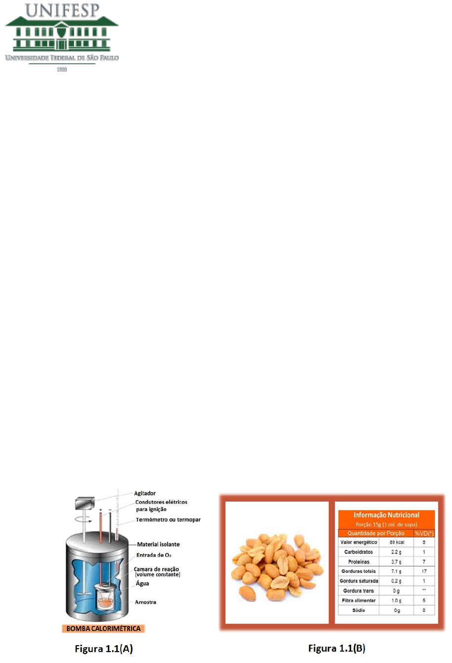 <p>UNIVERSIDADE FEDERAL DE SÃO PAULO – CAMPUS DIADEMA</p><p>RUA ARTUR RIEDEL, 275</p><p>JD. ELDORADO – DIADEMA/SP</p><p>CEP 09972-270</p><p>Profa. Carolina Vautier Teixeira Giongo</p><p>QUÍMICA GERAL – ENGENHARIA QUÍMICA – 1º SEMESTRE 2022</p><p>Avaliação II</p><p>Esta Avaliação vale 11 pontos e pode ser feita com consulta e discussão com os colegas e com o docente.</p><p>Responda à mão e com letra legível (lápis forte) as seguintes questões, apresentando os cálculos</p><p>realizados e considerações feitas para a obtenção das respostas. Ao final de cada questão, apresente as</p><p>fontes consultadas para a resolução, assim como os nomes dos colegas/docente com os quais discutiu a</p><p>questão. Não se esqueçam das unidades de medida, por favor! A avaliação deve ser postada até</p><p>07/08/2022, no espaço destinado. Em caso de dúvidas sobre os enunciados das questões ou suspeitas</p><p>de equívocos nos mesmos, não hesitem em entrar em contato comigo.</p><p>Questão 1. (3,0) – Termodinâmica</p><p>1.1- (1,0) Uma amostra de 1,0 g de amendoim sem casca e sem sal foi queimada em atmosfera de oxigênio</p><p>(P = 1 bar) em uma bomba calorimétrica a volume constante, tendo-se observado uma variação de 3,0</p><p>oC na temperatura da água que circunda a câmara de combustão. No calorímetro há 2000 g de água</p><p>envolvendo a câmara de combustão, sendo o calor específico da água igual a 4,184 J/g.oC. (a) (0,2)</p><p>Explique como funciona a bomba calorimétrica a volume constante (calorímetro a volume constante)</p><p>apresentada na figura abaixo, indicando as interfaces onde é permitida e onde é impedida a troca de</p><p>calor. (b) (0,4) Calcule o calor liberado pela queima de 1,0 g do alimento. (b) (0,2) Esse calor diz respeito</p><p>a U ou H? Justifique. (c) (0,3) Que conteúdo de energia corresponde a uma porção de 15 g de</p><p>amendoim em kcal? Compare o valor obtido com o valor fornecido pelo fabricante do amendoim</p><p>abaixo</p><p>1.2 - (1,0) Um calorímetro a pressão constante foi utilizado no intuito de determinar o calor de</p><p>neutralização do HCl por NaOH. Na calibração deste calorímetro, foi constatado que 100 mL de solução</p><p>liberam 1,88 kJ de calor com uma variação de temperatura de 4,51 oC. Na sequência, 50 mL de 1,0 mol.L-1</p><p>de HCl(aq) e 50 mL de 1,0 mol.L-1 de NaOH(aq) foram misturados neste calorímetro, havendo um aumento</p><p>http://www.unifesp.br/servicos/sobre.htm</p><p>UNIVERSIDADE FEDERAL DE SÃO PAULO – CAMPUS DIADEMA</p><p>RUA ARTUR RIEDEL, 275</p><p>JD. ELDORADO – DIADEMA/SP</p><p>CEP 09972-270</p><p>Profa. Carolina Vautier Teixeira Giongo</p><p>de 6,5 oC na temperatura do sistema. (a) (0,25) Obtenha o calor envolvido nessa reação, bem como a</p><p>variação de energia interna e a variação de entalpia para a reação de neutralização do HCl pelo NaOH? (b)</p><p>(0,3) Caso a calibração do calorímetro não houvesse sido feita, como poderia ser estimado o calor para</p><p>essa reação e que considerações precisariam ser feitas? Apresente o novo valor obtido para o calor e</p><p>compare com o valor obtido no item (a). (c) (0,15) A energia interna dos produtos da reação é maior ou</p><p>menor que a energia dos reagentes? Justifique a resposta. (d) (0,3) Usando as variações de entalpia molar</p><p>de formação (Hf</p><p>o) dos reagentes e dos produtos da reação de neutralização do HCl pelo NaOH</p><p>HCl(aq) + NaOH(aq) → NaCl(aq) + H2O(l) Ho</p><p>reação =?</p><p>calcule a variação da entalpia padrão para esta reação (Ho</p><p>reação) e compare com o valor obtido no item</p><p>(a). Valores de Hf</p><p>o podem ser obtidos nos livros de química geral e/ou físico-química.</p><p>1.3 - (1,0) Analise as afirmações abaixo, decidindo se são corretas ou incorretas, justificando qualquer que</p><p>seja sua resposta, seja correta ou incorreta:</p><p>(a) (0,2) Um gás que se expande contra o vácuo à temperatura constante (processo isotérmico), realiza</p><p>trabalho de expansão, o que resulta em uma diminuição de sua energia interna (U < 0)</p><p>(b) (0,2) Para um sistema com fronteiras rígidas e diatérmicas, a variação de energia interna é nula</p><p>(U = 0)</p><p>(c) (0,2) Nos processos espontâneos que ocorrem em sistemas isolados, a energia interna é constante mas</p><p>a entropia aumenta (S > 0)</p><p>(d) (0,2) Calor é uma forma de transferência de energia caótica que resulta de diferenças de temperatura</p><p>(e) (0,2) Quando a energia é transferida do sistema para as vizinhanças sob forma de calor, tanto a variação</p><p>da energia interna quanto a variação de entropia do sistema são positivas (Usistema > 0 e Ssistema > 0)</p><p>Questão 2. (4,0) Ácidos, Bases e Tampões</p><p>2.1- (1,6) (a) (0,4) Escreva as equações de desprotonação (perda de prótons) de H2O e HCO3</p><p>- (ânion</p><p>bicarbonato) em água, indicando as bases conjugadas desses ácidos. Escreva os equilíbrios protonação</p><p>(ganho de prótons) para H2O e HCO3</p><p>- em água, indicando os ácidos conjugados dessas bases. Como você</p><p>classificaria o comportamento acido-base da água e do HCO3</p><p>-? (b) (0,4) Escreva a equação para a reação</p><p>entre a base fraca NH3 e o ácido forte HCl. Calcule o pH da solução resultante da mistura de 50 mL de uma</p><p>solução aquosa de HCl 0,30 mol.L-1 com 50 mL de uma solução aquosa 0,30 mol.L-1 de NH3. Por que o pH</p><p>dessa mistura não é igual a 7? (c) (0,3) Calcule o pH de uma solução aquosa 0,30 mol.L-1 de fluoreto de</p><p>sódio (NaF). (d) (0,2) Calcule o pH de uma solução aquosa 0,30 mol.L-1 de cloreto de sódio (NaCl). (e) (0,3)</p><p>Compare os valores de pH obtidos nos itens (c) e (d), justificando eventuais diferenças.</p><p>http://www.unifesp.br/servicos/sobre.htm</p><p>UNIVERSIDADE FEDERAL DE SÃO PAULO – CAMPUS DIADEMA</p><p>RUA ARTUR RIEDEL, 275</p><p>JD. ELDORADO –