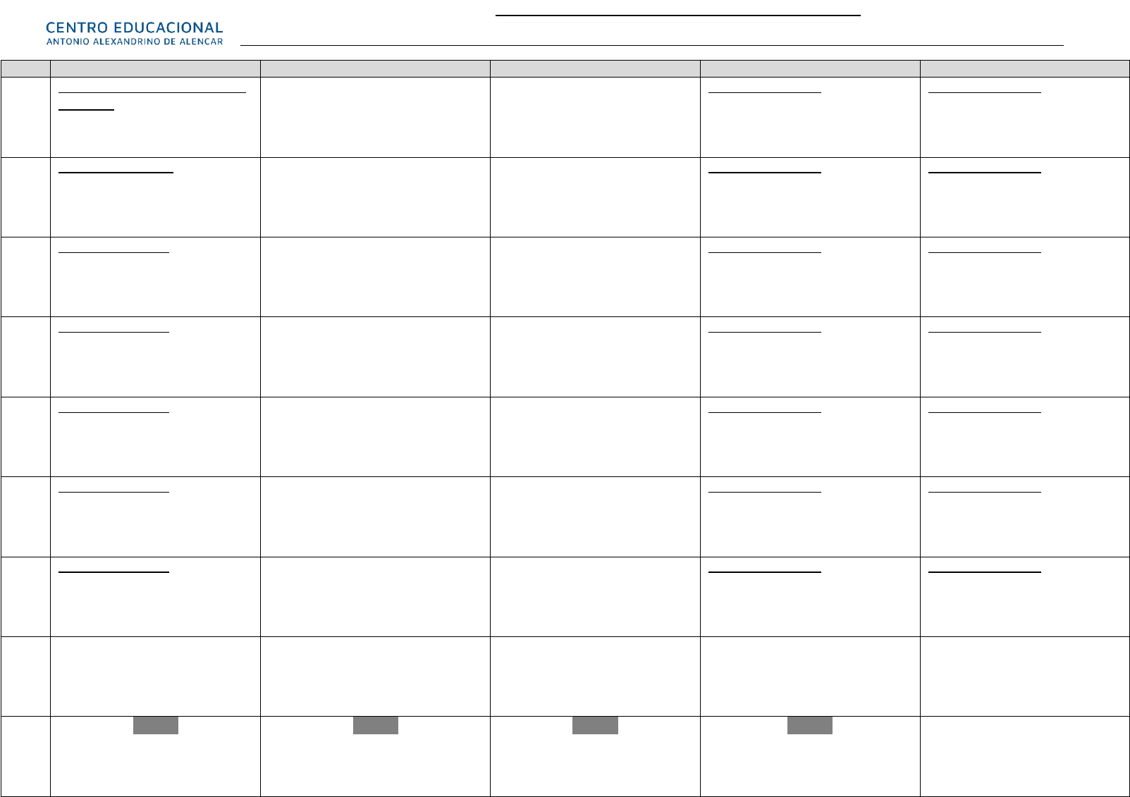 <p>MAPEAMENTO 3º BIMESTRE 2024 – Data _____/_____/_____</p><p>Turma: 6º ao 9º ano Professor(a) _________________________disciplina(s)_________ Inglês e Espanhol____________________________</p><p>DIAS</p><p>SEGUNDA</p><p>TERÇA</p><p>QUARTA</p><p>QUINTA</p><p>SEXTA</p><p>1ª semana</p><p>05/08 a 0908</p><p>5º ano de Espanhol: A beleza do meu pais:</p><p>· Los substantivos Y adjetivos</p><p>3º ano de Espanhol</p><p>· Conhecendo os articulos</p><p>4º ano de Espanhol</p><p>· Adijetivos</p><p>2ª semana</p><p>12/08 a 16/08</p><p>5º ano de Espanhol:</p><p>· Falando sobre trabalho</p><p>3º ano de Espanhol</p><p>· Los digrafos</p><p>4º ano de Espanhol</p><p>· Género dos substantivos</p><p>3ª semana</p><p>19/08 a 23/08</p><p>5º ano de Espanhol</p><p>· Conhecendo os verbos</p><p>3º ano de Espanhol</p><p>· Minha rotina</p><p>4º ano de Espanhol</p><p>· As interjeições</p><p>4ª semana</p><p>26/08 a 30/08</p><p>5º ano de Espanhol</p><p>· Gêneros textuais</p><p>3º ano de Espanhol</p><p>· As profissões</p><p>4º ano de Espanhol</p><p>· O número dos substantivos</p><p>5ª semana</p><p>02/09 a 06/09</p><p>5º ano de Espanhol</p><p>· Conhecendo o verbo falar</p><p>3º ano de Espanhol</p><p>· Pronomes Personales</p><p>4º ano de Espanhol</p><p>· Verbos ser e estar</p><p>6ª semana</p><p>09/09 a 13/09</p><p>5º ano de Espanhol</p><p>· Verbo ir</p><p>3º ano de Espanhol</p><p>· Falando sobre a cultura dos países que falam espanhol</p><p>4º ano de Espanhol</p><p>· Cultura dos Países que falam espanhol</p><p>7ª semana</p><p>16/09 a 20/09</p><p>5º ano de Espanhol</p><p>· Os porque</p><p>3º ano de Espanhol</p><p>· Curiosidades culturais</p><p>4º ano de Espanhol</p><p>· Minha rotina</p><p>8ª semana</p><p>23/09 a 2709</p><p>DINÂMICAS</p><p>ATIVIDADES</p><p>DINÂMICAS</p><p>ATIVIDADES</p><p>DINÂMICAS</p><p>ATIVIDADES</p><p>9ª semana</p><p>30/09 a 04/10</p><p>Revisão</p><p>Revisão</p><p>Revisão</p><p>Revisão</p><p>Avaliação</p><p>10ª semana</p><p>07/10 a 11/10</p><p>Avaliação</p><p>Avaliação</p><p>Avaliação</p><p>Avaliação</p><p>Avaliação</p><p>image1.png</p>
