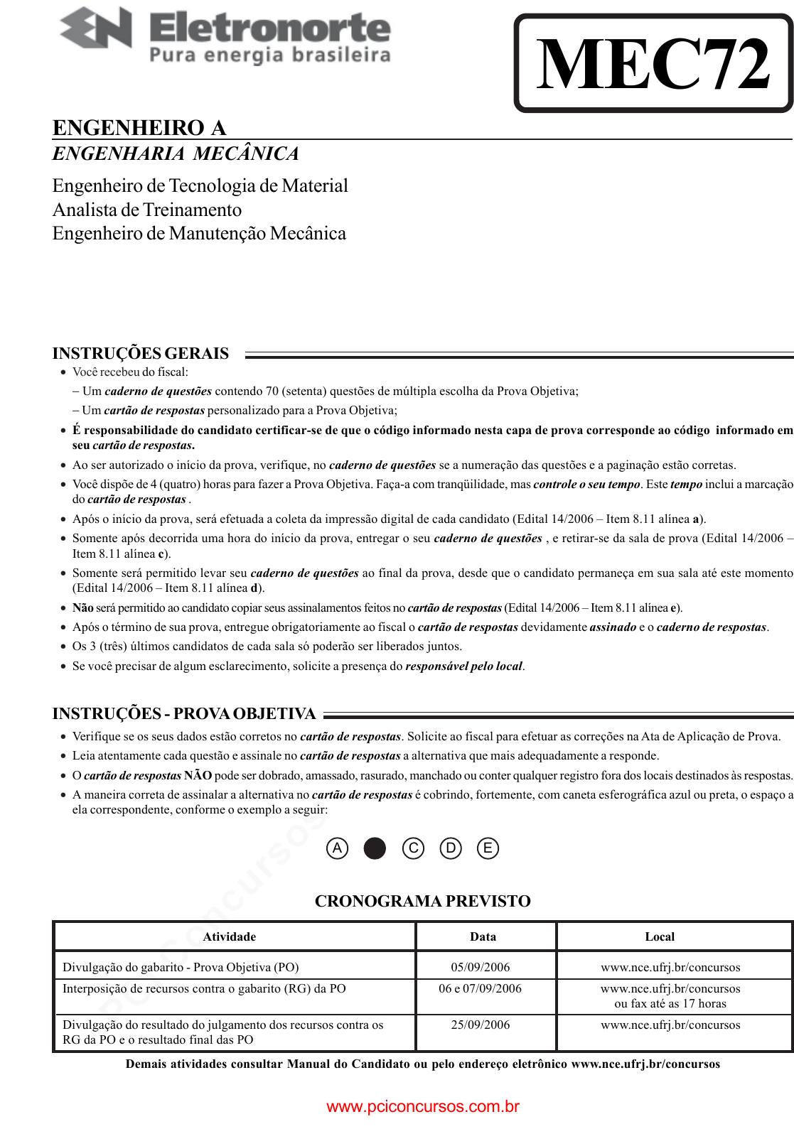<p>pcimarkpci MjgwNDowMTRkOjVjNDM6OGUwZTo3YTA0OmUzZmY6ZmU2ZjozZGFm:VGh1LCAxMiBTZXAgMjAyNCAwMTo1MTozMyAtMDMwMA==</p><p>www.pciconcursos.com.br</p><p>ENGENHEIRO A</p><p>ENGENHARIA MECÂNICA</p><p>Engenheiro de Tecnologia de Material</p><p>Analista de Treinamento</p><p>Engenheiro de Manutenção Mecânica</p><p>MEC72</p><p>INSTRUÇÕES GERAIS</p><p>• Você recebeu do fiscal:</p><p>− Um caderno de questões contendo 70 (setenta) questões de múltipla escolha da Prova Objetiva;</p><p>− Um cartão de respostas personalizado para a Prova Objetiva;</p><p>• É responsabilidade do candidato certificar-se de que o código informado nesta capa de prova corresponde ao código informado em</p><p>seu cartão de respostas.</p><p>• Ao ser autorizado o início da prova, verifique, no caderno de questões se a numeração das questões e a paginação estão corretas.</p><p>• Você dispõe de 4 (quatro) horas para fazer a Prova Objetiva. Faça-a com tranqüilidade, mas controle o seu tempo. Este tempo inclui a marcação</p><p>do cartão de respostas .</p><p>• Após o início da prova, será efetuada a coleta da impressão digital de cada candidato (Edital 14/2006 – Item 8.11 alínea a).</p><p>• Somente após decorrida uma hora do início da prova, entregar o seu caderno de questões , e retirar-se da sala de prova (Edital 14/2006 –</p><p>Item 8.11 alínea c).</p><p>• Somente será permitido levar seu caderno de questões ao final da prova, desde que o candidato permaneça em sua sala até este momento</p><p>(Edital 14/2006 – Item 8.11 alínea d).</p><p>• Não será permitido ao candidato copiar seus assinalamentos feitos no cartão de respostas (Edital 14/2006 – Item 8.11 alínea e).</p><p>• Após o término de sua prova, entregue obrigatoriamente ao fiscal o cartão de respostas devidamente assinado e o caderno de respostas.</p><p>• Os 3 (três) últimos candidatos de cada sala só poderão ser liberados juntos.</p><p>• Se você precisar de algum esclarecimento, solicite a presença do responsável pelo local.</p><p>INSTRUÇÕES - PROVA OBJETIVA</p><p>• Verifique se os seus dados estão corretos no cartão de respostas. Solicite ao fiscal para efetuar as correções na Ata de Aplicação de Prova.</p><p>• Leia atentamente cada questão e assinale no cartão de respostas a alternativa que mais adequadamente a responde.</p><p>• O cartão de respostas NÃO pode ser dobrado, amassado, rasurado, manchado ou conter qualquer registro fora dos locais destinados às respostas.</p><p>• A maneira correta de assinalar a alternativa no cartão de respostas é cobrindo, fortemente, com caneta esferográfica azul ou preta, o espaço a</p><p>ela correspondente, conforme o exemplo a seguir:</p><p>A C D E</p><p>CRONOGRAMA PREVISTO</p><p>Atividade Data Local</p><p>Divulgação do gabarito - Prova Objetiva (PO) 05/09/2006 www.nce.ufrj.br/concursos</p><p>Interposição de recursos contra o gabarito (RG) da PO 06 e 07/09/2006 www.nce.ufrj.br/concursos</p><p>ou fax até as 17 horas</p><p>Divulgação do resultado do julgamento dos recursos contra os 25/09/2006 www.nce.ufrj.br/concursos</p><p>RG da PO e o resultado final das PO</p><p>Demais atividades consultar Manual do Candidato ou pelo endereço eletrônico www.nce.ufrj.br/concursos</p><p>www.pciconcursos.com.br</p><p>pcimarkpci MjgwNDowMTRkOjVjNDM6OGUwZTo3YTA0OmUzZmY6ZmU2ZjozZGFm:VGh1LCAxMiBTZXAgMjAyNCAwMTo1MTozMyAtMDMwMA==</p><p>www.pciconcursos.com.br</p><p>2</p><p>Concurso Público - 2006</p><p>LÍNGUA PORTUGUESA</p><p>TEXTO – UM BASTA A HIPOCRISIA</p><p>Rodrigo Constantino</p><p>Os fatos não deixam de existir pelo simples fato de</p><p>serem ignorados.</p><p>Aldous Huxley</p><p>Infelizmente, a hipocrisia abunda no mundo, principalmente nas</p><p>elites. Em troca do status de um nobre homem, pessoas vendem a</p><p>alma ao diabo, traindo escancaradamente sua própria consciência</p><p>e bom senso. A cretinice assume grau espantoso nos debates, e</p><p>qualquer um que esteja mais preocupado com a verdade que com</p><p>as aparências de suas intenções perde a paciência ao notar que</p><p>está dando murro em ponta de faca. O interesse dessa elite pérfida</p><p>não é a busca sincera pela verdade e resultados; mas, sim, o</p><p>conforto psíquico de apresentar ser bem intencionado. O</p><p>mensageiro que traz a notícia, que destaca os fatos verdadeiros,</p><p>que demonstra o absurdo das teorias românticas, esse é o culpado,</p><p>um insensível, egoísta. A hipocrisia, aliada à ignorância de muitos,</p><p>acaba vencendo a lógica e a verdade. A necessidade da mente</p><p>humana de acreditar em explicações simplistas, culpar fatores</p><p>exógenos e bodes expiatórios, e buscar conforto mesmo que na</p><p>mentira alimenta bastante essa hipocrisia. Esse texto é um apelo</p><p>para darmos um basta a isso.</p><p>São tantos exemplos de debates hipócritas que mal sei por onde</p><p>começar. Talvez o caso recente de cotas em universidades seja</p><p>interessante. Com a constatação da existência de muitos negros</p><p>miseráveis no país, logo surgem as soluções milagrosas, que</p><p>encobrem atrás de uma nobre embalagem um objetivo populista</p><p>eleitoreiro, que trará resultados catastróficos. Debater com</p><p>seriedade o tema poucos querem, pois envolve estudo, a clara</p><p>culpabilidade do próprio governo, maior causador da miséria que</p><p>vivemos, e medidas que depositam nos próprios indivíduos parte</p><p>da solução. Mais fácil confundirem correlação com causalidade, e</p><p>apontarem o racismo como culpado pela situação dos negros. E</p><p>assim partimos para a solução hipócrita das cotas, que representam</p><p>discriminação, injustiça e abuso de poder do governo. Os membros</p><p>da elite ficam satisfeitos com a aparência de que tal medida</p><p>representa um ato de justiça. Hipocrisia pura!</p><p>1 - O segundo período do texto, em sua relação argumentativa</p><p>com o primeir