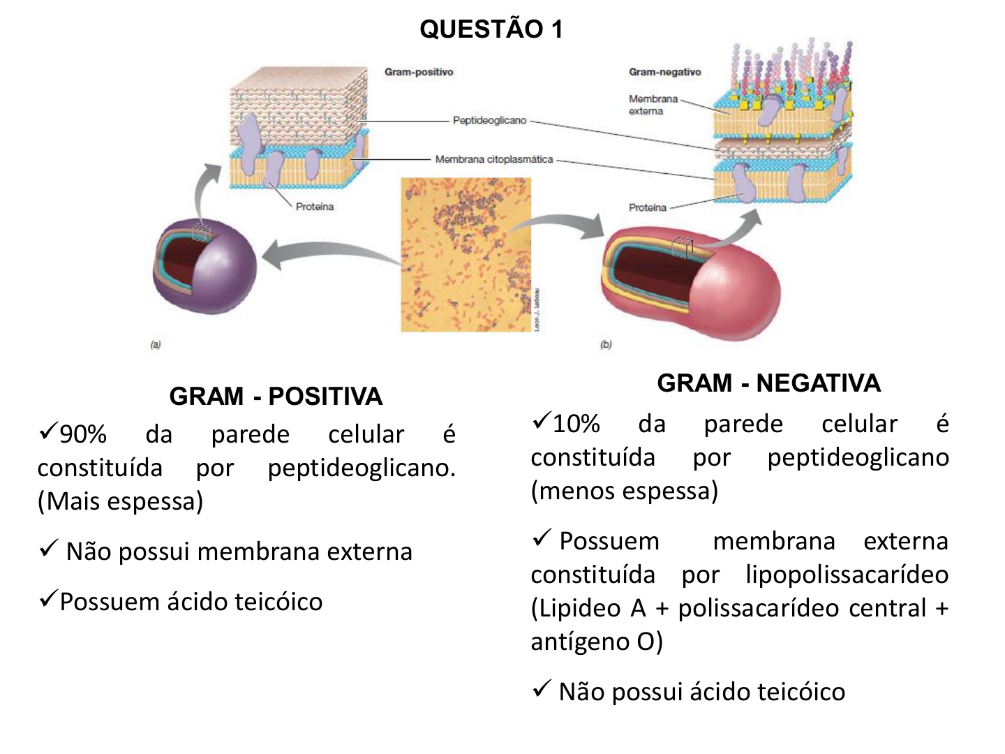 <p>✓90% da parede celular é</p><p>constituída por peptideoglicano.</p><p>(Mais espessa)</p><p>✓ Não possui membrana externa</p><p>✓Possuem ácido teicóico</p><p>✓10% da parede celular é</p><p>constituída por peptideoglicano</p><p>(menos espessa)</p><p>✓ Possuem membrana externa</p><p>constituída por lipopolissacarídeo</p><p>(Lipideo A + polissacarídeo central +</p><p>antígeno O)</p><p>✓ Não possui ácido teicóico</p><p>GRAM - POSITIVA</p><p>GRAM - NEGATIVA</p><p>QUESTÃO 1</p><p>um complexo insolúvel</p><p>de cristal violeta-iodo se</p><p>forma no interior da</p><p>célula.</p><p>Gram+ apresentam</p><p>paredes celulares</p><p>espessas, sendo</p><p>desidratada pelo álcool,</p><p>promovendo o</p><p>fechamento dos poros e</p><p>impedindo a remoção do</p><p>complexo insolúvel de</p><p>cristal violeta-iodo.</p><p>Nas bactérias gram-</p><p>negativas, o álcool</p><p>penetra rapidamente na</p><p>membrana externa rica</p><p>em lipídeos, extraindo o</p><p>complexo cristal violeta-</p><p>iodo da célula.</p><p>um complexo insolúvel</p><p>de cristal violeta-iodo se</p><p>forma no interior da</p><p>célula.</p><p>FUNGOS FILAMENTOSOS</p><p>Unidade estrutural = HIFA</p><p>Conjunto de hifas = MICÉLIO</p><p>Tipos morfológicos básicos</p><p>LEVEDURAS</p><p>Células arredondadas - Fungos unicelulares, não filamentosos,</p><p>caracteristicamente esféricas ou ovais.</p><p>Fungos Dimórficos</p><p>Apresenta as duas formas de crescimento.</p><p>O dimorfismo de fungos patogênicos é dependente de temperatura –</p><p>37°C, forma de levedura e sob temp de 25°C, forma de fungo</p><p>filamentoso.</p><p>QUESTÕES 2, 3, 4, 5, e 6</p><p>Quando encontram condições favoráveis ao seu crescimento, como:</p><p>calor, umidade persistente na superfície da pele, baixa de</p><p>imunidade ou uso de antibióticos sistêmicos por longo prazo</p><p>(alteram o equilíbrio da pele), defeitos imunológicos, imaturidade,</p><p>envelhecimento e desnutrição, exposição a uma grande quantidade</p><p>de esporos fungicos, tecidos traumatizados.</p><p>Mecanismos envolvidos em doenças fúngicas: invasão tecidual</p><p>(micose), produção de toxina, indução de hipersensibilidade.</p><p>Adaptações nutricionais</p><p>Os fungos são geralmente adaptados a ambientes que poderiam</p><p>ser hostis a bactérias.</p><p>✓ Os fungos crescem melhor em pH próximo a 5.</p><p>✓ Quase todos os fungos são aeróbios. A maioria das leveduras é</p><p>anaeróbia facultativa.</p><p>✓ A maioria dos fungos é mais resistente a pressão osmótica que as</p><p>bactérias, muitas consequentemente, podem crescer em</p><p>concentrações relativamente altas de açúcar e sal.</p><p>✓ Os fungos podem crescer sobre substancias com baixo grau de</p><p>umidade</p><p>Didaticamente, podemos dividir as micoses em grupos:</p><p>- Micoses superficiais</p><p>- Micoses cutâneas cutâneas dermatofitoses</p><p>- Micoses subcutâneas: pele e tecido conjuntivo</p><p>- Micoses sistêmicas: principalmente órgãos internos</p><p>- Micoses oportunistas</p><p>Classificação das micoses</p><p>Quando encontram condições favoráveis ao seu crescimento, como: calor,</p><p>umidade, baixa de imunidade ou uso de antibióticos sistêmicos por longo</p><p>prazo (alteram o equilíbrio da pele), estes fungos se reproduzem e passam</p><p>então a causar a doença.</p><p>PIEDRA BRANCA</p><p>Nódulos irregulares aderentes ao</p><p>pelo. Consistência pastosa e mole e</p><p>cor creme ao longo das hastes dos</p><p>pelos infectados.</p><p>PIEDRA PRETA</p><p>Nódulos fortemente aderidos aos</p><p>cabelos e que são</p><p>frequentemente confundidos com</p><p>pediculose (piolho). Diagnóstico</p><p>com microscopia direta em que se</p><p>verificam estruturas de</p><p>reprodução sexuada na lesão.</p><p>Pitiríase versicolor</p><p>As lesões tornam-se mais evidentes após exposição ao sol, em decorrência de um</p><p>contraste de cores, pois o local parasitado não se bronzeia. • •Surgem manchas</p><p>brancas, eritematosas ou acastanhadas, geralmente arredondadas e com</p><p>descamação fina. Normalmente atingem costas, peito, pescoço, face, e braços</p><p>(áreas de maior produção de oleosidade). As lesões não costumam coçar .</p><p>Malassezia furfur</p><p>Obs: o fungo e lipofilico, encontrado em</p><p>áreas do corpo ricas em glândulas</p><p>sebáceas. O fungo necessita de um meio</p><p>suplementado com ácidos graxos para seu</p><p>crescimento.</p><p>Tinea preta</p><p>Manchas escuras marrom ou negras, localizadas</p><p>na palma da mão ou planta dos pés. O fungo</p><p>produz melanina.</p><p>São doenças causadas por fungos denominados dermatófitos que acometem</p><p>a pele, os pelos e as unhas, e cuja característica é a sua afinidade pela</p><p>queratina presente nesses locais.</p><p>Habilidade de desagregar queratina para sua nutrição, atinge estrato córneo</p><p>da pele e seus anexos, pêlos, cabelos, unhas, barba, pé , mão e região</p><p>inguinal. São doenças comuns, frequentes em crianças e adultos,</p><p>acometendo a maioria dos idosos.</p><p>A transmissão ocorre por contato pessoal, com animais (cães, gatos) ou com a</p><p>terra. O agente mais comum é o Trichophyton rubrum, que causa as lesões</p><p>nas unhas, pés e virilha. O Microsporum canis, que parasita animais, como o</p><p>gato (que pode ser portador assintomático, ou seja, não apresentar os sinais</p><p>da doença) ou o cão (que em geral apresenta lesões com queda de pelo) pode</p><p>causar lesões na pele do corpo humano.</p><p>Tinea de corpo ("impingem") - No corpo caracteriza-se por</p><p>lesões com bordas bem definidas, avermelhadas</p><p>(eritematosas), descamativas (que descascam), em forma</p><p>anular (lembram um anel) e que normalmente coçam.</p><p>Tinha do pé - É muito comum entre os indivíduos que</p><p>utilizam sapatos fechados, pode ocorrer com lesões</p><p>agudas no vão dos dedos, caracterizadas pelo mau</p><p>ch
