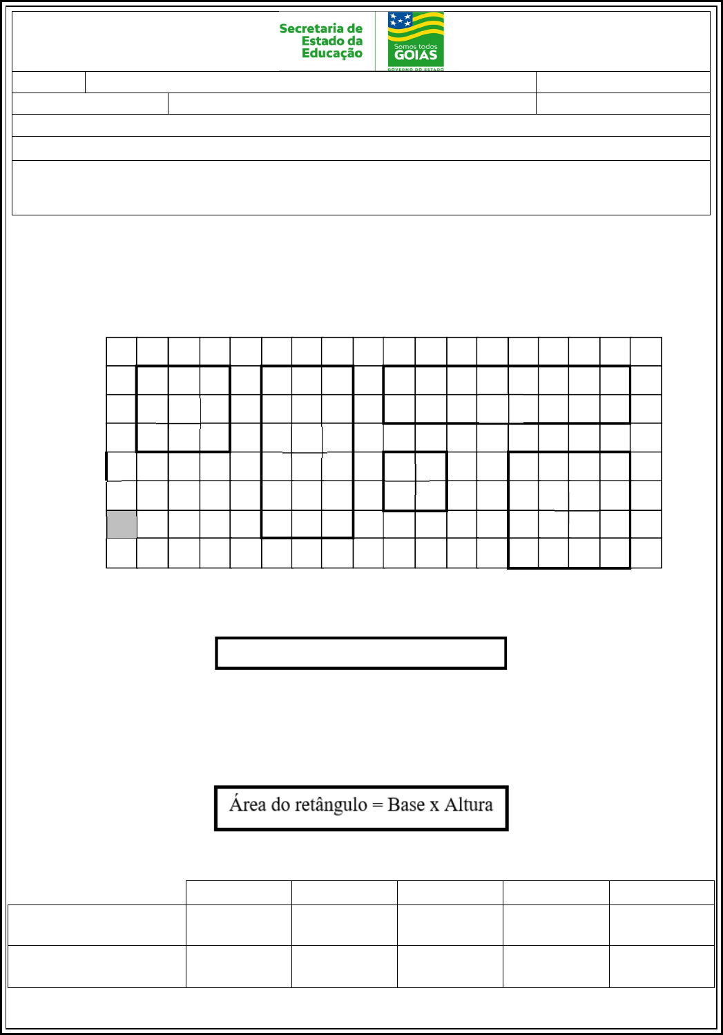 <p>Nome: Data: ___/___/2020</p><p>Unidade Escolar: Ano: 5º</p><p>Componente Curricular: Matemática</p><p>Temas/ Conhecimentos: Geometria/Medidas de áreas e perímetros.</p><p>Habilidades: (EF05MA19-B) Ler, interpretar, resolver e elaborar problemas envolvendo medidas de área,</p><p>recorrendo a transformações entre as unidades mais usuais em contextos socioculturais. (EF05MA19-G)</p><p>Reconhecer as medidas de área e de perímetro de figuras planas na malha quadriculada.</p><p>1</p><p>Medidas de áreas e perímetros.</p><p>Atividade 1. Sabendo que o lado de cada quadradinho da malha quadriculada abaixo</p><p>mede 1 cm, indique o perímetro (medida do contorno) de cada retângulo e a área (medida da</p><p>superfície) de cada região retangular apresentada na malha a seguir.</p><p>Para o cálculo do perímetro das regiões retangulares, basta somar as medidas de todos os</p><p>4 lados.</p><p>Perímetro do retângulo = Soma dos 4 lados</p><p>Para o cálculo da área da superfície dessas regiões retangulares, basta contar a quantidade</p><p>de unidades quadradas que estão contidas em seu interior. Essa contagem pode ser realizada</p><p>usando-se a operação de multiplicação entre as dimensões “base” e “altura”, assim:</p><p>De acordo com a figura da malha quadriculada, registre no quadro a seguir todas as medidas</p><p>encontradas:</p><p>Figura A Figura B Figura C Figura D Figura E</p><p>Perímetro (em cm)</p><p>Área (em cm2)</p><p>1 cm →</p><p>1 cm2 →</p><p>A</p><p>B</p><p>C</p><p>D</p><p>E</p><p>2</p><p>Atividade 2. Foi pedido ao artista que este fizesse uma pintura, na malha quadriculada a seguir,</p><p>com as seguintes especificações: 25% da área de azul; 25% da área de verde; 10% da área</p><p>de rosa e 10% da área de amarelo. Ele escolheu pintar regiões retangulares, fez os cálculos e</p><p>pintou a quantidade de quadradinhos seguindo as especificações de porcentagens e cores.</p><p>Observe na figura a seguir, como ficou a obra do artista:</p><p>a) A área total da região retangular acima é __________ cm2. O artista pintou ao todo,</p><p>______cm2 e deixou em branco ________ cm2.</p><p>b) Em relação à região retangular, podemos dizer que: ______cm2 correspondem a 100 % da</p><p>área total da região retangular.</p><p>Assim, o artista pintou ao todo, ______ % dessa área total e deixou em branco ____%.</p><p>c) Ao considerar a soma das áreas amarela, rosa e verde temos _________ cm², ou seja,</p><p>__________% da área total da região retangular.</p><p>Atividade 3. Observe a figura a seguir.</p><p>A medida da área desta figura em cm² é</p><p>(A) 144 cm².</p><p>(B) 184 cm².</p><p>(C) 204 cm².</p><p>(D) 264 cm².</p><p>3</p><p>Atividade 4. Os triângulos, os losangos e os trapézios aparecem com muita frequência nos</p><p>assuntos de Geometria.</p><p>Se conhecemos as medidas da Base e da Altura de um triângulo, basta multiplicar a Base</p><p>pela Altura e dividir por 2 para encontrarmos a medida de sua área.</p><p>Área do triângulo =</p><p>܉ܚܝܜܔۯ ܠ ܍ܛ܉۰</p><p></p><p>Observe o exemplo resolvido no item a, a seguir e calcule a área do triângulo no item b.</p><p>Em um losango, se conhecemos as medidas da Diagonal Maior e da Diagonal Menor, basta</p><p>multiplicar essas diagonais e dividir por 2 para encontrarmos a medida de sua área.</p><p>Área do losango =</p><p>ܚܗܖ܍ۻ ܔ܉ܖܗ܉۲ܑ ܠ ܚܗܑ܉ۻ ܔ܉ܖܗ܉۲ܑ</p><p></p><p>Observe o exemplo resolvido no item c, a seguir. Em seguida, calcule a área do losango no</p><p>item d.</p><p>Se a figura plana for um trapézio, precisamos identificar as medidas da Base Maior, da Base</p><p>Menor e da Altura, e procedermos assim:</p><p>1) Somar as medidas das bases do trapézio;</p><p>2) Multiplicar essa soma das bases pela altura do trapézio;</p><p>3) Dividir por 2.</p><p>4</p><p>Área do trapézio =</p><p>Respostas</p><p>1.</p><p>2.</p><p>a) A área total da região retangular acima é __________ cm2. O artista pintou ao todo,</p><p>______cm2 e deixou em branco ________ cm2.</p><p>Resolução:</p><p>Pintou ao todo, 15 + 15 + 6 + 6 = 42 cm2</p><p>Deixou em branco 60 – 42 = 18 cm2.</p><p>b) Ainda em relação à região retangular, podemos dizer que: ______cm2 correspondem a 100</p><p>% da área total da região retangular.</p><p>Assim, o artista pintou ao todo, ______ % dessa área total e deixou em branco ____%.</p><p>Resolução:</p><p>Figura A Figura B Figura C Figura D Figura E</p><p>Perímetro</p><p>(cm)</p><p>4 x 3 =12 cm</p><p>2 x 3 = 6 cm</p><p>2 x 6 =12 cm</p><p>Total: 18 cm</p><p>2 x 8 = 16 cm</p><p>2 x 2 =4 cm</p><p>Total: 20 cm</p><p>4 x 2 = 8 cm 4 x 4 =16 cm</p><p>Área (cm2) 3 x 3 = 9 cm2 3 x 6 = 18 cm2 8 x 2 = 16 cm2 2 x 2 = 4 cm2 4 x 4 = 16 cm2</p><p>60</p><p>42 18</p><p>60</p><p>70 30</p><p>5</p><p>Pintou, ao todo, 25 + 25 + 10 + 10 = 70% da área.</p><p>Deixou em branco 100 – 70 = 30%.</p><p>c) Ao considerar a soma das áreas amarela, rosa e verde temos _________ cm², ou seja,</p><p>__________% da área total da região retangular.</p><p>Resolução:</p><p>A soma das áreas amarela, rosa e verde, é dada por 6 + 6 + 15 = 27 cm².</p><p>Em porcentagem, essa soma equivale a 25 + 10 + 10 = 45% da área.</p><p>3.</p><p>Pode-se decompor a figura em dois retângulos, apenas traçando um segmento de reta. O</p><p>retângulo maior tem medidas 8 x 18. O retângulo menor tem medidas 6 x 10, observe na figura</p><p>a seguir:</p><p>4.</p><p>a) Exemplo Resolvido</p><p>b) Áܽ݁ݎ = ଵ ୶ ଽ</p><p>ଶ</p><p>= ଵସସ</p><p>ଶ</p><p>= 72 cm².</p><p>c) Exemplo Resolvido</p><p>d) Áܽ݁ݎ = ଶସ ୶ ହ</p><p>ଶ</p><p>= ଵଶ</p><p>ଶ</p><p>= 60 cm².</p><p>e) Exemplo Resolvido</p><p>f) Áܽ݁ݎ = (ଶ ାଵଶ) ୶ ଵସ</p><p>ଶ</p><p>= ଷଶ ௫ ଵସ</p><p>ଶ</p><p>= ସସ଼</p><p>ଶ</p><p>= 224 cm²</p><p>27</p><p>45</p><p>18 – 4 – 4 =</p><p>10 cm</p><p>Área do retângulo maior:</p><p>A = 8 x 18 = 144 cm²</p><p>Área do retângulo me