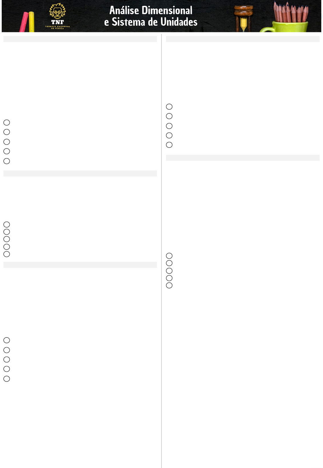 <p>Simulado Difícil 30 questões</p><p>ITA</p><p>a</p><p>b</p><p>c</p><p>d</p><p>e</p><p>EFOMM</p><p>a</p><p>b</p><p>c</p><p>d</p><p>e</p><p>EFOMM</p><p>a</p><p>b</p><p>c</p><p>d</p><p>e</p><p>ITA</p><p>a</p><p>b</p><p>c</p><p>d</p><p>e</p><p>Mackenzie</p><p>a</p><p>b</p><p>c</p><p>d</p><p>e</p><p>Questão 1</p><p>A energia produzida pelo Sol é resultante de reações de fusão</p><p>nuclear de conversão de hidrogênio em hélio. São convertidas em</p><p>radiação eletromagnética a cada segundo 4,3 milhões de</p><p>toneladas. Essa energia pode ser parcialmente convertida em</p><p>energia elétrica em painéis solares na superfície da Terra com</p><p>rendimento da ordem de 25%. Sabendo que a potencia elétrica</p><p>média consumida no Brasil é de 54 GW, estime a área que</p><p>precisaria ser coberta por painéis solares para atender a demanda</p><p>energética nacional.</p><p>Despreze perdas de armazenamento e transmissão de energia,</p><p>assim como efeitos da interação entre a luz e a atmosfera.</p><p>21 km2</p><p>320 km2</p><p>4.800 km2</p><p>52.000 km2</p><p>680.000 km2</p><p>Questão 2</p><p>Na sala dessa residência há uma janela de vidro de área 100,0</p><p>cm2 e 1,0 cm de espessura. Então, para se manter constante a</p><p>temperatura de 25 °C no interior da sala, deve ser produzida por</p><p>uma fonte de calor, a cada segundo, a quantidade de calor de:</p><p>(considere a condutividade térmica do vidro como 2,0x10-3</p><p>cal/s.cm.°C)</p><p>3,4 cal</p><p>3,9 cal</p><p>18,0 cal</p><p>34,0 cal</p><p>39,0 cal</p><p>Questão 3</p><p>Considere que uma esfera de massa 1,0 kg e carga 2,0x103 C</p><p>seja liberada, a partir do repouso, de uma altura de 20,0 m em</p><p>uma região controlada na qual se fez vácuo.</p><p>Qual é o módulo do campo magnético observado em um ponto P</p><p>do solo situado a 1,0 m do ponto de impacto da esfera no instante</p><p>imediatamente anterior ao da sua chegada ao solo? (Desconsidere</p><p>emissões de radiação devido à aceleração da esfera.) Dados:</p><p>permeabilidade magnética do vácuo:</p><p>4 πx10-7 T.m/A</p><p>2,0x10-5 T</p><p>4,0x10-5 T</p><p>4,0x10-4 T</p><p>2,0x10-3 T</p><p>4,0x10-3 T</p><p>Questão 4</p><p>O sistema de unidades atômicas de Hartree é bastante útil para a</p><p>descrição de sistemas quânticos microscópicos. Nele, faz-se com</p><p>que a carga fundamental e, a massa do elétron m0, a constante</p><p>eletrostática do vácuo K0 e a constante de Planck reduzida h</p><p>sejam todas numericamente iguais à unidade.</p><p>Assinale a alternativa que contém a ordem de grandeza. do valor</p><p>numérico da velocidade da luz no vácuo c, nesse sistema de</p><p>unidades.</p><p>100</p><p>102</p><p>104</p><p>106</p><p>108</p><p>Questão 5</p><p>Um vestibulando da UPM – Universidade Presbiteriana Mackenzie</p><p>encontra o seu pai, um engenheiro, escrevendo no sistema MLT a</p><p>expressão dimensional da grandeza física A. Ele é então</p><p>informado que, na expressão abaixo descrita, a grandeza B é</p><p>inversamente proporcional à raiz quadrada do comprimento L, à</p><p>massa M e ao quadrado do tempo T. Sabe ainda que a constante</p><p>k é adimensional, C é aceleração angular e D é o produto entre</p><p>ângulo plano e a aceleração centrípeta.</p><p>A2 = k2.B3.C/3D</p><p>Tomando a expressão como dimensionalmente homogênea, o</p><p>vestibulando auxilia corretamente o seu pai e encontra, para os</p><p>expoentes de M, L e T, respectivamente,</p><p>– 3/2 ; - 5/4 ; -3</p><p>– 3/4 ; - 5/2 ; 3</p><p>– 2/3 ; - 4/5 ; -2</p><p>3/2 ; - 5/4 ; -2</p><p>– 3/4 ; 5/4 ; 2</p><p>FAG</p><p>a</p><p>b</p><p>c</p><p>d</p><p>e</p><p>EFOMM</p><p>a</p><p>b</p><p>c</p><p>d</p><p>e</p><p>Questão 6</p><p>Um estudante de Física aplica uma força F sobre um livro que está</p><p>em cima de uma mesa, conforme esquema apresentado na figura.</p><p>Lembrando da aula de Mecânica, ele começa a fazer algumas</p><p>conjecturas sobre as relações entre as forças que atuam nesse</p><p>livro.</p><p>Considerando um movimento de velocidade constante, qual das</p><p>alternativas a seguir expressa de forma mais adequada a relação</p><p>entre essas forças?</p><p>F < FAT e P = N.</p><p>ATF > F e P > N".</p><p>F = FAT e P = N.</p><p>F > FAT e P < N.</p><p>F < FAT e P < N.</p><p>Questão 7</p><p>A tensegridade (ou integridade tensional) é uma característica de</p><p>uma classe de estruturas mecânicas cuja sustentação está</p><p>baseada quase que exclusivamente na tensão de seus elementos</p><p>conectores. Estruturas com essa propriedade, exemplificadas nas</p><p>imagens abaixo, parecem desafiar a gravidade, justamente por</p><p>prescindirem de elementos rígidos sob compressão, como vigas e</p><p>colunas:</p><p>A figura abaixo representa uma estrutura de tensegridade formada</p><p>por uma porção suspensa (as duas tábuas horizontais junto da</p><p>coluna vertical à esquerda), de peso P e com centro de massa no</p><p>ponto A, que se liga a uma parede fixa e ao chão através de 2</p><p>cordas tensionadas:</p><p>d1: distância horizontal entre o ponto A e a corda 1</p><p>d2: distância horizontal entre o ponto A e a corda 2</p><p>h1: distância vertical entre o ponto A e o ponto de contato da corda</p><p>1 na porção suspensa</p><p>h2 distância vertical entre o ponto A e o ponto de contato da corda</p><p>2 na porção suspensa</p><p>Se a estrutura está em equilíbrio, então a tensão na corda 2 vale:</p><p>Pd1 d2 / [h1(d2 - d1)]</p><p>Pd2 h1 / [d2 - d1)]</p><p>Pd2 / (d2 - d1)</p><p>Pd2 h2 / [h1(d2 - d1)]</p><p>Pd1 /(d2 - d1)</p><p>EFOMM</p><p>a</p><p>b</p><p>c</p><p>d</p><p>e</p><p>EN</p><p>a</p><p>b</p><p>c</p><p>d</p><p>e</p><p>EN</p><p>a</p><p>b</p><p>c</p><p>d</p><p>e</p><p>Questão 8</p><p>Ana Clara está brincando à beira de uma piscina cheia de água,</p><p>quando acidentalmente sua boneca cai na piscina, a uma distância</p><p>horizontal de 1,9 m da borda, e afunda. Embora Ana Clara seja</p><p>uma