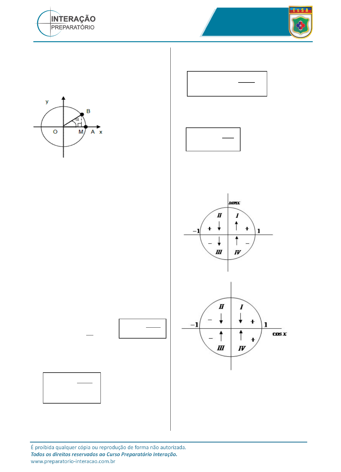 EQUIPE OS CONTÍNUOS MATEMÁTICA AULA 33 CÍRCULO TRIGONOMÉTRICO É aquele no qual seu centro também é centro de eixos coordenados e cujo raio é unitário (R=1) RELAÇÕES FUNDAMENTAIS Do triângulo OBM, temos 𝑆en α = MB/OB, mas como OB = R = 1, temos que 𝐒𝐞𝐧 𝛂 = 𝐌𝐁 𝐶𝑜𝑠 α = OM /OB, mas OB = R = 1; logo 𝐂𝐨𝐬 𝛂 = 𝐎𝐌 Como OBM é retângulo, vale o teorema de Pitágoras. Logo temos 𝑂𝐵2 = 𝑂𝑀2 + 𝑀𝐵2, ou seja: 𝑺𝒆𝒏 𝜶𝟐 + 𝑪𝒐𝒔 𝜶𝟐 = 𝟏 Assim como 𝑡𝑔 𝛼 = 𝑀𝐵 𝑂𝑀 , ou seja : Definimos secante de um ângulo ( sec 𝛼) como o inverso do cosseno, ou seja: Definimos cossecante de um ângulo ( cossec 𝛼) como o inverso do seno, ou seja: Definimos cotangente de um ângulo ( cotg 𝛼) como o inverso da tangente, ou seja: QUADRANTE 𝒕𝒈 𝜶 = 𝒔𝒆𝒏 𝜶 𝒄𝒐𝒔 𝜶 𝑆𝑒𝑐 𝛼 = 1 𝐶𝑜𝑠 𝛼 𝐶𝑜𝑠𝑠𝑒𝑐 𝛼 = 1 𝑠𝑒𝑛 𝛼 𝐶𝑜𝑡𝑔 𝛼 = 1 𝑡𝑔 𝛼 EQUIPE OS CONTÍNUOS MATEMÁTICA AULA 33 Intervalo de variação Por causa do raio unitário do círculo trigonométrico, tanto os valores de sen 𝛼 quanto cos 𝛼 são limitados entre -1 e 1 , ou seja; Obs: Vale a pena relembrar que 2𝜋rad é igual a 360° logo 𝜋rad é igual a 180° FÓRMULAS DA ADIÇÃO E SUBTRAÇÃO DE ARCOS TRIGONOMÉTRICOS Considerados dois arcos quaisquer de medidas a e b, as operações da soma e da diferença entre esses arcos serão dadas pelas seguintes identidades: 𝑠𝑒𝑛 (𝑎 + 𝑏) = 𝑠𝑒𝑛 𝑎 . cos 𝑏 + cos 𝑎 . 𝑠𝑒𝑛 𝑏 𝑠𝑒𝑛 (𝑎 − 𝑏) = 𝑠𝑒𝑛 𝑎 . cos 𝑏 − cos 𝑎 . 𝑠𝑒𝑛 𝑏 𝑐𝑜𝑠 (𝑎 + 𝑏) = 𝑐𝑜𝑠 𝑎 . cos 𝑏 − sen 𝑎 . 𝑠𝑒𝑛 𝑏 𝑐𝑜𝑠 (𝑎 − 𝑏) = 𝑐𝑜𝑠 𝑎 . cos 𝑏 + sen 𝑎 . 𝑠𝑒𝑛 𝑏 𝑠𝑒𝑛 2𝑎 = 2. 𝑠𝑒𝑛 𝑎 . cos 𝑎 𝑐𝑜𝑠 2𝑎 = 𝑐𝑜𝑠2 𝑎 − 𝑠𝑒𝑛2 𝑎 𝑡𝑔 2𝑎 = 2. 𝑡𝑔 𝑎 1 − 𝑡𝑔2𝑎 𝑡𝑔 (𝑎 + 𝑏) = 𝑡𝑔 𝑎 + 𝑡𝑔 𝑏 1 − 𝑡𝑔 𝑎 . 𝑡𝑔 𝑏 Obs: 𝑡𝑔 𝑎 + 𝑡𝑔 𝑏 terá solução se, e somente se: I) 𝑎, 𝑏 ≠ 𝜋 2 + 𝑘𝜋 (𝑘 𝜖 𝑍) II) 𝑎 + 𝑏 ≠ 𝜋 2 + 𝑘𝜋 (𝑘 𝜖 𝑍) III) 1 − 𝑡𝑔 𝑎 . 𝑡𝑔 𝑏 ≠ 0 𝑡𝑔 (𝑎 − 𝑏) = 𝑡𝑔 𝑎 − 𝑡𝑔 𝑏 1 + 𝑡𝑔 𝑎 . 𝑡𝑔 𝑏 Obs: 𝑡𝑔 (𝑎 − 𝑏) terá solução se, e somente se: I) 𝑎, 𝑏 ≠ 𝜋 2 + 𝑘𝜋 (𝑘 𝜖 𝑍) II) 𝑎 − 𝑏 ≠ 𝜋 2 + 𝑘𝜋 (𝑘 𝜖 𝑍) III) 1 + 𝑡𝑔 𝑎 . 𝑡𝑔 𝑏 ≠ 0 EXERCÍCIOS EQUIPE OS CONTÍNUOS MATEMÁTICA AULA 33 1.(EEAR 2006.1) Sejam as medidas de arcos trigonométricos I) 17𝜋 8 rad e 41𝜋 8 rad II) 1490° e – 1030° É correto afirmar que as medidas a)Em I são de arcos côngruos. b)Em I são de arcos suplementares. c)Em II são de arcos côngruos. d)Em II são de arcos complementares. 2.(EEAR 2006.1) Dois ângulos medem 2𝜋 9 𝑟𝑎𝑑 e 5𝜋 18 rad. O menor deles,em graus, mede: a)30° b)40° c)50° d)60° 3.(EEAR 2009.1) São negativas, no 4° quadrante, as funções a) Seno, cosseno e tangente b) Seno, cosseno e cotangente c) Cosseno, tangente e secante d)Seno, tangente e cossecante 4. (2011.2) Se A = Tg 120° e B = tg 240°, então a)B=A b)B=-A c)B = 2A d)B = - 2A 5. (EEAR 2008.1) Comparando-se tg 20°, tg 110° e tg 200°, obtém-se a) tg 20°= tg 200° > tg 110° b) tg 20°= tg 110°< tg 200° c) tg 20°<tg 110° tg<200° d) tg 200° <tg 20°< tg 1 6. (EEAR 2009.1) Simplificando-se a expressão 𝑡𝑔 𝑥+ cot 𝑥 cos sec 𝑥 , obtém-se a) Cossec x b)Cos x c)Sec x d)Tg x 7. (2011.2) Se sen y = m e cos y = n, o valor de sec 𝑦 cossec 𝑦 é: a) m b)n² c)Mn d)m/n 8. (EEAR 2002)Se é um ângulo tal que 2 0 e o dobro do seu seno é igual ao triplo do quadrado da sua tangente, então o valor do seu cosseno é a) 3 3 b) 2 2 c) 2 3 d) 3 2 9. (EEAR 2008.2) O valor da expressão 𝑡𝑔 𝑥 csc 𝑥−1 , para 0< 𝑥 < 𝜋 2 e sen x= 1 3 , é: a) 1 4 b) 1 2 c) √2 3 d) √2 8 10. (EEAR 2010.1) Seja x = 150°. Classifique em verdadeiro(V) ou falsa (F) cada uma das sentenças, a seguir assinale a alternativa que apresenta o número de sentenças verdadeiras. EQUIPE OS CONTÍNUOS MATEMÁTICA AULA 33 I - cos x = √3 2 II – sen 2x< 0 III - tg 𝑥 2 > 0 a)0 b)1 c)2 d)3 11. (EEAR 2008.1) O valor da expressão (sin 𝜋 6 −sin 𝜋 4 )√3 cos 𝜋 2 +sin 𝜋 3 é: a)1 - √2 b)1+√2 c) √3 2 d) 2√3 3 12. (EEAR 2010.2) Para xy ≠ 0, a expressão 𝑦² cos 180°−𝑥𝑦𝑠𝑒𝑛270°+𝑦²𝑠𝑒𝑛90° 𝑥²𝑐𝑜𝑠0° equivale a a)yx b)1/x c)y/x² d)y 13. (EEAR 2009.2) Se x e y são arcos do 1°quadrante, 𝑠𝑒𝑛 𝑥 √3 2 e cos y = √2 2 , então o cos (x + y) é igual a 𝑎) √2+ √6 2 b) √3+√6 4 c) √2− √6 4 d) √3− √6 2 14. (EEAR 2009.1) Sejam a e b arcos do primeiro quadrante. Se a + b =90°, então cos ( a- b), em função de b, é igual a a) sen 2b b)cos 2b c)sen 2b/2 d)cos 2b/2 15. (2011.2) Se cos x = 2/3 e sen x >0, então sen 2x é 𝑎) 4√5 9 𝑏) 2√5 3 c) 5√3 2 d) √3 6 16. (EEAR 2010.1) Sen x + cos 2x = 1, então um dos valores de sen x é: a)1 b)1/2 c) 𝑐) √2 2 d) - √3 3 17. (EEAR 2010.2) Se a e b são arcos do 2 ° quadrante tais que sen a = √2 2 e cos b = - ½, então sen ( a + b) é 𝑎) √2(−√3+√2) 4 b) −√2(1+ √3) 4 c) √3(3− √2) 4 d) 3(3− √2) 4 18. (EEAR 2008.2) Se 0< 𝑥 < 𝜋 2 e 𝑠𝑒𝑛 𝑥 = 2 3 , então sen 2x é igual a 𝑎) √3 3 b) √5 3 c) 4√5 9 d) 4√3 9