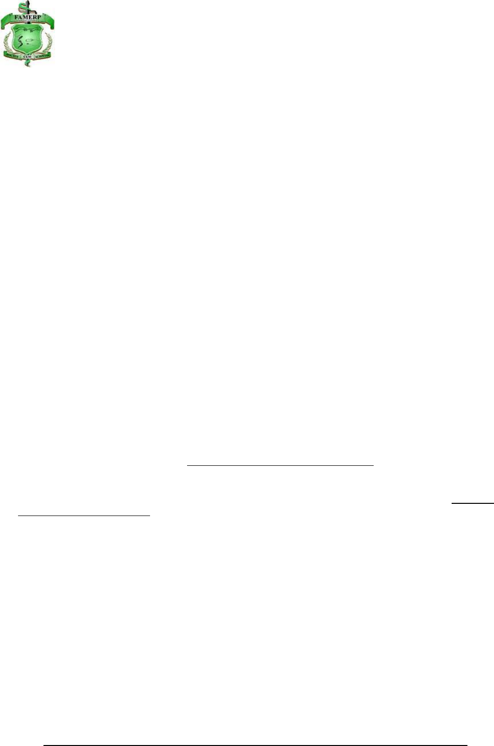 Av. Brigadeiro Faria Lima, 5416 - 15090-000 São José do Rio Preto – SP - Brasil Fone; (17) 3201-5701 – www.famerp.br FACULDADE DE MEDICINA DE SÃO JOSÉ DO RIO PRETO Autarquia Estadual - Lei n.º 8899, de 27/09/94 (Reconhecida pelo Decreto Federal n.º 74.179, de 14/06/74) _____________________________________________________________________________ 1 EDITAL FAMERP G.D.G Nº 032/2023 Vestibular FAMERP 2024 Dispõe sobre normas para realização do Vestibular/2024 da Faculdade de Medicina de São José do Rio Preto – FAMERP e dá outras providências. O Professor Doutor Francisco de Assis Cury, Diretor Geral da Faculdade de Medicina de São José do Rio Preto – FAMERP, Autarquia Estadual de Regime Especial, no uso de suas atribuições regimentais e da legislação vigente, faz saber através do presente Edital, que estarão abertas as inscrições para o seu Vestibular para ingresso no 1º semestre de 2024. 1. DAS DISPOSIÇÕES GERAIS. 1.1 O Vestibular estará aberto ao candidato: 1.1.1 Portador de Certificado de Conclusão do Ensino Médio ou equivalente; 1.1.2 Que estiver cursando o Ensino Médio ou equivalente; 1.1.3 Portador de diploma de Curso Superior. 1.2 A realização do Vestibular estará a cargo e sob a responsabilidade da Fundação para o Vestibular da Unesp − VUNESP. 2. DAS VAGAS. 2.1 Serão oferecidas 160 (cento e sessenta) vagas, assim distribuídas: 2.1.1 Medicina – período integral − 80 vagas – duração - 6 anos; 2.1.2 Enfermagem – período integral – 60 vagas – duração - 4 anos; 2.1.3 Psicologia – período integral – 20 vagas – duração - 5 anos; 2.1.4 A Faculdade de Medicina de São José do Rio Preto - FAMERP adotará a Política de Cotas da FAMERP. 2.1.5 Das vagas destinadas à Política de Cotas da FAMERP, conforme Portaria FAMERP nº 060 de 27 de agosto de 2019, 65% serão para alunos que cursaram integralmente o Ensino Fundamental e Médio no ensino público brasileiro ou a Educação de Jovens e Adultos em escolas públicas brasileiras e 35% serão oferecidas para aqueles que se autodeclarem Pretos, Pardos ou Indígenas de etnia brasileira e que tenham cursado integralmente o Ensino Fundamental e Médio no ensino público brasileiro ou a Educação de Jovens e Adultos realizados pelos sistemas estaduais no ensino público brasileiro, resultando na seguinte divisão: 2.1.5.1 Para o Curso de Medicina: 16 vagas para a Política de Cotas da FAMERP, sendo 10 vagas para estudantes oriundos do ensino público brasileiro e 6 vagas para estudantes oriundos do ensino público brasileiro e autodeclarados Pretos, Pardos ou Indígenas de etnia brasileira. 2.1.5.2 Para o Curso de Enfermagem: 12 vagas para a Política de Cotas da FAMERP, sendo 8 vagas para estudantes oriundos do ensino público brasileiro e 4 vagas para estudantes oriundos do ensino público brasileiro e autodeclarados Pretos, Pardos ou Indígenas de etnia brasileira. 2.1.5.3 Para o Curso de Psicologia: 4 vagas para a Política de Cotas da FAMERP, sendo 3 vagas para estudantes oriundos do ensino público brasileiro e 1 vaga para estudantes oriundos do ensino público brasileiro e autodeclarados Pretos, Pardos ou Indígenas de etnia brasileira. 2.1.5.4 Na inexistência de candidatos autodeclarados Pretos, Pardos ou Indígenas de etnia brasileira, classificados, as vagas por eles não ocupadas serão preenchidas por candidatos que tenham cursado integralmente o Ensino Fundamental e o Ensino Médio no ensino público brasileiro, independente da http://www.famerp.br/ Av. Brigadeiro Faria Lima, 5416 - 15090-000 São José do Rio Preto – SP - Brasil Fone; (17) 3201-5701 – www.famerp.br FACULDADE DE MEDICINA DE SÃO JOSÉ DO RIO PRETO Autarquia Estadual - Lei n.º 8899, de 27/09/94 (Reconhecida pelo Decreto Federal n.º 74.179, de 14/06/74) _____________________________________________________________________________ 2 questão de raça. 2.1.5.5 As vagas não preenchidas pela Política de Cotas da FAMERP por inexistência de classificados, serão destinadas aos demais candidatos da Lista Geral, ainda não convocados, obedecendo-se à ordem decrescente da nota final no Vestibular. 2.1.5.6 Todos os candidatos que se inscreverem às vagas da Política de Cotas da FAMERP, também estarão concorrendo às demais vagas na Lista Geral. 2.2 Considera-se ensino público brasileiro, a instituição de ensino criada ou incorporada, mantida e administrada pelo Poder Público, nos termos do inciso I, do art. 19, da Lei nº 9.394, de 20 de dezembro de 1996. A gratuidade do ensino não indica, necessariamente, que a escola seja pública. Escolas vinculadas a fundações, cooperativas, Sistema S (SESI, SENAI, SESC, SENAC) etc., embora gratuitas, são consideradas particulares em função de sua dependência administrativa junto ao setor privado. 2.2.1 São considerados candidatos egressos do ensino público brasileiro, exclusivamente, aqueles que tenham cursado integralmente o Ensino Fundamental e o Ensino Médio no ensino público brasileiro em cursos regulares ou no âmbito da modalidade de Educação de Jovens e Adultos – EJA realizados pelos sistemas no ensino público brasileiro. 2.2.1.1 A certificação pelo ENEM não pressupõe a frequência no ensino público brasileiro e, desta forma, não poderá ser utilizada como documento válido para concorrência às vagas reservadas a Política de Cotas da FAMERP. 2.2.2 São considerados Pretos ou Pardos, aqueles que assim se autodeclarem no ato da inscrição. A comprovação se dará no ato matrícula mediante a apresentação da declaração, conforme modelo integrante do Anexo II deste Edital. 2.2.3 São considerados Indígenas aqueles que assim se autodeclarem no ato da inscrição. A comprovação se dará no ato matrícula mediante a apresentação da Certidão do Registro Administrativo de Nascimento do Indígena (RANI). 3. DAS INSCRIÇÕES – AS DATAS CITADAS NESTE EDITAL CONSTAM NO ANEXO I. 3.1 As inscrições para o Vestibular 2024