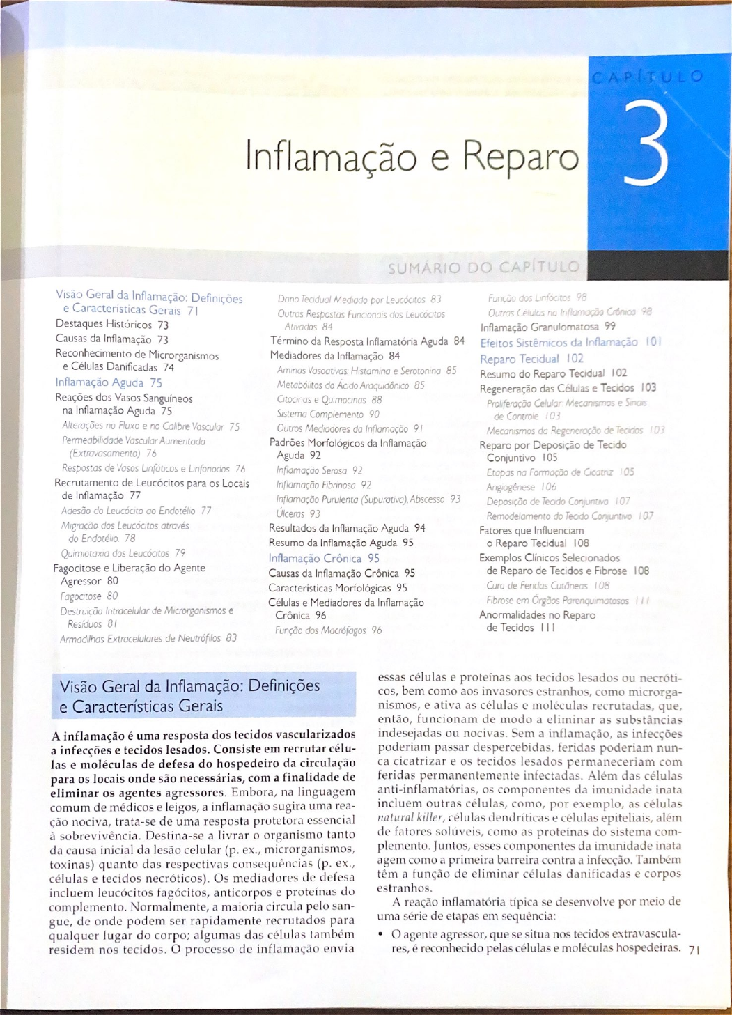<p>CAPÍTULO Inflamação e Reparo 3 DO CAPÍTULO Visão Geral da Definições Dano Tecidual Mediado por Leucócitos 83 Função dos 98 e Características Gerais Outras Respostas Funcionais dos Outras Células no Inflamação 98 Destaques Históricos 73 Ativados 84 Inflamação Granulomatosa 99 Causas da Inflamação 73 Término da Resposta Inflamatória Aguda 84 Efeitos Sistêmicos da Inflamação 101 Reconhecimento de Microrganismos Mediadores da Inflamação 84 e Células Danificadas 74 Reparo Tecidual 102 Aminas e 85 Resumo do Reparo Tecidual 102 Inflamação Aguda 75 Metabólitos do Ácido Araquidônico 85 Regeneração das Células e Tecidos 103 Reações dos Vasos Sanguíneos Citocinas e Quimocinas 88 Celular Mecanismos e na Inflamação Aguda 75 Sistema Complemento 90 de Controle 103 Alterações no Fluxo e no Calibre Vascular 75 Outros Mediadores da Inflamação 91 Mecanismos da Regeneração de Tecidos 103 Permeabilidade Vascular Aumentada Padrões Morfológicos da Inflamação Reparo por Deposição de Tecido (Extravasamento) 76 Aguda 92 Conjuntivo 105 Respostas de Vasos Linfáticos e Linfonodos 76 Inflamação Serosa 92 Etapas Formação de Cicatriz 105 Recrutamento de Leucócitos para os Locais Inflamação Fibrinosa 92 Angiogênese 106 de Inflamação 77 Inflamação Purulenta (Supurativa), Abscesso 93 Deposição de Tecido Conjuntivo 107 Adesão do Leucócito ao 77 Úlceras 93 Remodelamento do Tecido Conjuntivo 107 Migração dos Leucócitos através Resultados da Inflamação Aguda 94 Fatores que Influenciam do 78 Resumo da Inflamação Aguda 95 Reparo Tecidual 108 Quimiotaxia dos Leucócitos 79 Inflamação Crônica 95 Exemplos Clínicos Selecionados Fagocitose e Liberação do Agente Causas da Inflamação Crônica 95 de Reparo de Tecidos e Fibrose 108 Agressor 80 Características Morfológicas 95 Cura de 108 Fagocitose 80 Células e Mediadores da Inflamação Fibrose em Órgãos Destruição Intracelular de Microrganismos e Crônica 96 Anormalidades no Reparo Resíduos 81 Função dos Macrófagos 96 de Tecidos Armadilhas Extracelulares de Neutrófilos 83 essas células e proteínas aos tecidos lesados ou necróti- Visão Geral da Inflamação: Definições cos, bem como aos invasores estranhos, como microrga- e Características Gerais e ativa as células e recrutadas, que, então, funcionam de modo a eliminar as substâncias A inflamação é uma resposta dos tecidos vascularizados indesejadas ou Sem a inflamação, as infecções a infecções e tecidos lesados. Consiste em recrutar célu- poderiam passar despercebidas, feridas poderiam nun- las e moléculas de defesa do hospedeiro da circulação ca cicatrizar e os tecidos lesados permaneceriam com para os locais onde são necessárias, com a finalidade de feridas permanentemente infectadas. Além das células eliminar os agentes agressores. Embora, na linguagem anti-inflamatórias, os componentes da imunidade inata comum de médicos e leigos, a inflamação sugira uma rea- incluem outras células, como, por exemplo, as células ção nociva, trata-se de uma resposta protetora essencial natural killer, células dendríticas e células epiteliais, além à Destina-se a livrar o organismo tanto de fatores solúveis, como as proteínas do sistema com- da causa inicial da lesão celular (p. ex., microrganismos, plemento. Juntos, esses componentes da imunidade inata toxinas) quanto das respectivas consequências (p. ex., agem como a primeira barreira contra a infecção. Também células e tecidos necróticos). Os mediadores de defesa têm a função de eliminar células danificadas e corpos incluem leucócitos anticorpos e proteínas do estranhos. complemento. Normalmente, a maioria circula pelo san- A reação inflamatória típica se desenvolve por meio de gue, de onde podem ser rapidamente recrutados para uma série de etapas em sequência: qualquer lugar do corpo; algumas das células também agente agressor, que se situa nos tecidos extravascula- residem nos O processo de inflamação envia res, é reconhecido pelas células e moléculas hospedeiras. 71</p><p>72 CAPÍTULO 3 Inflamação e Reparo Os leucócitos e as proteínas do plasma são recrutados Microrganismos Tecido necrosado da circulação para local onde O agente agressor está localizado. Os leucócitos e as proteínas são ativados e trabalham juntos para destruir e eliminar a substância agressora. A reação é controlada e concluída. Reconhecimento pelos O tecido lesado é reparado. outras Antes de discutir os mecanismos, as funções e a patologia sentinela nos Macrófago Célula dendritica Mastócito tecidos da resposta inflamatória, vale a pena revisar algumas de suas propriedades Mediadores Componentes da resposta Os maiores participantes da reação inflamatória nos tecidos são os Recrutamento vasos sanguíneos e leucócitos (Fig. 3-1). Conforme será de leucócitos discutido com mais detalhes adiante, os vasos sanguíneos se dilatam para reduzir o fluxo sanguíneo e, ao aumentar Proteínas plasmáticas sua permeabilidade, permitem que proteínas circulatórias selecionadas entrem no local da infecção ou do tecido Monócito (complemento, Granulócito cininas, outros) As características do endotélio vascular também permeabilidade vascular se alteram de tal forma que, inicialmente, os leucócitos aumentada chegam a parar, migrando, em seguida, para os tecidos. Os leucócitos, uma vez recrutados, são ativados e adqui- rem a habilidade de ingerir e destruir os microrganismos e as células mortas, bem como corpos estranhos e outros Mediadores de materiais indesejados nos tecidos. Macrófago inflamação, Consequências nocivas da inflamação. As reações eliminação Edema Eliminação de microrganismos, de anti-inflamatórias de proteção contra infecções são, em tecido morto microrganismos geral, acompanhadas por lesão tecidual local e seus sinais e sintomas associados (p. ex., dor e perda funcio- Citocinas, fatores de crescimento n