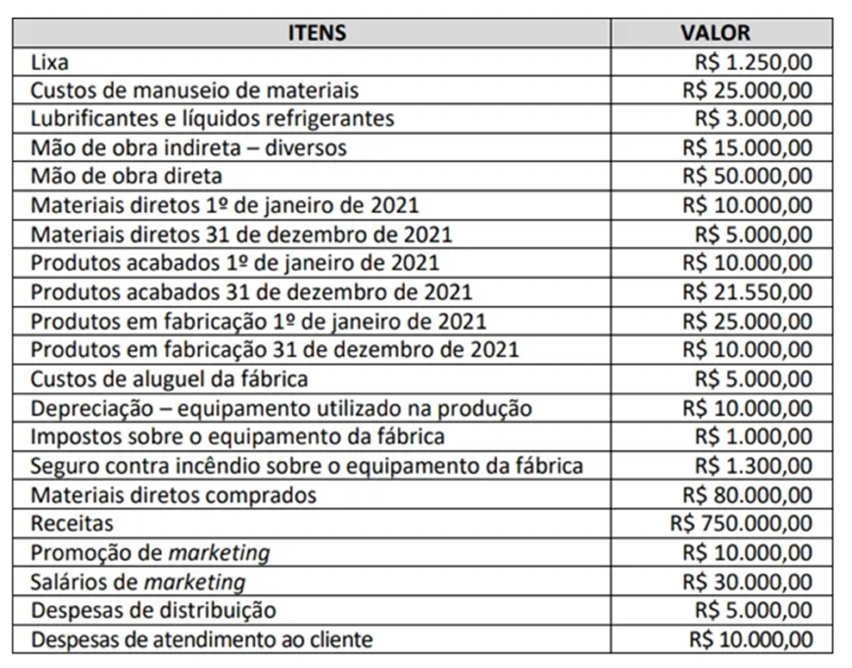 <p>Em uma cooperativa fabrica-se pedaços de metal e de madeira para a indústria de</p><p>construção civil que produz casas populares. Nessa cooperativa trabalham pessoas de</p><p>forma autônoma, que ganham por unidade produzida. Para a apuração do resultado</p><p>no ano de 2021 foram levantadas as seguintes informações:</p><p>Informações adicionais:</p><p>1. a) O Custeio por Absorção ou “Custeio Integral” é método derivado da</p><p>aplicação dos Princípios Fundamentais de Contabilidade.</p><p>1. b) Quando um bem está ligado diretamente à produção da empresa, ele</p><p>é chamado de custo.</p><p>Considerando o sistema de custeio aceito pela legislação do Imposto de Renda</p><p>e, exclusivamente, as informações disponibilizadas, qual o montante dos</p><p>Custos Variáveis utilizados na produção e o Custo de Produtos Vendidos,</p><p>respectivamente?</p><p>Orientações</p><p>1° - Classificar os custos em fixos e variáveis.</p><p>Dica! Tudo que estiver na “fábrica” deve ser classificado como custo.</p><p>2° - Elaborar os razonetes para o processo de fabricação.</p><p>3° Encontrar o total dos custos variáveis utilizados na produção.</p><p>Custo Variável Valor</p><p>Lixa R$ 1.250,00</p><p>Custos de manuseio de</p><p>materiais R$ 25.000,00</p><p>Lubrificantes R$ 3.000,00</p><p>Mão de obra indireta R$ 15.000,00</p><p>Mão de obra direta R$ 50.000,00</p><p>Materiais direto R$ 5.000,00</p><p>Materiais direto comprado R$ 80.000,00</p><p>TOTAL R$ 179.250,00</p><p>Custo Fixo Valor</p><p>Aluguel R$ 5.000,00</p><p>Depreciação da maquina R$ 10.000,00</p><p>Imposto sobre equipamento da</p><p>fábrica R$ 1.000,00</p><p>Seguro contra incendio da</p><p>fábrica R$ 1.300,00</p><p>TOTAL R$ 17.300,00</p><p>Custo dos produtos vendidos</p><p>Estoque de matéria prima = estoque inicial + materiais diretos comprados –</p><p>estoque final</p><p>Estoque de matéria prima = 10.000 + 80.000 – 5.000 = 85.000</p><p>Produtos em elaboração (Fabricação) = estoque de matéria prima + estoque</p><p>inicial em elaboração + lixa + manuseio + lubrificantes + mão de obra indireta +</p><p>mão de obra direta + aluguel + depreciação + impostos + seguro – estoque</p><p>final produtos em elaboração (fabricação)</p><p>Produtos em elaboração (Fabricação) = 85.000 + 25.000 + 1.250 + 25.000 +</p><p>3.000 + 15.000 + 50.000 + 5.000 + 10.000 + 1.000 + 1.300 – 10.000 =</p><p>211.550,00</p><p>Produtos acabados = Produção em elaboração + estoque inicial de produtos</p><p>acabados – estoque final de produtos acabados</p><p>Produtos acabados = 211.550 + 10.000 – 21.550 = R$ 200.00</p>