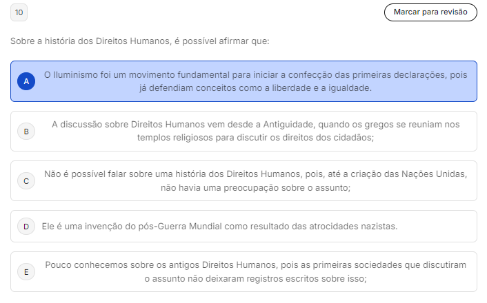 <p>10 Marcar para revisão Sobre a história dos Direitos Humanos, é possível afirmar que: Iluminismo foi um movimento fundamental para iniciar a confecção das primeiras declarações, pois A já defendiam conceitos como a liberdade e a igualdade. A discussão sobre Direitos Humanos vem desde a Antiguidade, quando os gregos se reuniam nos B templos religiosos para discutir os direitos dos cidadãos; Não é possível falar sobre uma história dos Direitos Humanos, pois, até a criação das Nações Unidas, C não havia uma preocupação sobre O D Ele é uma invenção do pós-Guerra Mundial como resultado das atrocidades nazistas Pouco conhecemos sobre os antigos Direitos Humanos, pois as primeiras sociedades que discutiram E assunto não deixaram registros escritos sobre isso;</p>