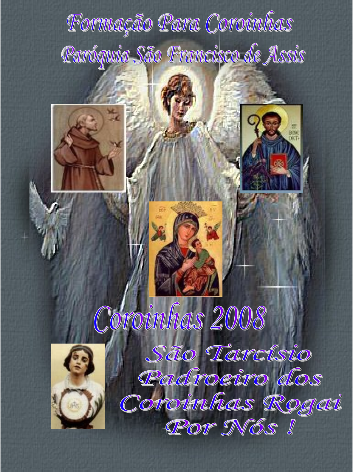 <p>1</p><p>Índice</p><p>• Capítulo 1--Responsabilidade dos Coroinhas ....................................02</p><p>• Capítulo 2-Liturgia e Celebrações Litúrgicas ................................... 04</p><p>• Capítulo 3 – Símbolos e Gestos Simbólicos ..................................... 06</p><p>• Capítulo 4 – Posições Durante as Celebrações ................................. 08</p><p>• Capítulo 5 – Cores Litúrgicas ........................................................... 10</p><p>• Capítulo 6 -- Ano Litúrgico ............................................................... 11</p><p>• Capítulo 7 – O Espaço da Celebração e as Vestes Litúrgicas ........... 16</p><p>• Capítulo 8 – Fiéis que Participam da Celebração .............................. 22</p><p>• Capítulo 9 -- Objetos e Paramentos Litúrgicos ..................................23</p><p>• Capítulo 10 -- Eucaristia: Significados e Conseqüências ...................28</p><p>• Capítulo 11 – Eucaristia: Fundamentos Bíblicos e Teológicos ......... 32</p><p>• Capítulo 12 -- Outros Termos Litúrgicos ...........................................34</p><p>• Capítulo 13 – Livros Sagrados ...........................................................36</p><p>• Capítulo 14 – O Que Fazer Após a Missa ? .......................................38</p><p>• Capítulo 15 – Quem é o Santo Padroeiro dos Coroinhas? .................39</p><p>• Capítulo 16 – Os Sacramentos ...........................................................40</p><p>• Capítulo 17 – Sacramentais ................................................................50</p><p>• Capítulo 18 -- Celebração Eucarística parte por parte ........................51</p><p>• Capítulo 19 --A oração: Estabelecimento de um Diálogo de um Homem</p><p>com Deus ..................................................................................................57</p><p>• Capítulo 20 --Algumas Orações que o Coroinha deve Saber ..............58</p><p>• Capítulo 21--Observações gerais .........................................................60</p><p>• Capítulo 22 – As Sagradas Escrituras ..................................................61</p><p>• Capítulo 23 – Especialmente para Você, Coroinha !!! ........................65</p><p>• Capítulo 24 -- Bibliografia ...................................................................67</p><p>Nome do Cursando:</p><p>___________________________________________________________</p><p>Comunidade:</p><p>___________________________________________________________</p><p>Endereço:</p><p>___________________________________________________________</p><p>Telefone para Contato:</p><p>_____________________________________________________________________</p><p>2</p><p>Capítulo 1-Responsabilidade dos Coroinhas</p><p>1.-Participe das reuniões;missas e demais compromissos assumidos.</p><p>2.-Seja pontual.Chegue a tempo para as reuniões e celebrações.</p><p>3.-Seja organizado.Esteja sempre limpo, cabelo penteado e presos, calçados e roupas bem</p><p>arrumados.</p><p>4.-Seja cuidadoso com as coisas da igreja e do altar.</p><p>5.-Trate dos paramentos e objetos litúrgicos com respeito como objetos destinados ao culto</p><p>divino.</p><p>6.-Seja humilde e preste atenção ao que lhe for ensinado.</p><p>7.-Durante os atos litúrgicos evite conversas,risos ou brincadeiras (durante as celebrações</p><p>evitar circulações no presbitério).</p><p>8.-Cultive o gosto pela oração e leia um trecho da Bíblia cada dia.</p><p>9.-Dedique-se ao estudo da liturgia,a fim de celebrar cada vez melhor.</p><p>10.-Observe o silêncio na igreja e na sacristia.E mantenha a concentração, principalmente</p><p>antes de começar o ato litúrgico.</p><p>Atividade 1</p><p>Para o próximo encontro, partilhar com os colegas: dentre as várias responsabilidades dos</p><p>coroinhas, escolha duas que você tem mais facilidade de praticar, e uma na qual você</p><p>propõe a melhorar.</p><p>_________________________________________________________________________</p><p>_________________________________________________________________________</p><p>_________________________________________________________________________</p><p>_________________________________________________________________________</p><p>_________________________________________________________________________</p><p>_________________________________________________________________________</p><p>“E nós vos suplicamos que, participando do corpo</p><p>e sangue de Cristo,Sejamos reunidos pelo</p><p>Espírito Santo num só corpo “.</p><p>3</p><p>Capítulo 02-Liturgia e Celebrações Litúrgicas.</p><p> O Que é Liturgia?</p><p>Liturgia é, antes de tudo, AÇÃO. Ação supõe movimento. A liturgia se expressa</p><p>mediante palavras e gestos. Por isso, dizemos que a Liturgia e feita de sinais sensíveis,</p><p>ou seja, sinais que chegam aos nossos sentidos (audição, tato, olfato, paladar, visão).</p><p>Antigamente, fora do campo religioso, Liturgia queria dizer Ação do Povo. A igreja</p><p>passou a aplicar este termo para indicar ação do povo Reunido para expressar sua Fé</p><p>em Deus.</p><p> O que é celebrar?</p><p>Celebrar tem vários significados: festejar em massa, solenizar, honrar, exaltar, cercar de</p><p>cuidado e de estima.</p><p>O ser humano é naturalmente celebrativo. As pessoas facilmente se reúnem para</p><p>celebrar aniversários, vitórias esportivas, formaturas, batizados, casamentos, funerais,</p><p>etc.</p><p> Celebrações Litúrgicas</p><p>O que são celebrações litúrgicas? São encontros de Deus com o seu povo reunido.Esses</p><p>encontros se realizam mediante algumas condições que chamamos Elementos</p><p>Constitutivos da celebração litúrgica.</p><p>Os principais elementos que constituem uma celebração litúrgica são seguintes:</p><p>1. Assembléia: São pessoas batizadas que 