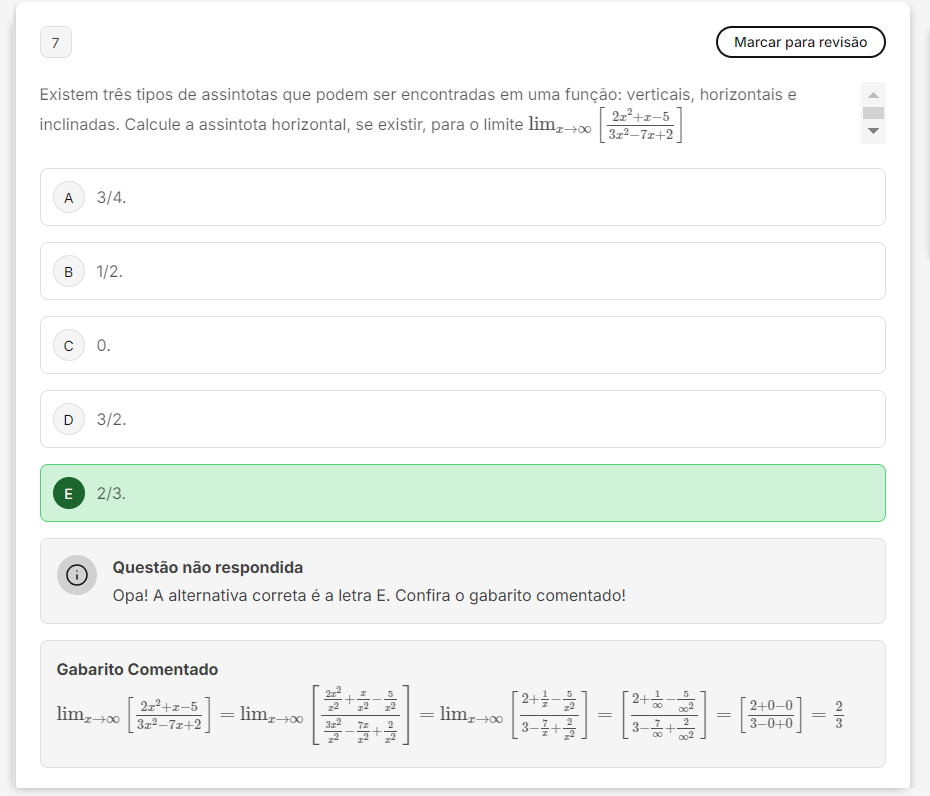 <p>7 Marcar para revisão Existem três tipos de assintotas que podem ser encontradas em uma função: verticais, horizontais e 2x2+x-5 inclinadas. Calcule a assintota horizontal, se existir, para limite A 3/4. B 1/2. C 0. D 3/2. E Questão não respondida Opa! A alternativa correta é a letra E. Confira gabarito comentado! Gabarito Comentado 5 2 1 + 2- 1 5 2 z2 = = = = 7z 2 3 7 + + 2 3 7 2 3-0+0 2+0-0 = 2 2</p>