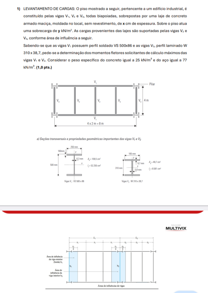 <p>1) LEVANTAMENTO DE CARGAS: piso mostrado a seguir, pertencente a um edifício é constituído pelas vigas V2 e V3, todas biapoiadas, sobrepostas por uma laje de concreto armado moldada no local, sem revestimento, de cm de espessura. Sobre piso atua uma sobrecarga de y As cargas provenientes das lajes são suportadas pelas vigas V2 e V3, conforme área de influência a seguir. Sabendo-se que as vigas V1 possuem perfil soldado 500x86 e as vigas perfil laminado W 310 38,7, pede-se a determinação dos momentos fletores solicitantes de cálculo máximos das vigas V1 e V2. Considerar peso específico do concreto igual a 25 e do aço igual a 77 (1,0 pts.) Pilar a) Seções transversais e propriedades geométricas importantes das vigas V1 V2 250 mm 160mm 165 49.7 mm MULTIVIX L Area da viga Area de da viga interior by Areas de de vigas</p>