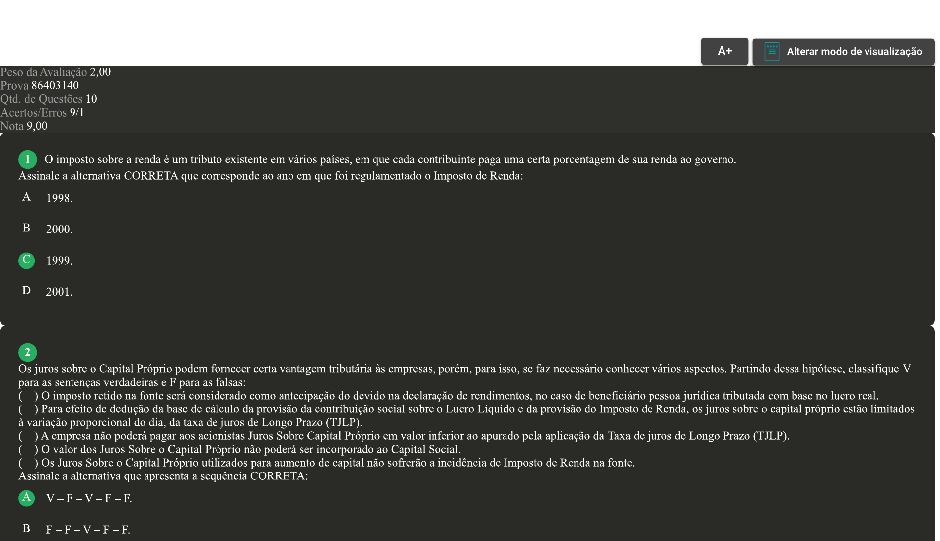 <p>A+ Alterar modo de visualização Peso da Avaliação 2,00 Prova 86403140 Qtd. de Questões 10 Acertos/Erros 9/1 Nota 9,00 1 O imposto sobre a renda é um tributo existente em vários países, em que cada contribuinte paga uma certa porcentagem de sua renda ao governo. Assinale a alternativa CORRETA que corresponde ao ano em que foi regulamentado Imposto de Renda: A 1998. B 2000. 1999. D 2001. 2 Os juros sobre Capital Próprio podem fornecer certa vantagem tributária às empresas, porém, para isso, se faz necessário conhecer vários aspectos. Partindo dessa hipótese, classifique V para as sentenças verdadeiras e F para as falsas: ( ) O imposto retido na fonte será considerado como antecipação do devido na declaração de rendimentos, no caso de beneficiário pessoa jurídica tributada com base no lucro real. ) Para efeito de dedução da base de cálculo da provisão da contribuição social sobre Lucro Líquido e da provisão do Imposto de Renda, os juros sobre capital próprio estão limitados à variação proporcional do dia, da taxa de juros de Longo Prazo (TJLP). ) A empresa não poderá pagar aos acionistas Juros Sobre Capital Próprio em valor inferior ao apurado pela aplicação da Taxa de juros de Longo Prazo (TJLP) ( ) O valor dos Juros Sobre Capital Próprio não poderá ser incorporado ao Capital ) Os Juros Sobre Capital Próprio utilizados para aumento de capital não sofrerão a incidência de Imposto de Renda na fonte. Assinale a alternativa que apresenta a sequência CORRETA: A B</p><p>C D 3 O patrimônio líquido pode apresentar mudanças de valores do decorrer do ano. Essas mudanças acorrem na maioria das vezes pela integralização e/ou retirada de capital Qual é a outra razão dessas mudanças? A A incorporação do resultado do ano subsequente. B A imputação do resultado do ano anterior. C A incorporação do resultado do ano anterior. D A incorporação do resultado do mês anterior. 4 A gestão empresarial tem como principal pressuposto a análise detida de tudo aquilo que ocorre na rotina da empresa. Dessa maneira, sobre a base utilizada para remuneração dos juros sobre capital próprio, assinale a alternativa CORRETA: A Está limitada à taxa de juros dos investimentos. B Está limitada à taxa de juros de longo prazo. C Está controlada pela CVM. D Está controlada pela TIR. 5 A Lei n° 11.638, de 28 de dezembro de 2007, extinguiu a possibilidade de uma empresa deixar os lucros do período na conta de lucros a acumulados. Dessa forma, como é formada a subdivisão dos grupos para destinação desses lucros?</p><p>A Reserva legal, reserva reserva para contingência, reserva de lucros a realizar. B Reserva legal, reserva reserva geral, reserva de lucros a realizar. C Reserva legal, reserva ilegal, reserva para contingentes, reservas clássica. D Reserva ilegal, reserva reserva para contingência, reserva moderna. 6 É uma reserva que será revertida no exercício em que deixarem de existir as razões que justificaram a sua constituição ou em que ocorrer a perda. De qual reserva estamos falando? Reserva para contingência. B Reserva de lucros a realizar. C Reservas D Reserva 7 A partir da Lei 11.638/2001 houve a extinção da possibilidade de a empresa deixar os lucros do período na conta de lucros acumulados, sendo assim, os valores de lucros de períodos anteriores poderão existir na empresa numa conta específica do patrimônio líquido denominada reserva de lucros. As reservas de lucros são subdivididas em quatro grupos: reserva legal, reservas reserva para contingência e reserva de lucros a realizar. Sobre a reserva legal, assinale a alternativa CORRETA: A A assembleia geral poderá, por proposta dos órgãos da administração, destinar parte do lucro líquido à formação de reserva com a finalidade de compensar, em exercício futuro, a diminuição do lucro decorrente de perda julgada provável, cujo valor possa ser estimado. B São definidas pelo estatuto da empresa, podendo criar reservas desde que indique, de modo preciso e completo, a sua finalidade e fixe os critérios para determinar a parcela anual dos lucros líquidos que serão destinados à sua constituição. C No exercício em que montante do dividendo obrigatório, calculado nos termos do estatuto ultrapassar a parcela realizada do lucro líquido do exercício, a assembleia geral poderá, por proposta dos órgãos de administração, destinar excesso à constituição desta reserva. D Do lucro líquido do exercício, 5% serão aplicados, antes de qualquer outra destinação, para constituição dessa reserva, que não excederá 20% do capital social.</p><p>Revisar Conteúdo do Livro 8 A gestão empresarial possui como principal pressuposto a análise detida de tudo aquilo que ocorre na rotina da empresa. Sobre as destinações do resultado do exercício, analise as sentenças a seguir: I- Há a constituição de reservas. II- Possui compensação de prejuízos acumulados, apurados em exercícios anteriores. III- Pode exisitir aumento de capital IV- É possivel a distribuição aos investidores. Assinale a alternativa CORRETA: A Somente a sentença IV está correta. B Somente a sentença III está correta. C As sentenças I, II, III e IV estão corretas. D As sentenças I e II estão corretas. 9 A Companhia Investidora ABC adquire ações da investida DEF. O investimento é significativo e realizado em empresa controlada. Sabe-se que Patrimônio Líquido da investida é de R$ 800.000,00 e que a Investidora ABC adquire 60% de suas ações, pagando à vista R$ 500.000,00. Qual será lançamento na investidora? A D - Investimento em controladas: 500.000,00. C Caixa: 500.000,00. B D - Investimentos em controladas: 480.000,00. C Caixa: 480.000,00. C - Investimentos em controladas: 500.000,00. C D - Caixa: 480.000,00. C - Deságio em investimentos: 20.000,00.</p><p>C - Caixa: 500.000,00. D D - Investimentos em controladas: 480.000,00. D - Ágio em investimentos: 20.000,00. 10 