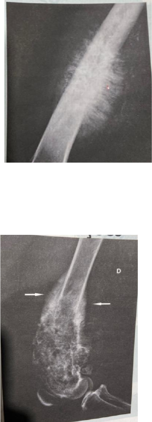 <p>Reações periosteais são as:</p><p>Reação em raios de sol: Que são caracterizadas por espiculas ósseas que irradiam de uma</p><p>lesão osteolidica (manchas de danos ossos) ou ostoprodutiva agressiva, acontece</p><p>principalmente em tumores ósseos malignos</p><p>Triângulo de codman: Reação caracterizada pela elevação do periósteo, resultando em</p><p>neoformação óssea subperiosteal em forma triangular. Ocorre frequentemente em nas</p><p>neoplasias primária malignas, embora também possa ser visualizado em osteomielites</p><p>Reação espiculada ou em paliça: Caracteriza-se como uma neo- formação óssea que se irradia</p><p>per- pendicularmente ao córtex do osso longo. É observada frequente- mente na osteopatia</p><p>hipertrófica e ocasionalmente, na osteomielite.</p><p>Lamelar ou em casca de cebola: é caracterizada pela deposição de múltiplas camadas ósseas</p><p>recém-formadas, paralelas à cortical do osso, que podem assumir o aspecto de “cascas de</p><p>cebola,, resultante de repetidos estímulos, processos irritativos e traumas</p><p>Regular e sólida: é típica de traumas focais em que há hematoma subperiosteal e parte do</p><p>periósteo se distancia do córtex.. É uma reação característica de processos crônicos, podendo</p><p>representar a resolução de outros tipos de periostites</p>