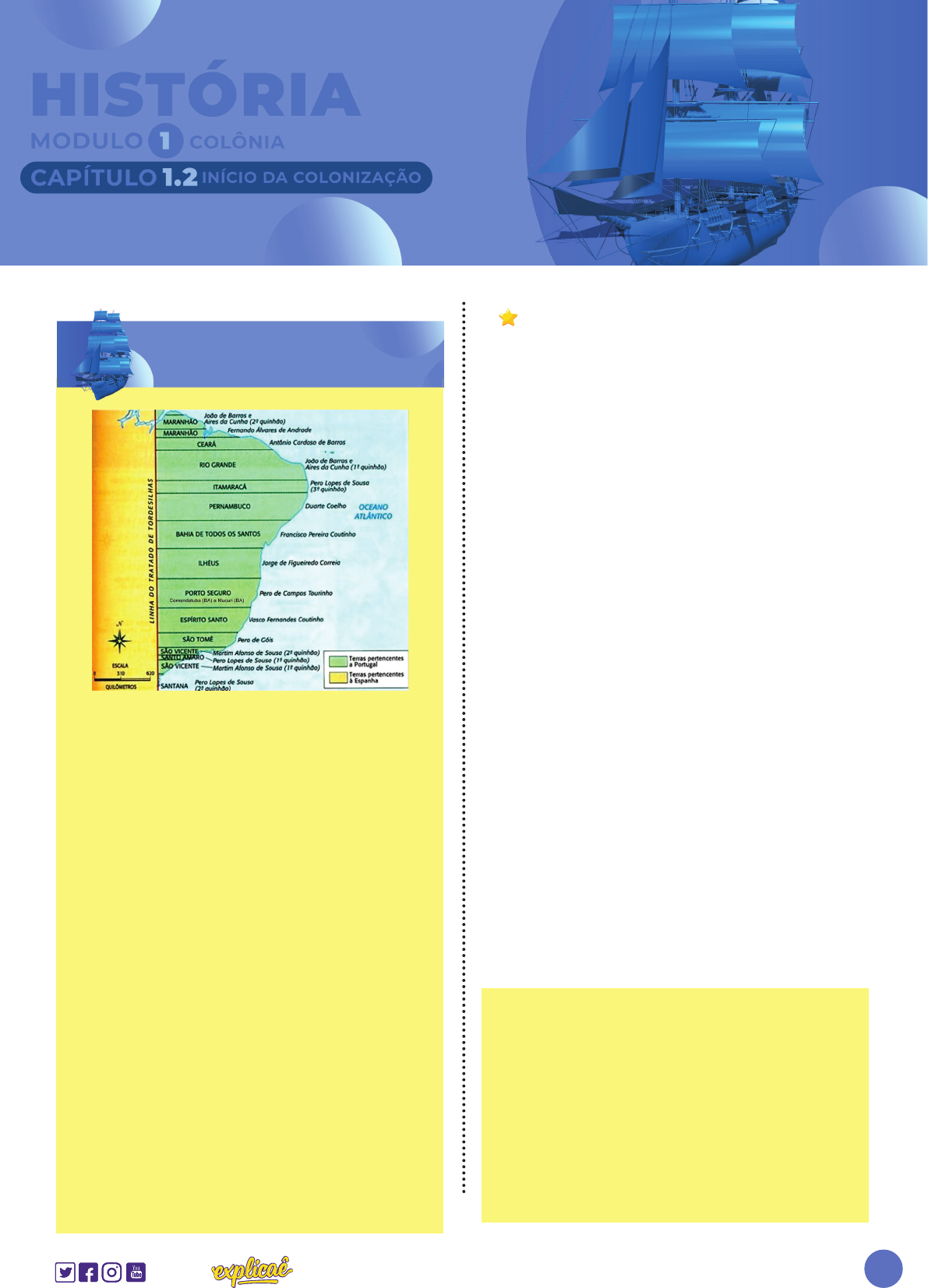 1EXPLICAEOFICIAL | .COM.BR 1EXPLICAEOFICIAL | .COM.BR AS CAPITANIAS HEREDITÁRIAS Em 1534, tomou-se a decisão de dividir a colônia em 14 capitanias hereditárias (os 15 lotes foram doados a 12 donatários), doadas a nobres portugueses que teriam a obrigação de povoar, proteger e desenvolver seus territórios. Para estimulá-los, D. João III concedeu amplos poderes aos donatários, fi cando o ônus da empreitada colonizadora por conta exclusiva dos benefi ciados. Existiam dois documentos básicos para regulamentar a relação entre os donatários e o governo português: A Carta de Doação, determinando a concessão da administração da terra e a sua localização; A Carta Foral, que estabelecia os direitos e deveres dos donatários. Entre os direitos dos donatários estavam: • Fundar vilas, conceder sesmarias, receber a redizima (1/10 das rendas que iriam para a Coroa) e a vintena (5% sobre o valor arrecadado com o pau-brasil e a pesca). • Poderiam cobrar tributos sobre salinas, moendas e engenhos. O sistema de capitanias hereditárias já havia sido implantado em outras colônias portuguesas (Açores, Cabo Verde e Ilhas Madeira) com relativo sucesso. A grande nobreza e a burguesia portuguesa não se interessaram pelo empreendimento, deixando-o à pequena nobreza. O sistema de capitanias não foi um sucesso porque os colonos não eram poderosos o sufi ciente para lutar contra os estrangeiros e os índios, além de não possuir em capital sufi ciente. As capitanias de São Vicente e Pernambuco foram as únicas consideradas prósperas. Mesmo assim, o sistema continuou a existir até fi ns do século XVIII. O GOVERNO GERAL Diante do fracasso das capitanias hereditárias, em 1549, a Coroa portuguesa decide implantar um governo central na colônia com medo da perda do território para os franceses e, após a notícia da descoberta da mina de Potosi, pelos espanhóis em 1545, a maior mina de prata do mundo na atual Bolívia. A capitania da Bahia foi comprada pela Coroa portuguesa e lá se estabeleceu o governo-geral, em paralelo ao poder dos donatários. Os governadores eram assessorados por três auxiliares: provedor- mor (tesoureiro), ouvidor-mor (juiz) e capitão-mor (defesa). • Tomé de Sousa (1549 – 1553) Com o primeiro governador geral, vieram os primeiros jesuítas, chefi ados por Manuel da Nóbrega. Dentre as principais realizações, destacamos a fundação de Salvador, criação do primeiro bispado. Além disso, realizou várias expedições ao longo do litoral e fi scalizou as capitanias hereditárias, o que resultou em atritos com vários donatários. • Duarte da Costa (1553 – 1558) Trouxe outros jesuítas, destacando José de Anchieta, que funda o Colégio de São Paulo, dando origem à cidade de São Paulo. Duarte da Costa procurou não entrar em atrito com donatários, mas acabou sendo hostilizado pelos jesuítas, pois permitia a escravidão de índios. No seu governo, os franceses invadem o Rio de Janeiro para fundar uma colônia (França Antártica). Esses franceses estavam fugindo das perseguições católicas em sua terra natal. • Mem de Sá (1558 -1572) Reata relações com os jesuítas e procurar expulsar os franceses do Rio de Janeiro com o auxílio do sobrinho, Estácio de Sá. A resistência dos franceses era muito grande, pois contavam com a ajuda da Confederação dos Tamoios (uma associação de índios que detestavam os portugueses). Os jesuítas convenceram os índios a deixarem de apoiar os franceses, o que favoreceu a expulsão dos huguenotes. OBS: Após a morte de Mem de Sá, o Brasil foi dividido em dois governos gerais: um no “Norte” (com capital em Salvador) e outro no “Sul” (com capital no Rio de Janeiro). As câmaras municipais: Outra esfera de poder na colônia que prevalece em todo o período colonial é o das câmaras municipais, que existiam apenas nas cidades mais importantes. Seus membros, os vereadores, eram constituídos pelos “homens bons”, grandes proprietários de escravos e terras. Em um momento posterior e em cidades mais mercantis, as câmaras foram ocupadas por grandes comerciantes. Eram importantes centros de poder e de decisão na colônia e algumas vezes se confrontavam com a Coroa. As câmaras só perdem o poder após o fi m da União Ibérica, quando foi criado o Conselho Ultramarino. 2 EXPLICAEOFICIAL | .COM.BR GEOGRAFIA - MÓDULO - 3 - FÍSICA - 3.4 - CLIMA 2 EXPLICAEOFICIAL | .COM.BR HISTÓRIA - MÓDULO - 1 - COLÔNIA - 1.2 - INÍCIO DA COLONIZAÇÃO AULAS 03 1. COLÔNIA 1.1. Pré-colonial e Início da Colonização APOSTILAS: 1 resumo + 10 questões EXERCÍCIOS ONLINE: 30 questões CAIU NO ENEM: 07 questões CAIU NA CONSULTEC + STRIX: 0 questões REVISÃO NA PLATAFORMA