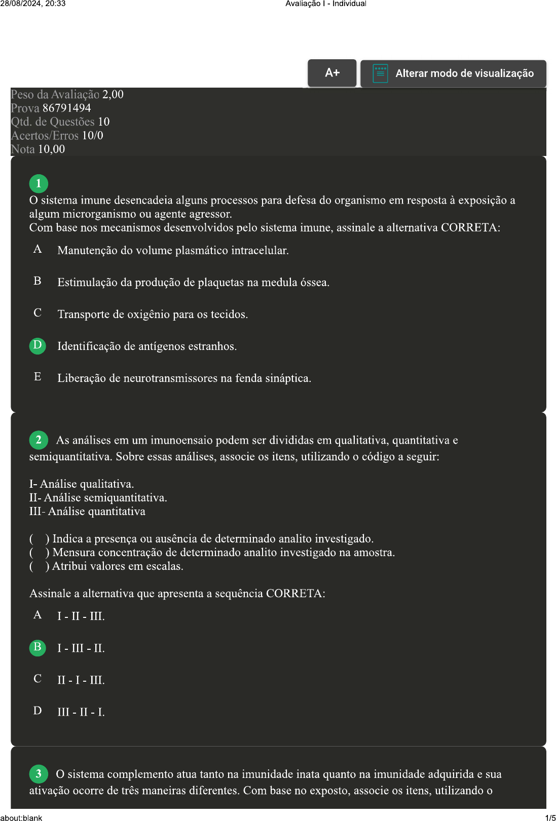<p>28/08/2024, 20:33 Avaliação - Individual A+ Alterar modo de visualização Peso da Avaliação 2,00 Prova 86791494 Qtd. de Questões 10 Acertos/Erros 10/0 Nota 10,00 1 O sistema imune desencadeia alguns processos para defesa do organismo em resposta à exposição a algum microrganismo ou agente agressor. Com base nos mecanismos desenvolvidos pelo sistema imune, assinale a alternativa CORRETA: A Manutenção do volume plasmático intracelular. B Estimulação da produção de plaquetas na medula C Transporte de oxigênio para os tecidos. D Identificação de antígenos estranhos. E Liberação de neurotransmissores na fenda sináptica. 2 As análises em um imunoensaio podem ser divididas em qualitativa, quantitativa e semiquantitativa. Sobre essas análises, associe os itens, utilizando código a seguir: I- Análise qualitativa. Análise semiquantitativa. Análise quantitativa ( ) Indica a presença ou ausência de determinado analito investigado. ( ) Mensura concentração de determinado analito investigado na amostra. ( ) Atribui valores em escalas. Assinale a alternativa que apresenta a sequência CORRETA: A I II III. B I - II. C II I III. D III - II - I. 3 O sistema complemento atua tanto na imunidade inata quanto na imunidade adquirida e sua ativação ocorre de três maneiras diferentes. Com base no exposto, associe os itens, utilizando about:blank 1/5</p><p>28/08/2024 20:33 Avaliação Individual código a seguir: Via clássica. II- Via das lecitinas. III- Via alternativa ( ) Essa via é ativada pela ligação da lecitina plasmática aos resíduos de manose localizados na superfície dos agentes agressores. ( ) A ativação dessa via ocorre na superfície da membrana do agente agressor. ( ) Ativação ocorre após a ligação de algumas classes de anticorpos aos antígenos presentes no agressor. Assinale a alternativa que apresenta a sequência CORRETA: A III II I B II - III - I. C I II III. D I - III II. 4 Os imunoensaios são técnicas para a detecção ou quantificação de antígenos ou anticorpos, podendo utilizar reagentes marcados ou não marcados. Cada uma dessas variações presentam vantagens e desvantagens, cabe ao profissional, com base em seus conhecimentos. fazer a escolha da melhor metodologia. Considerando as variações de imunoensiaos, avalie as asserções a seguir e a relação proposta entre elas: I. Quando a metodologia é do tipo que apresenta reagentes marcados, existe a adição de uma substância como um fluoróforo, ao reagente com intuito de aumentar a sensibilidade de detecção do ensaio. PORQUE II. A sensibilidade de um teste corresponde a menor concentração da ligação que imunoensaio é capaz de detectar. A respeito dessas assinale a opção correta: A A asserção I é uma proposição falsa e a II é uma proposição verdadeira. B As asserções I e II são falsas. C As asserções I e II são verdadeiras, mas a II não é uma justificativa correta da I. D As asserções I e II são verdadeiras, e a II é uma justificativa correta da I. E A asserção I é uma proposição verdadeira e a II é uma proposição falsa. 5 A estreptolisina O é uma exotoxina capaz de gerar prejuízo a uma célula hospedeira, produzida por Streptococcus pyogenes, está presente em qualquer manifestação clínica vinculada a infecções por estreptococos do grupo A, não se restringindo somente à febre reumática. about:blank 2/5</p><p>28/08/2024 20:33 Avaliação Individual Com base na técnica laboratorial utilizada para detecção da antiestreptolisina O, pensando no seu tipo de reação, assinale a alternativa CORRETA: A Imunoflorescência B Hemólise. C Hemaglutinação. D Aglutinação em látex. E Floculação. 6 As técnicas que determinam as respostas imunes de anticorpos, antígenos são denominados ensaios imunológicos ou imunoensaios. Esses ensaios que apresentam como base características imunológicas são muito importantes para diagnóstico laboratorial, como para diagnóstico de doenças infecciosas, por exemplo. Considerando princípios básicos da interação antígeno e anticorpo e dos imunoensaios, avalie as asserções a seguir e a relação proposta entre elas: I. A base destes testes se dá de modo que identificamos a presença de antígenos ou anticorpos em uma amostra utilizando reagentes contendo em seus componentes antígenos ou anticorpos. PORQUE II. Na reação antígeno anticorpo é específica e não possui interferentes ou reações cruzadas. A respeito dessas assinale a opção correta: A As asserções I e II são falsas. B A asserção I é uma proposição falsa e a II é uma proposição verdadeira. C As asserções I e II são verdadeiras, mas a II não é uma justificativa correta da I. D A asserção I é uma proposição verdadeira e a II é uma proposição falsa. E As asserções I e II são verdadeiras, e a II é uma justificativa correta da I. 7 [Laboratório Virtual Tipagem sanguínea] A determinação correta do tipo sanguíneo de doadores e pacientes é essencial para a transfusão segura de sangue e hemoderivados ou para transplante seguro de órgãos e tecidos. A tipagem sanguínea consiste no uso de reagentes ou dispositivos altamente regulados, padronizados e específicos para cada tipo de sangue nos testes com amostras de sangue. A respeito da metodologia utilizada para realização da tipagem sanguínea, analise as afirmativas a seguir: I- A prova direta é realizada em tubo de ensaio, em que a positividade para antígeno se dá quando observado a formação de um "grumo" no fundo do tubo II- O reagente A é uma solução contendo anticorpos contra antígeno A. Se as hemácias possuírem esse antígeno, na prova direta, é observado a aglutinação do sangue. III- O reagente anti-D é utilizado para avaliar a positividade ou negatividade para fator Rh. Assinale a alternativa CORRETA: A As afirmativas I e II estão corretas about:blank 3/5</p><p>28/08/2024, 20:33 Avaliação Individual B Somente a afirmati