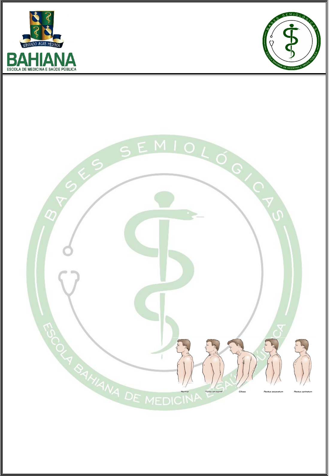 <p>MONITORIA DE BASES SEMIOLÓGICAS</p><p>- Guia de Habilidades -</p><p>EXAME RESPIRATÓRIO</p><p>Introdução</p><p>1) O exame do aparelho respiratório consiste</p><p>em uma avaliação dos pulmões, assim como</p><p>do tórax. Para isso, deverá ser realizada:</p><p>inspeção, palpação, percussão e ausculta. 1</p><p>2) Para a realização do exame, o paciente</p><p>deverá:</p><p>• No exame do tórax anterior, estar sentado</p><p>ou em decúbito dorsal;</p><p>• No exame do tórax posterior, estar</p><p>sentado com os braços cruzados em frente</p><p>ao tórax.</p><p> Caso não seja possível colocá-lo nessas</p><p>posições, vire o paciente para um lado</p><p>e, em seguida, para o outro. 2</p><p>3) Em pacientes homens, a roupa deverá ser</p><p>removida até a cintura. Caso seja mulher,</p><p>atentar para a exposição desnecessária,</p><p>expondo, gradualmente, as regiões a serem</p><p>examinadas. 2</p><p>Exame Físico</p><p>I. INSPEÇÃO</p><p>A inspeção do exame físico respiratório é</p><p>dividida em duas etapas: inspeção estática e</p><p>dinâmica.</p><p>Inspeção estática:</p><p>1) Formato do tórax:</p><p>• Normal: o tórax, no adulto normal, é mais</p><p>largo do que profundo. Seu diâmetro</p><p>lateral é maior que o diâmetro</p><p>anteroposterior. 2</p><p>• Plano ou chato: parede anteroposterior</p><p>sem sua concavidade normal. 3</p><p>• Tonel ou barril: aumento do diâmetro</p><p>anteroposterior com horizontalização dos</p><p>arcos costais. Pode ser perceptível em</p><p>pacientes com DPOC. 3</p><p>• Escavado, em funil, infundibuliforme ou</p><p>pectus exacavatum: é caracterizado por</p><p>uma depressão na porção inferior do</p><p>esterno e região epigástrica. É uma</p><p>anormalidade congênita. 3</p><p>• Cariniforme, tórax de pombo ou pectus</p><p>carinatum: é caracterizado por um</p><p>esterno proeminente e costelas</p><p>horizontalizadas. É uma anormalidade que</p><p>pode ser de origem congênita ou</p><p>adquirida. 3</p><p>• Cifótico: caracterizado por uma curvatura</p><p>da coluna dorsal, formando uma</p><p>gibosidade. 3</p><p>• Escoliótico: caracterizado por um desvio</p><p>da coluna para o lado (escoliose). 3</p><p>• Cifoescolótico: apresenta, além da cifose,</p><p>uma escoliose. 3</p><p>Figura 1. Configurações torácicas comuns</p><p>Swartz, 2015.</p><p>2) Assimetrias;</p><p>3) Deformidades;</p><p>4) Lesões e cicatrizes;</p><p>5) Disposição da traqueia;</p><p>6) Extremidades:</p><p>2</p><p>• Presença de cianose: avaliar pele, unhas,</p><p>lábios e mucosas. 3</p><p>• Hipocratismo digital: perda do ângulo</p><p>entre as unhas e as falanges distais. 1</p><p> É característico de doenças como</p><p>neoplasias torácicas e doença</p><p>pulmonar crônica. 1</p><p> Outros nomes usuais: unhas em vidro</p><p>de relógio e dedos em baqueta de</p><p>tambor ou baqueteamento digital.</p><p> Teste da janela de Schamroth</p><p>7) Posição do paciente: 1</p><p>• Utilização da ancoragem;</p><p> O paciente se apoia para facilitar sua</p><p>respiração.</p><p> É comum em pacientes com doença</p><p>obstrutiva.</p><p>• Ortopneico: dificuldade respirar deitado,</p><p>fazendo uso, normalmente, de muitos</p><p>travesseiros.</p><p>Inspeção dinâmica:</p><p>1) Frequência respiratória, no adulto:</p><p>• Eupneia: 10/12 a 20 inc/min</p><p>• Bradipneia: < 10 inc/min</p><p>• Taquipneia: > 20 inc/min</p><p>2) Tipo respiratório:</p><p>• Torácico ou costal: tipo respiratório</p><p>normal em pé ou sentado. 3</p><p>• Abdominal ou diafragmática: tipo</p><p>respiratório fisiológico em decúbito</p><p>dorsal. 3</p><p>• Misto.</p><p>3) Ritmo respiratório:</p><p>Normal</p><p>Caracterizado por tempo de inspiração e</p><p>expiração bem parecidos. 3</p><p>Suspirosa</p><p>Movimentos respiratórios normais</p><p>interrompidos por “suspiros” isolados ou</p><p>agrupados. 3</p><p>Bradipneia</p><p>Aumento do intervalo entre o ciclo de</p><p>inspiração e expiração. 3</p><p>Taquipneia</p><p>Diminuição do intervalo entre o ciclo de</p><p>inspiração e expiração. 3</p><p>Cheyne-Stokes</p><p>Caracterizado por fase de apneia seguida de</p><p>incursões respiratórias de amplitude crescente</p><p>que chega a um pico e decresce, retornando a</p><p>fase de apneia. 3</p><p>• É característico da Insuficiência cardíaca</p><p>congestiva, TCE, AVE e Hipertensão</p><p>intracraniana.</p><p>Biot</p><p>É o ritmo respiratório em que há uma</p><p>anarquia de movimentos inspiratórios e</p><p>expiratórios, seguidos de apneia. 3</p><p>Kussmaul</p><p>Caracteriza-se por inspirações rápidas e</p><p>amplas, intercaladas com curtos períodos de</p><p>apneia e expirações profundas e ruidosas. 3</p><p>• É o padrão respiratório característico da</p><p>cetoacidose diabética.</p><p>https://revista.spdv.com.pt/index.php/spdv/article/download/330/303/</p><p>http://newbp.bmj.com/topics/pt-br/623</p><p>https://uploads.metropoles.com/wp-content/uploads/2019/12/06204131/arte-dedos.jpg</p><p>https://www.youtube.com/watch?v=p7MM2SMnNZQ</p><p>https://www.youtube.com/watch?v=REeIL9a0_PM</p><p>https://www.youtube.com/watch?v=TG0vpKae3Js</p><p>https://www.youtube.com/watch?v=p7MM2SMnNZQ</p><p>https://www.youtube.com/watch?v=REeIL9a0_PM</p><p>https://www.youtube.com/watch?v=TG0vpKae3Js</p><p>3</p><p>4) Uso da musculatura acessória.</p><p>• Músculos intercostais</p><p>(tiragem intercostal).</p><p>• M. ECOM e M. Trapézio</p><p>(retração supraclavicular).</p><p> São perceptíveis na asma grave, DPOC</p><p>ou obstrução das vias aéreas</p><p>superiores. 2</p><p>5) Retrações anormais</p><p>• Respiração paradoxal, em gangorra, em</p><p>serrote (Sinal de Hoover): assincronia</p><p>entre a respiração torácica e abdominal. 3</p><p> Tórax instável: fraturas em dois ou</p><p>mais pontos em arcos costais</p><p>adjacentes, normalmente decorrente</p><p>de traumas de alta energia no tórax.</p><p>II. PALP