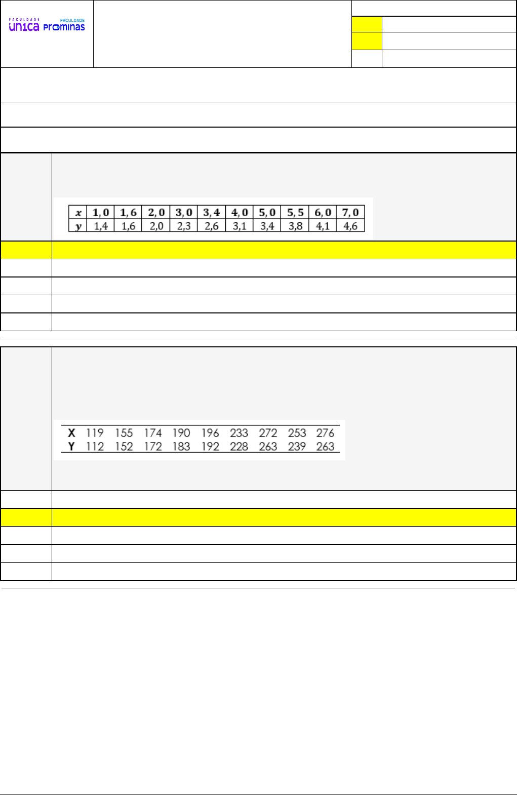 <p>Pincel Atômico - 03/09/2024 09:40:11 1/4</p><p>ANTONIETA PEREIRA</p><p>PINTO AQUINO</p><p>Exercício Caminho do Conhecimento - Etapa 6 (17862)</p><p>Atividade finalizada em 27/08/2024 08:03:54 (2562885 / 1)</p><p>LEGENDA</p><p>Resposta correta na questão</p><p># Resposta correta - Questão Anulada</p><p>X Resposta selecionada pelo Aluno</p><p>Disciplina:</p><p>PRÁTICA PEDAGÓGICA INTERDISCIPLINAR: FÍSICA EXPERIMENTAL [1051942] - Avaliação com 8 questões, com o peso total de 1,67 pontos</p><p>[capítulos - 3]</p><p>Turma:</p><p>Segunda Graduação: Segunda Graduação 6 meses - Licenciatura em Física - Grupo: FPD-FEVEREIRO/2024 - SGegu0A190224 [115779]</p><p>Aluno(a):</p><p>91575564 - ANTONIETA PEREIRA PINTO AQUINO - Respondeu 6 questões corretas, obtendo um total de 1,25 pontos como nota</p><p>[357410_8860</p><p>8]</p><p>Questão</p><p>001</p><p>(DPF-UFV - Adaptada) A partir da seguinte tabela de dados, obtenha y como uma</p><p>função linear de x usando o método de regressão linear. Determine o valor dos</p><p>coeficientes angular e linear da reta através das equações (10) e (11), com n=10:</p><p>X y = 0,54x + 0,82y</p><p>x = 0,82 + 0,54</p><p>x = 0,82y + 0,54</p><p>y = 0,82x + 0,54</p><p>x = 0,54y + 0,82</p><p>[357410_8861</p><p>0]</p><p>Questão</p><p>002</p><p>(MORETTIN; 2017 - adaptado) A mensuração exata (Y) de uma substância do sangue,</p><p>por meio de uma análise química, é muito cara. Um novo método mais barato resulta</p><p>na medida X, que supostamente pode ser usada para prever o valor de Y. Nove</p><p>amostras de sangue foram obtidas e avaliadas pelos dois métodos, obtendo-se as</p><p>medidas abaixo:</p><p>Faça o gráfico dos pontos e estime via regressão linear o coeficiente angular da reta.</p><p>O valor mais próximo do obtido é</p><p>a = 0,86</p><p>X a = 0,95</p><p>a = 0,02</p><p>a = 4,69</p><p>a = 3,55</p><p>Pincel Atômico - 03/09/2024 09:40:11 2/4</p><p>[357410_8470</p><p>6]</p><p>Questão</p><p>003</p><p>Em uma experiência para se calcular a densidade de uma substância, um</p><p>experimentador plota os dados referentes a massa e ao respectivo volume da mesma.</p><p>A figura abaixo ilustra o gráfico obtido pelo experimentador.</p><p>Sabendo que o valor da densidade é o quociente entre a massa e o volume, o</p><p>experimentador calcula o coeficiente angular, que exprime a taxa de variação da</p><p>variável dependente y em relação à variável independente x. O valor da densidade da</p><p>substância encontrado pelo experimentador é</p><p>0,5g/cm3</p><p>1g/cm3</p><p>4g/cm3</p><p>8g/cm3</p><p>X 2g/cm3</p><p>[357411_8470</p><p>7]</p><p>Questão</p><p>004</p><p>Nem sempre vamos encontrar funções lineares na física. Porém quando se observa</p><p>que o gráfico obtido não é uma reta, pode-se linearizá-lo através de uma mudança de</p><p>variáveis. O processo de transformar um gráfico curvo em uma reta denomina-se</p><p>linearização. A linearização em geral consiste em aplicar o logaritmo em ambos lados</p><p>da equação e usar as propriedades de logaritmo log(ab) = log(a) + log(b) e log(an) =</p><p>nlog(a)</p><p>Suponha que fazendo uma medida de duas grandezas, observamos que a relação</p><p>entre as duas é dada por uma equação do tipo potência:</p><p>y=kxn</p><p>A linearização para essa equação é adequadamente representada por</p><p>log(y)=log(k) + nlog(x)</p><p>log(y) = log(n) + klog(x)</p><p>log(x)=log(k) + nlog(y)</p><p>X log(y)=log(k) - nlog(x)</p><p>log(x)=log(n) + klog(y)</p><p>Pincel Atômico - 03/09/2024 09:40:11 3/4</p><p>[357410_1464</p><p>70]</p><p>Questão</p><p>005</p><p>(DPF UFV – adaptado) Em um laboratório de pesquisa avançada na área de novos</p><p>materiais, e utilizando-se os equipamentos adequados, os cientistas veri-ficaram como</p><p>o comprimento (L) de uma barra cilíndrica, feita de uma superli-ga metálica</p><p>recentemente descoberta, variava de uma forma inesperada em função da</p><p>temperatura (T). Foi obtida a seguinte tabela após as medidas.</p><p>Observando o comportamento do gráfico da tabela de dados, se espera uma relação</p><p>de qual tipo para essas grandezas?</p><p>Logarítmica.</p><p>Polinomial de 3° grau.</p><p>Exponencial.</p><p>X Polinomial de 2° grau.</p><p>Linear.</p><p>[357412_8471</p><p>0]</p><p>Questão</p><p>006</p><p>Considere 5 tipos diferentes de solutos. Cada tipo possui uma quantidade de soluto</p><p>por frasco, e necessita de uma certa quantidade de solvente para diluição. Os dados</p><p>são ilustrados na tabela abaixo</p><p>Considerando que Y é a quantidade de solvente (ml) e X é a quantidade de soluto</p><p>(mg), Indique o coeficiente linear para esse caso.</p><p>40 mg</p><p>-400 ml</p><p>28 ml</p><p>-400 mg</p><p>X 40 ml</p><p>[357411_8470</p><p>9]</p><p>Questão</p><p>007</p><p>A relação linear é a dependência funcional mais simples entre duas variáveis. Assinale</p><p>o significado correto do coeficiente linear e do coeficiente angular, respectivamente,</p><p>para essa relação linear</p><p>o coeficiente linear indica a interseção da reta com o eixo x; já coeficiente angular</p><p>exprime a taxa de variação da variável dependente y em relação à variável</p><p>independente x.</p><p>o coeficiente angular indica a interseção da reta com o eixo y; já coeficiente linear</p><p>exprime a taxa de variação da variável dependente y em relação à variável</p><p>independente x.</p><p>o coeficiente angular indica a interseção da reta com o eixo x; já coeficiente linear</p><p>exprime a tangente do ângulo formado pela reta com o eixo horizontal.</p><p>X</p><p>o coeficiente linear indica a interseção da reta com o eixo y; já coeficiente angular</p><p>exprime a taxa de variação da variável dependente y em relação à variável</p><p>independente x.</p><p>o coeficiente angular indica a interseção da reta com o eixo y; já coeficiente linear</p><p>exprime a tangente do ângulo formado pela reta com o eixo horizon